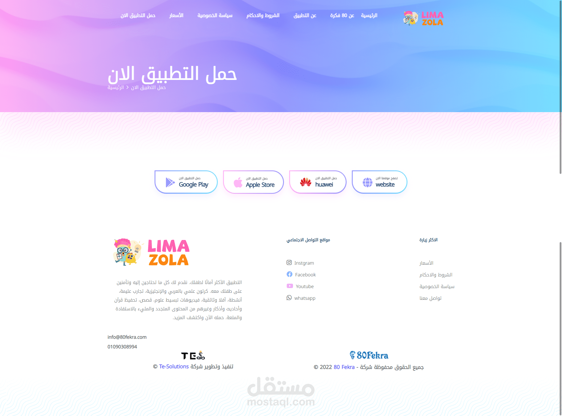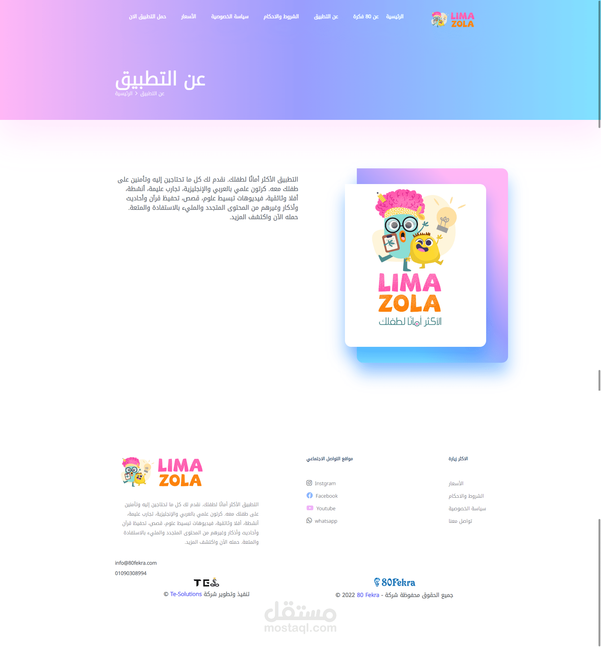 تم تصميم وتطوير موقع Lima & Zola باستخدام Angular لتوفير منصة تعليمية تفاعلية وآمنة للأطفال. الموقع يُقدّم محتوى متنوّع مثل حلقات كرتون علمي بالعربية والإنجليزية، قصص وتجارب علمية، أعمال وثائقية، نشاطات ترفيهية وتثقيفية، فضلاً عن تحفيظ قرآن وأحاديث وأذكار.