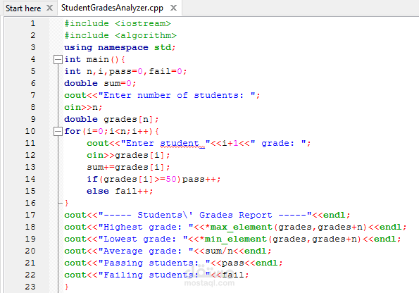 A C++ console program that analyzes student grades using arrays. The user enters the number of students and their marks, and the program calculates: ( Highest score - Lowest score - Average - Number of passing students - Number of failing students). The project demonstrates use of arrays, loops, conditional statements, and basic statistical calculations. Screenshots include the full code and a sample program output.