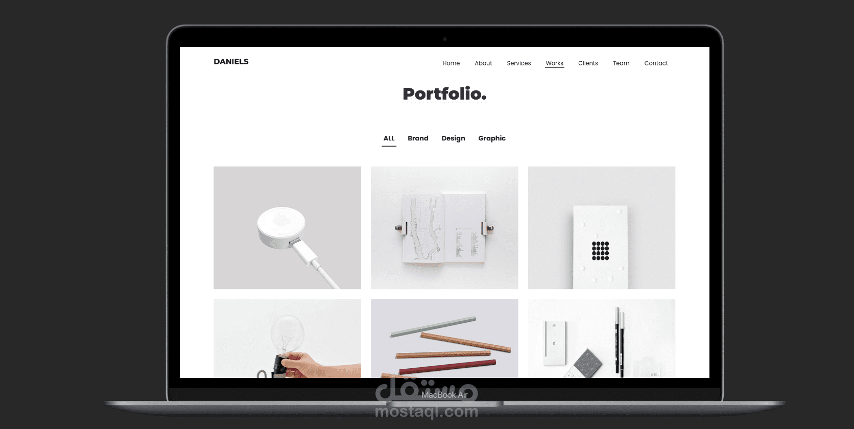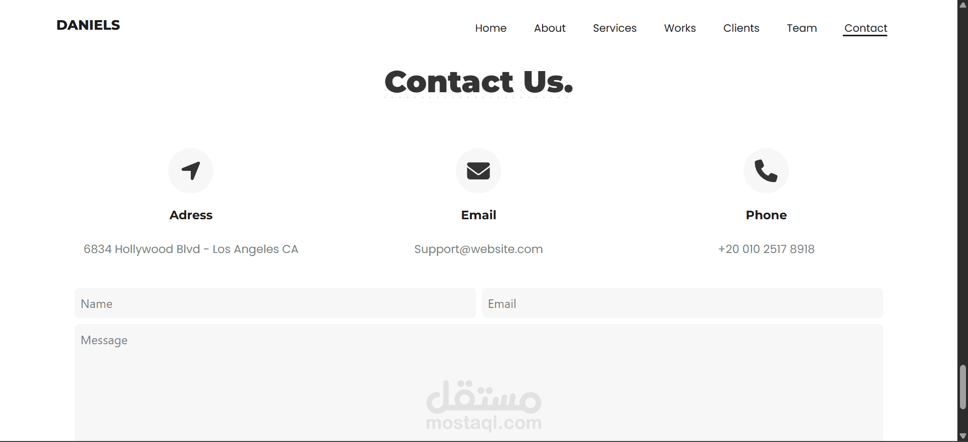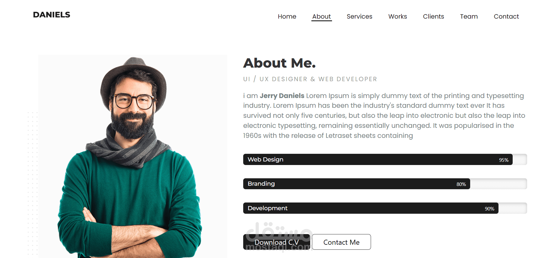 portfolio page مكونة من 6 صفحات وهي ال about وفيها نبذه بسيطة عن صاحب الموقع و مهاراته , services وفيها كل الخدمات التي يقدمها صاحب الصفحة , works و فيها اعمال مشابهة لما يقدمه صاحب الموقع, clients العملاء السابقين الذين تعامل معهم صاحب الموقع, واخيرا ال team and contact للتعرف علي المشاركين في تقديم الخدمة و اخيرا معلومات التواصل