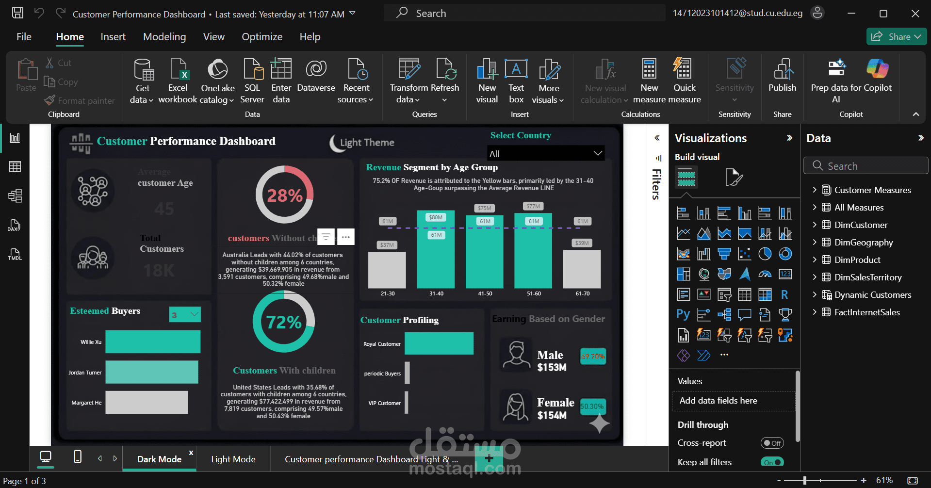 تقدّم لوحة مؤشرات أداء العملاء (Customer Performance Dashboard) المطوّرة باستخدام Power BI تحليلاً معمّقاً لبيانات تضم 18,000 عميل، بهدف مساعدة الإدارة على فهم خصائص العملاء وسلوكهم وربحيتهم بطريقة تفاعلية ومرئية واضحة.