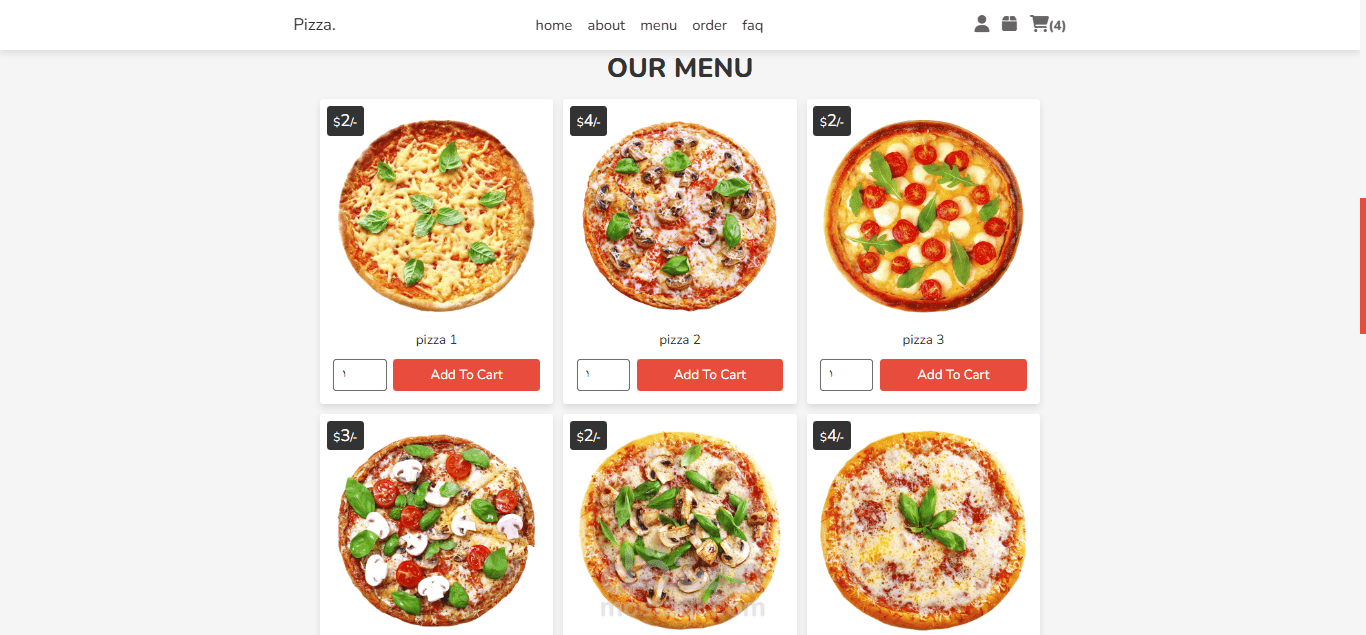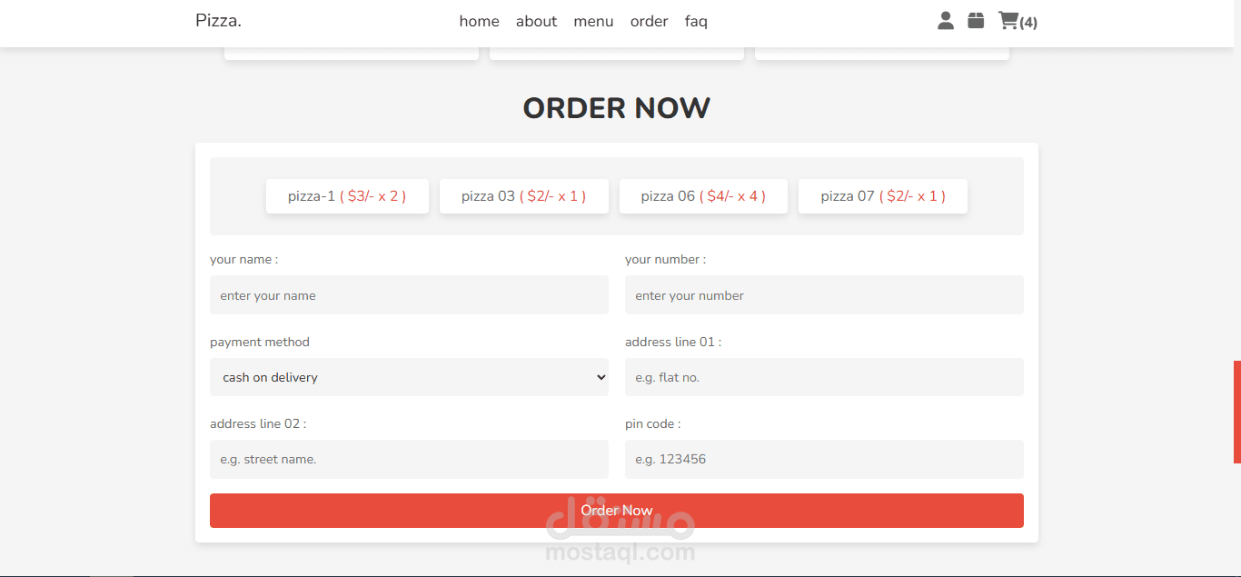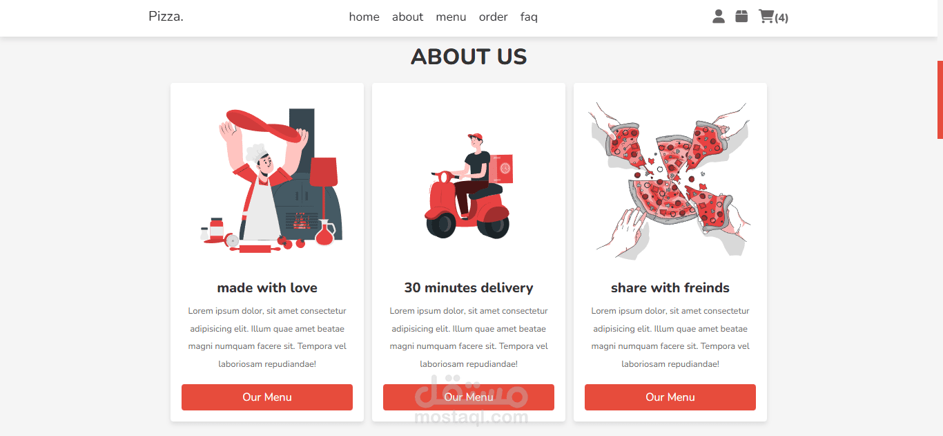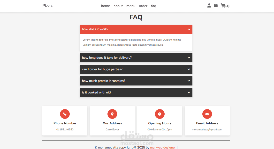 تصميم وتنفيذ موقع مطعم بيتزا بسيط وجذاب يحتوي على صفحة رئيسية، قائمة الطعام، وقسم تواصل.