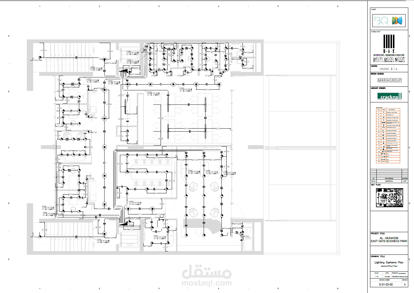 مشروع تصميم كهربائي كامل لمبنى، يشمل تطوير LOD & LOG، إعداد مخططات البيان والـ Legend Plans، وتجهيز رسومات تنفيذية احترافية لأنظمة الإنارة والقوى.