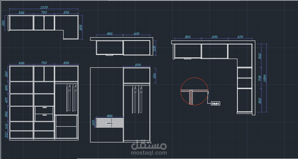 تصميم دريسينغ احترافي على AutoCAD، مع مخطط واجهات مفصّل يُظهر تقسيم الرفوف، مساحات تعليق الملابس، الأدراج، والأبواب المنزلقة. يشمل تحديد دقيق للأبعاد وتوزيع داخلي واضح يساعد على التنفيذ الواقعي بدقة عالية."
