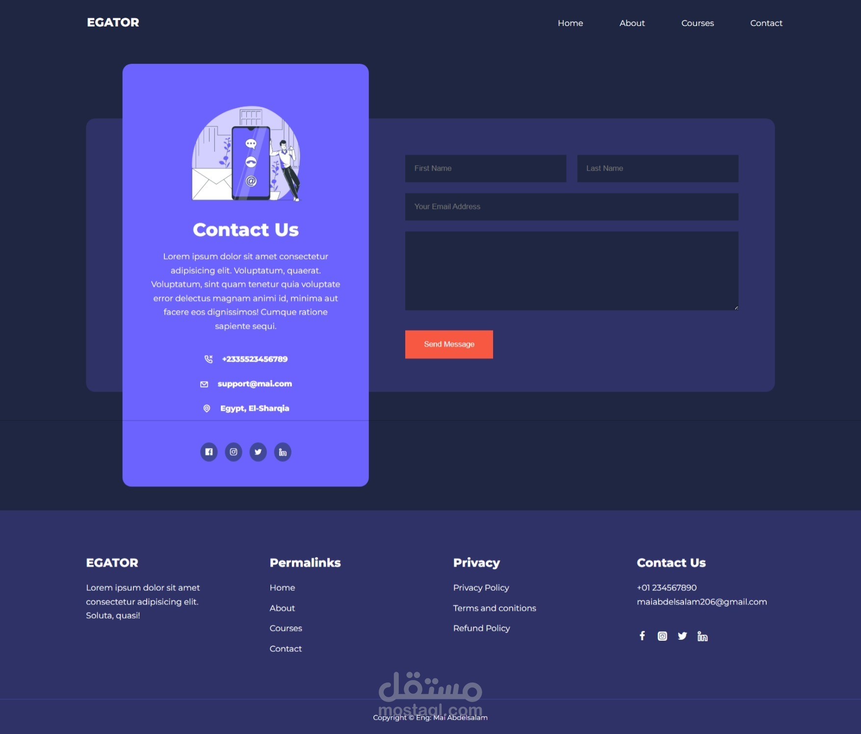 Contact Page: نموذج تواصل بسيط وفعّال مع وسائل تواصل مباشرة.