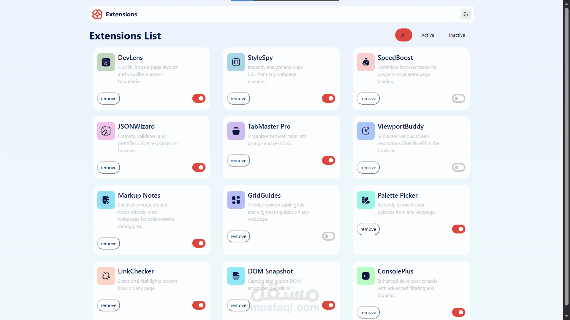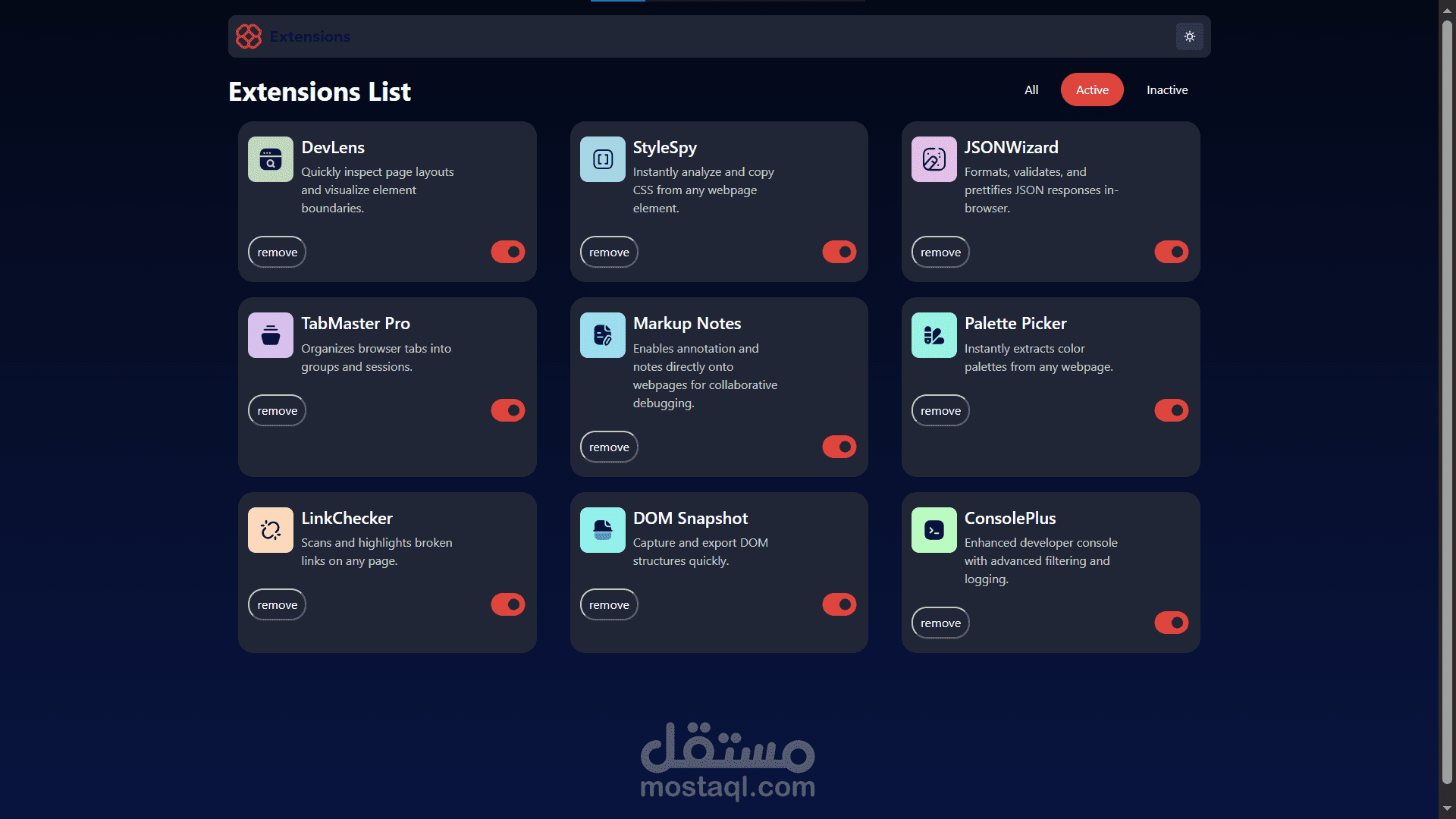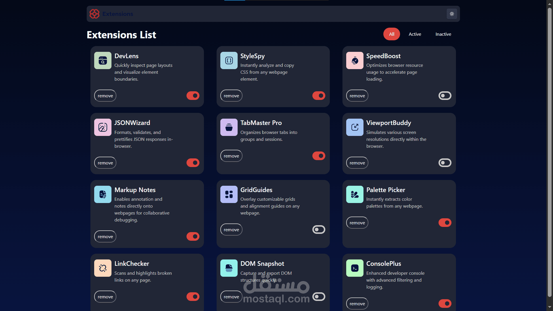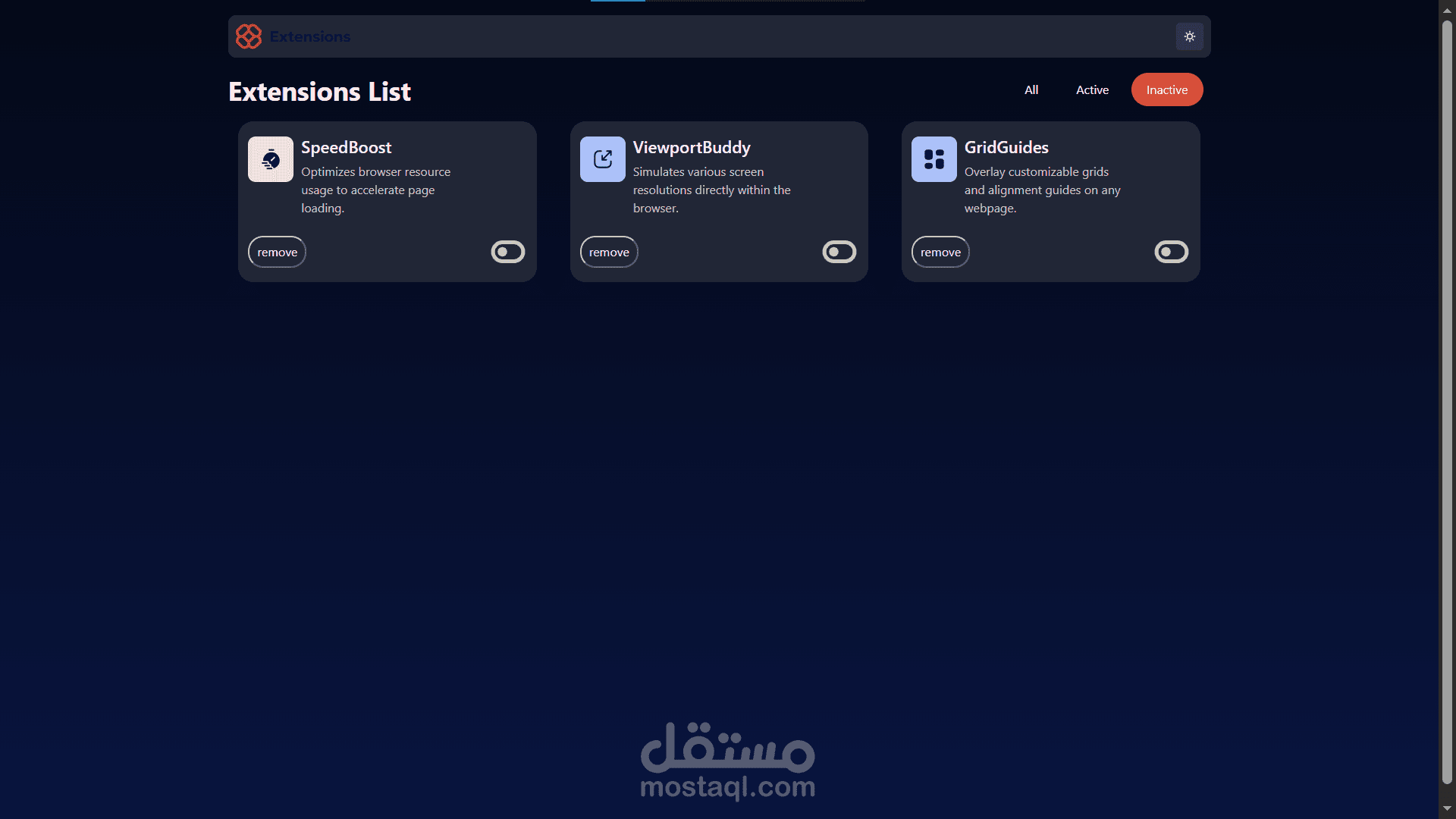 مشروع Browser Extensions Manager UI هو واجهة ويب تفاعلية لإدارة إضافات المتصفح (Extensions).