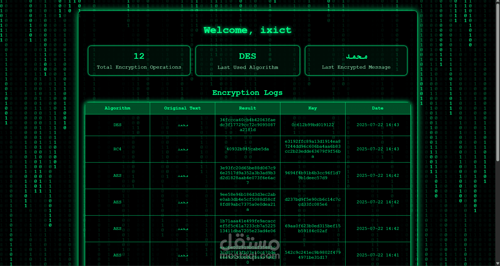 يسرّنا أن نُقدم لكم نظامًا متكاملًا لتأمين البيانات يدمج بين تشفير الرسائل ولوحة تحكم ذكية لتحليل النشاط – كل ذلك ضمن واجهة سهلة الاستخدام وعالية الأمان.