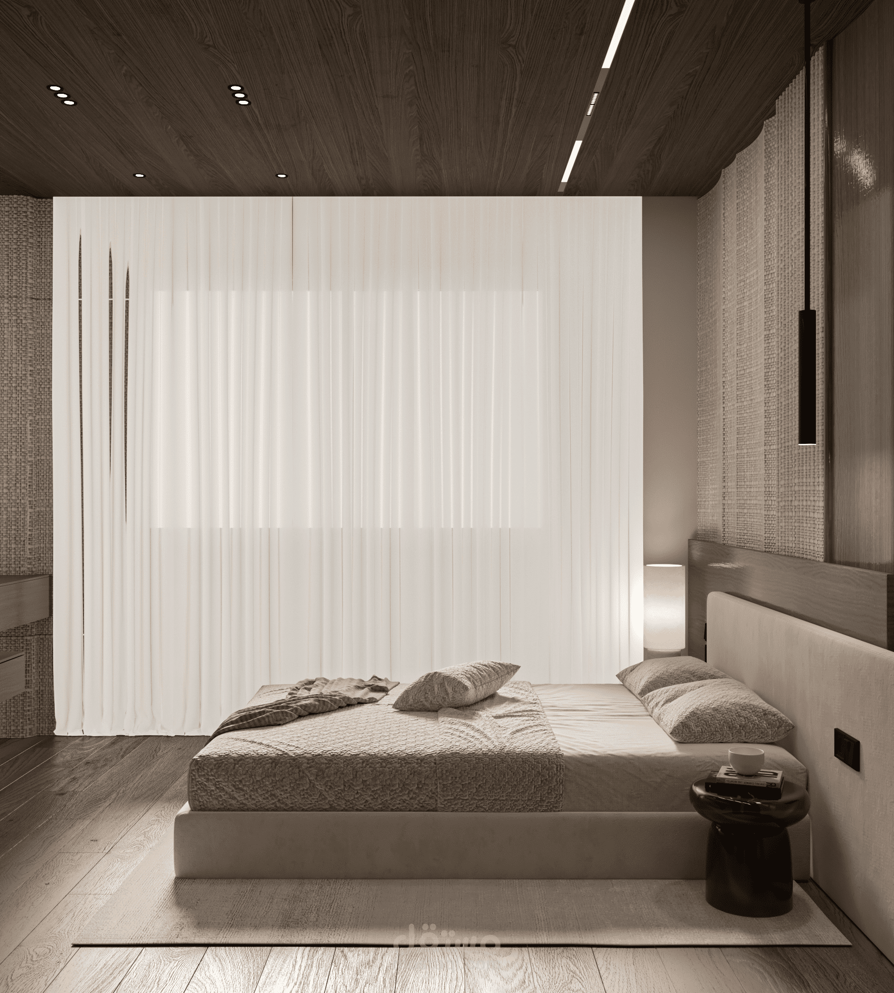 تصميم غرفة نوم عصرية تعتمد على فلسفة الهدوء والبساطة مع لمسات فاخرة تمنح المساحة طابعًا دافئًا ومريحًا. تم اختيار لوحة ألوان محايدة نابضة بالدفء، تجمع بين درجات البيج والخشب الطبيعي، لخلق أجواء نوم مريحة تدعو للاسترخاء.
