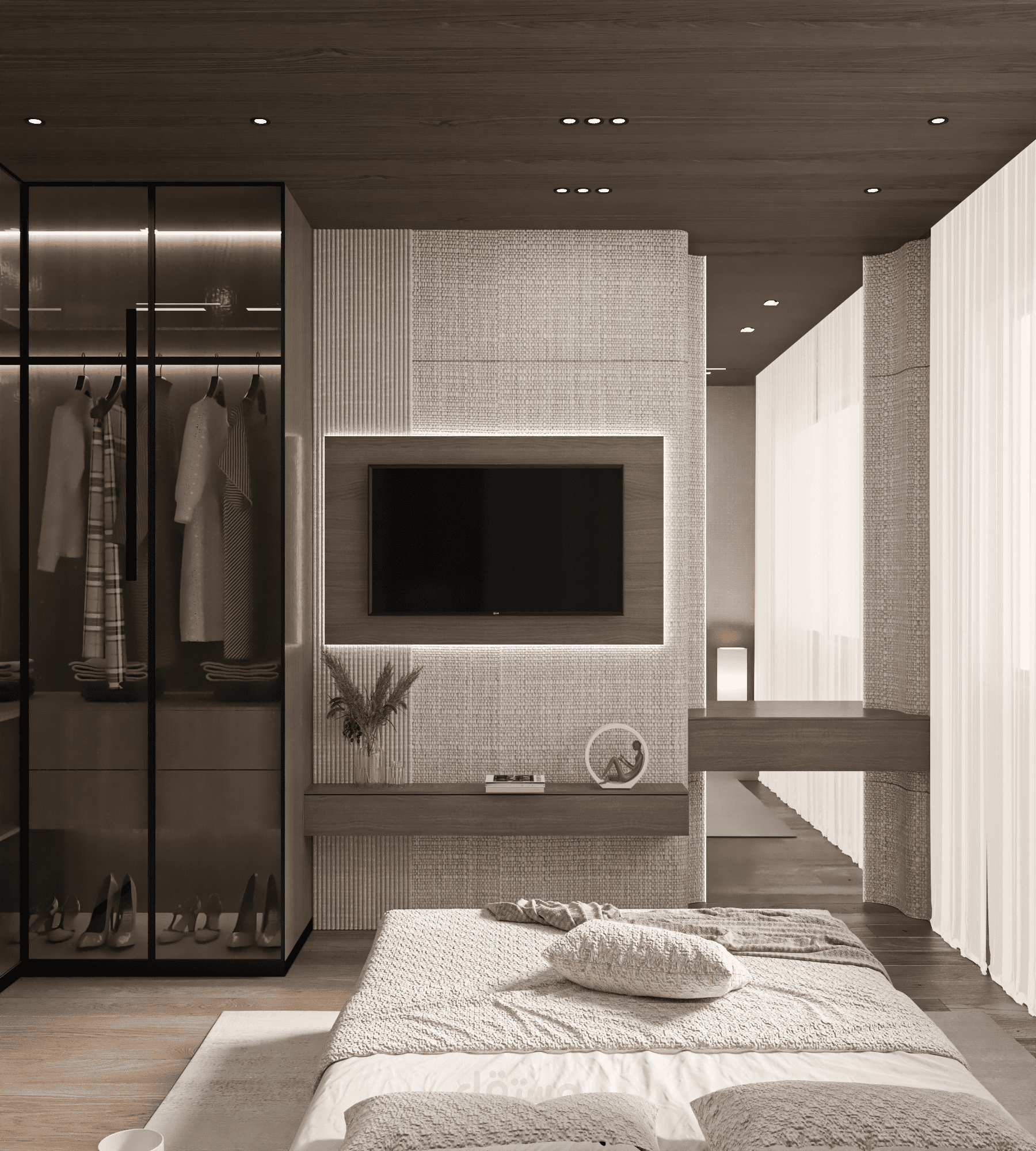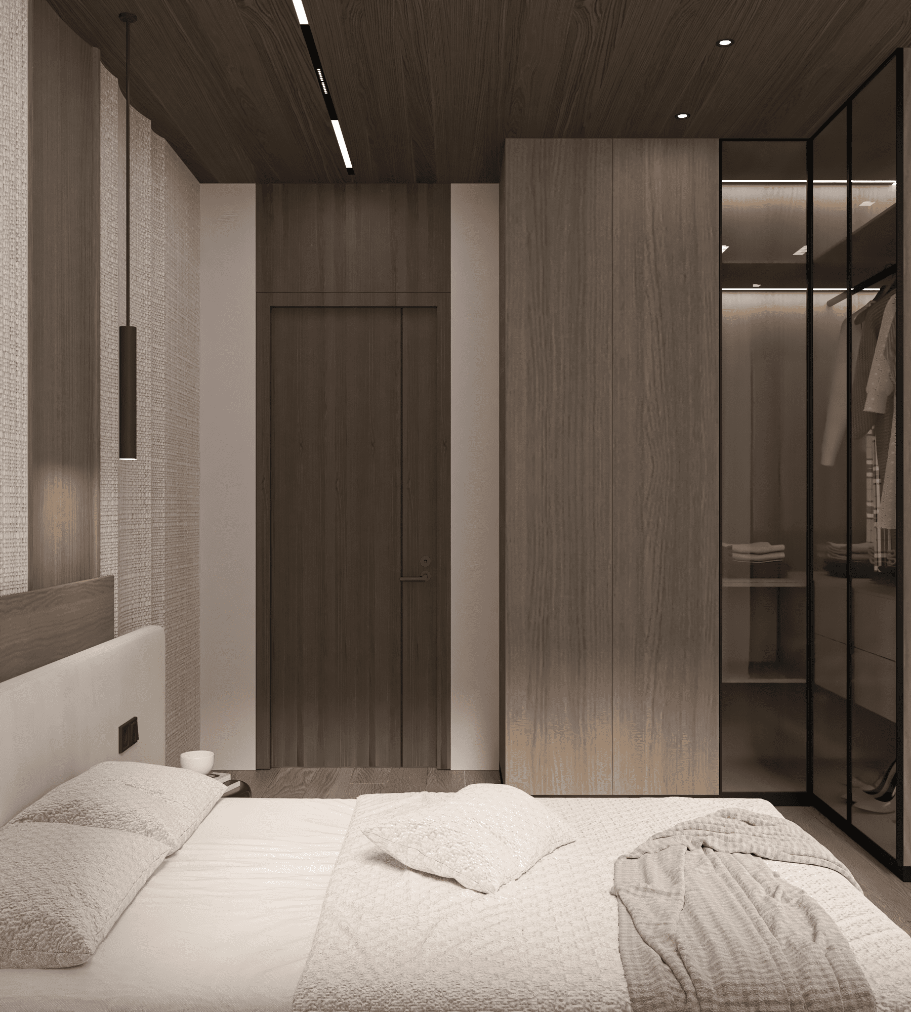 يتميز الحائط الخلفي للسرير بمعالجة جدارية مبتكرة تعتمد على تنويع الملمس بين الألواح الخشبية والتجسيمات الهادئة، مما يضيف عمقًا بصريًا ويحول الجدار إلى عنصر فني متكامل. أما السرير، فتم تصميمه بمظهر بسيط ونظيف ينسجم مع السجاد الناعم وأقمشة المفروشات الدافئة.