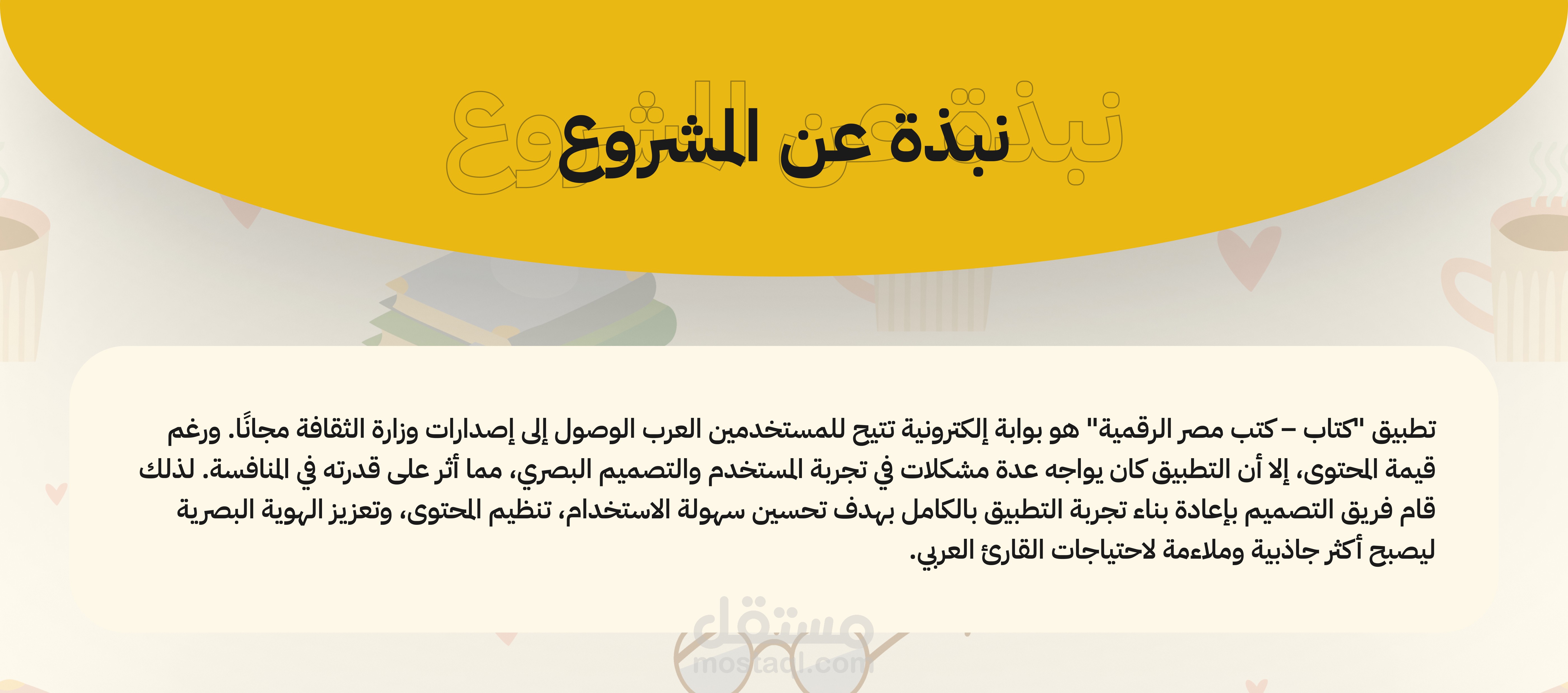 مشروع Redesign the Digital Egypt Book App هو إعادة تصميم تطبيق مكتبة رقمية مخصص للكتب المصرية، يهدف إلى تحسين تجربة المستخدم من خلال واجهة حديثة وسلسة. التصميم تم باستخدام Figma، ويركز على مبادئ UI/UX وخلق نظام تصميم (Design System)