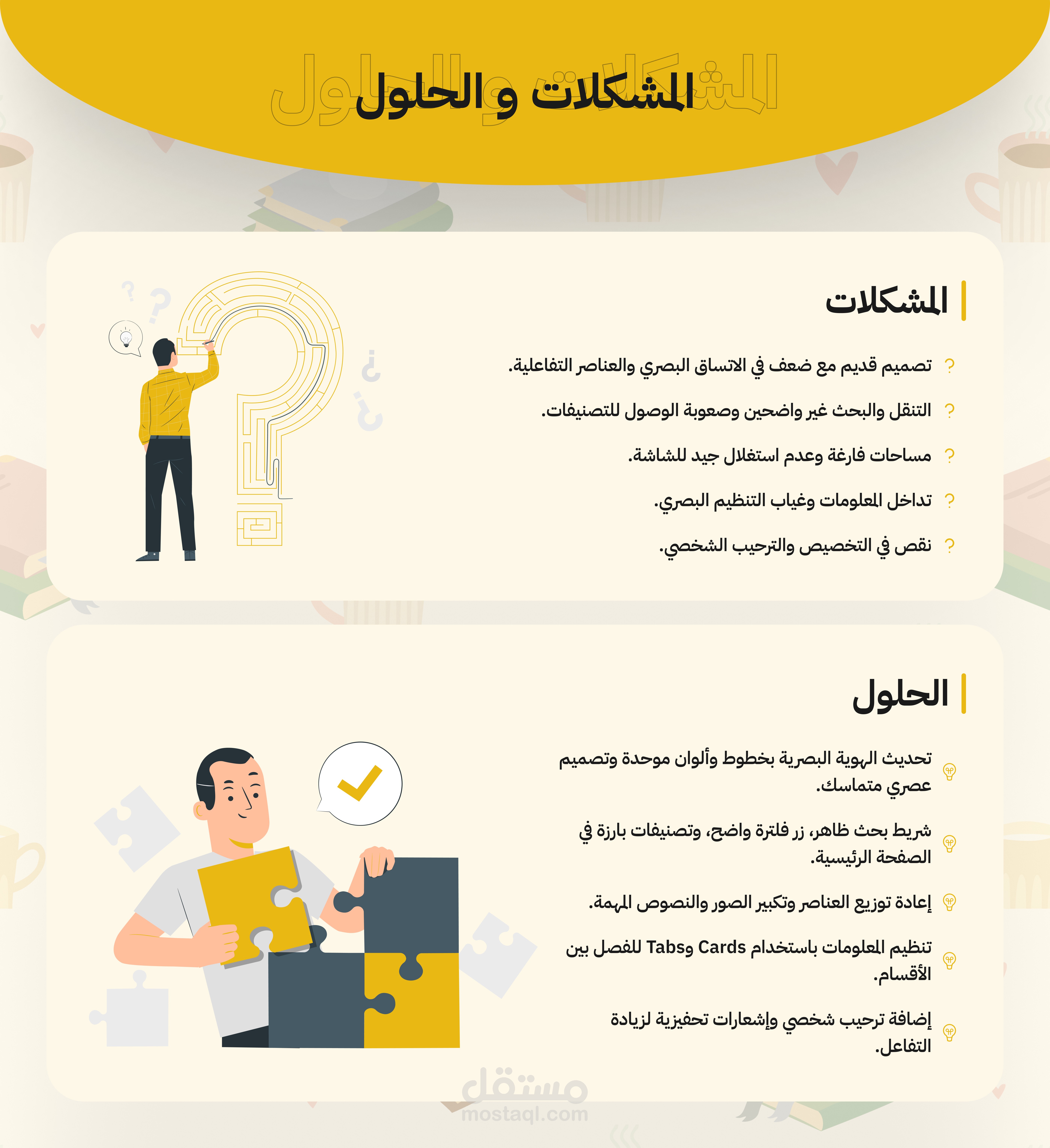 في المشروع، تم تحليل تجربة المستخدم الحالية وإعادة تنظيم تدفق المحتوى ليكون أكثر وضوحًا وسهولة في التنقل بين الفئات المختلفة من الكتب. كما تم الاهتمام بتصميم شاشات قراءة مريحة تُمكّن المستخدم من التصفح، إضافة للملاحظات والإشارات المرجعية بطريقة بسيطة وسهلة الاستخدام.