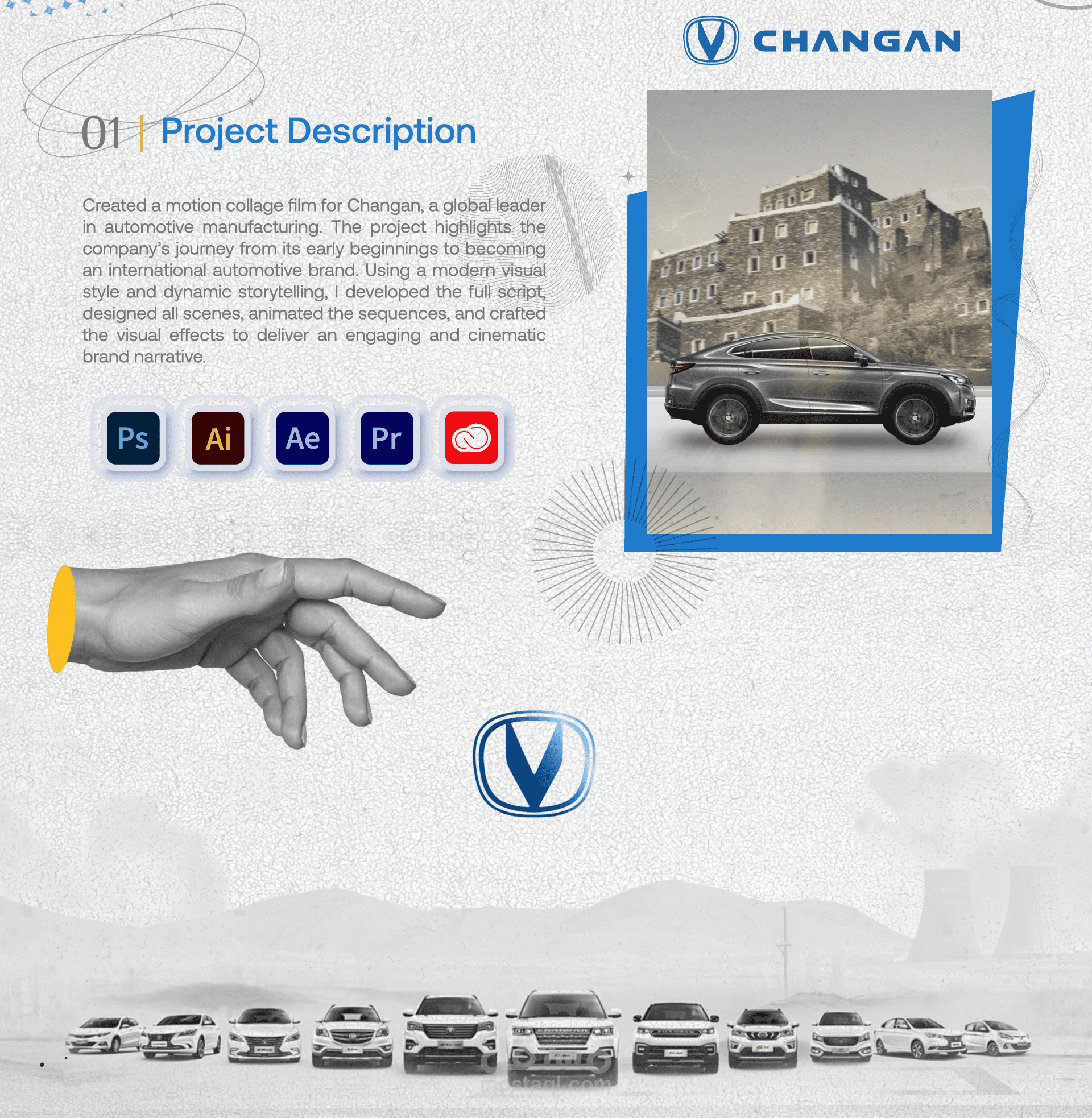 Created a motion collage film for Changan, a global leader in automotive manufacturing. The project highlights the company’s journey from its early beginnings to becoming an international automotive brand. Using a modern visual style and dynamic storytelling, I developed the full script, designed all scenes, animated the sequences, and crafted the visual effects to deliver an engaging and cinematic brand narrative. Production House ERM.