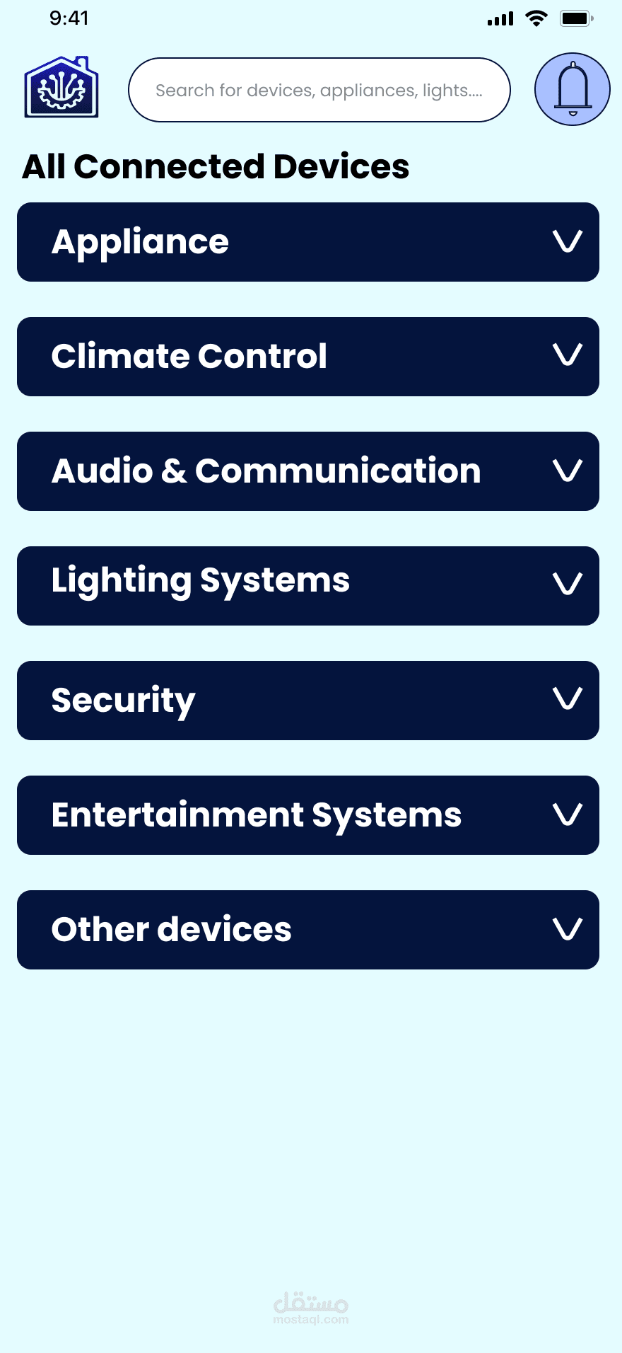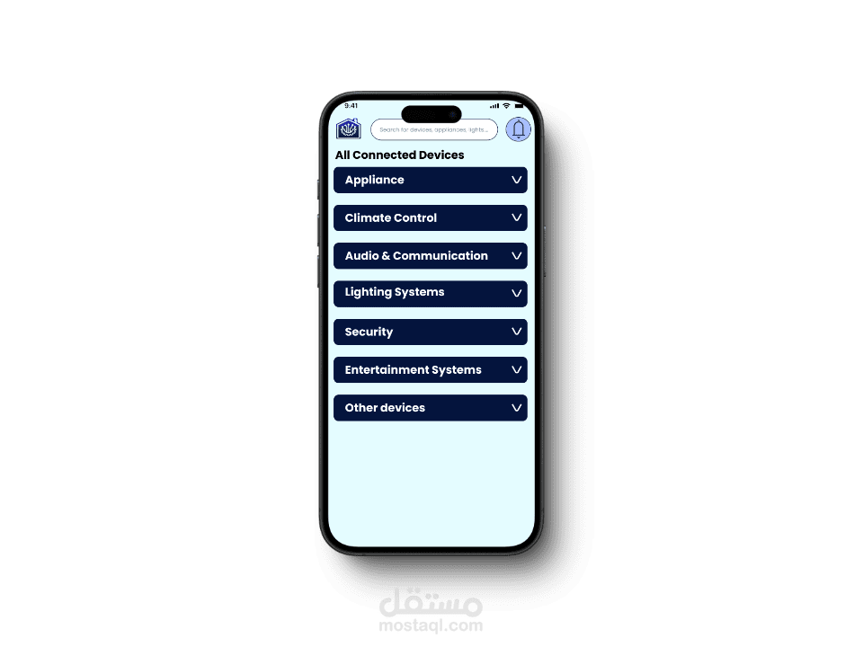 صفحات مخصصة للأجهزة الذكية مثل الإضاءة، التكييف، الأمان، الكاميرات، الأقفال، وغيرها.