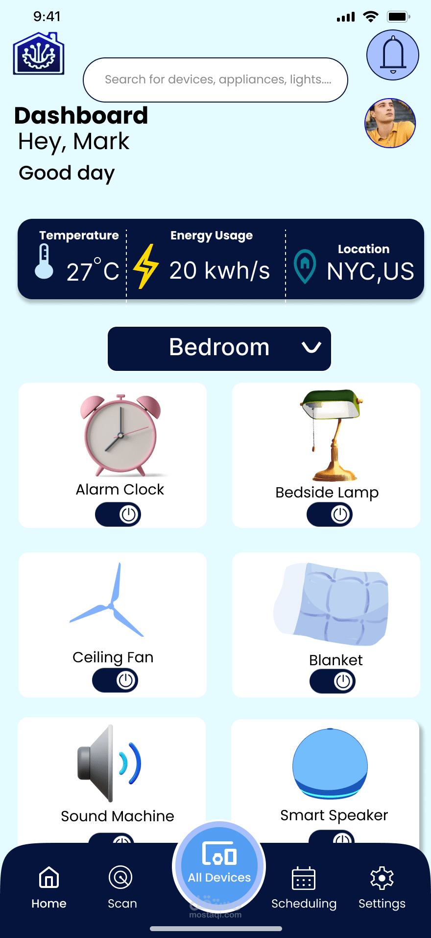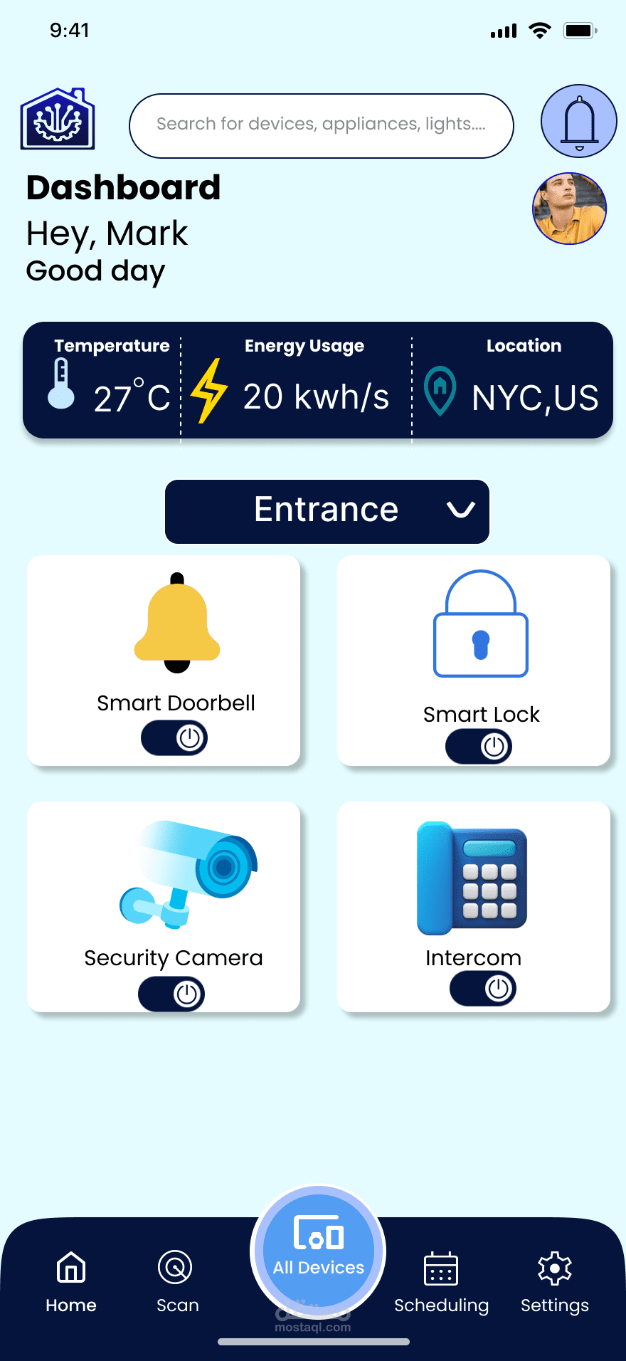 لوحة تحكم رئيسية (Dashboard) تعرض حالة الأجهزة، الإشعارات، والتحكم السريع.