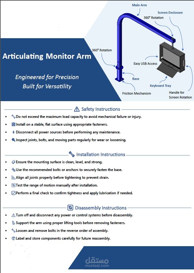 تم تصميم الذراع ليُركب على الأسطح المستوية بثبات كامل، كما يضم آلية احتكاك تمنح حركة سلسة دون اهتزاز. يأتي مع حامل شاشة قابل للدوران وقاعدة قوية، بالإضافة إلى رف لوحة مفاتيح مدمج وسهولة في الوصول لمنافذ USB، مما يجعله مثاليًا لغرف التحكم.