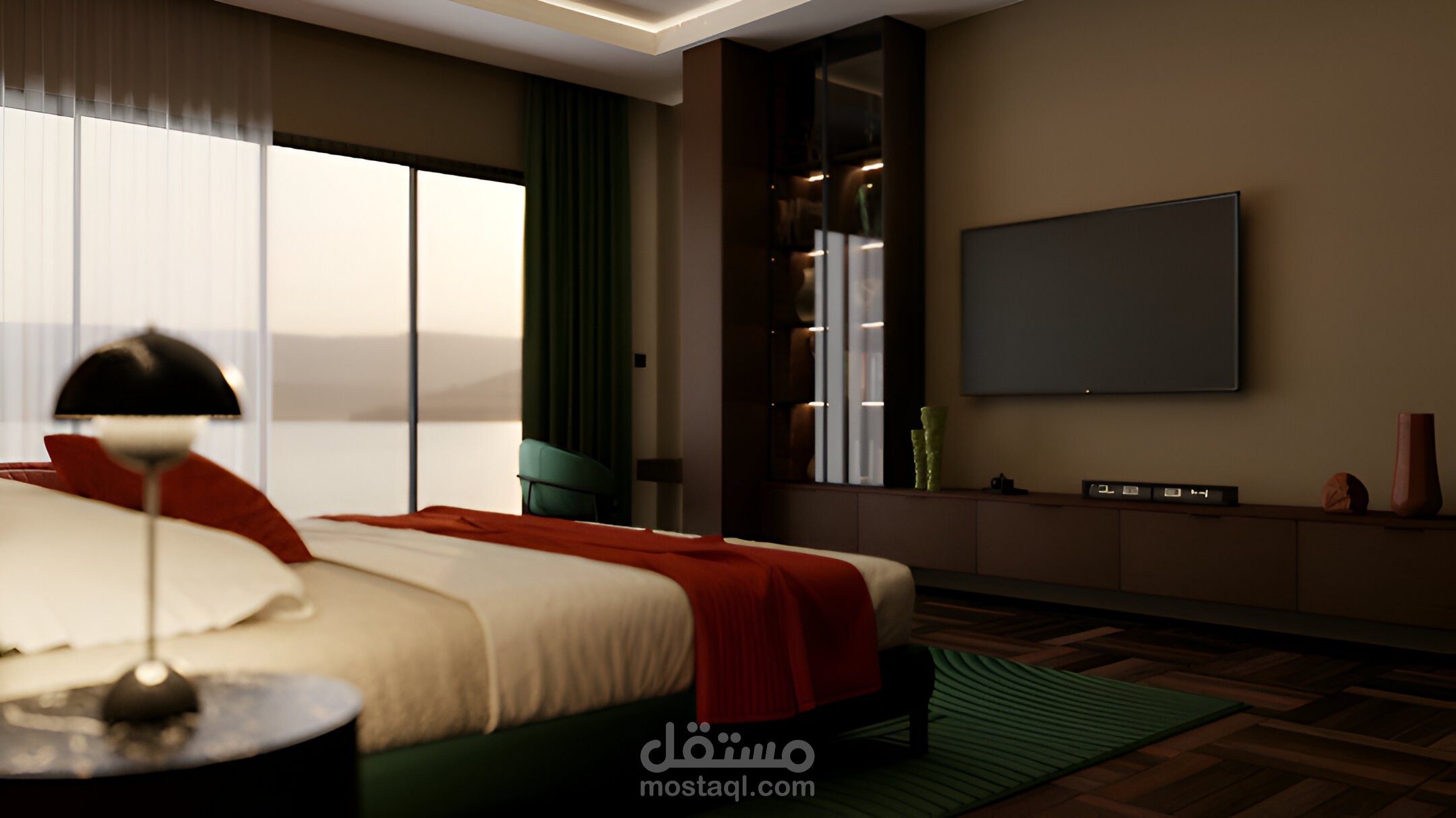 هذا العمل عبارة عن تصميم داخلي لغرفة نوم عصرية تم تنفيذها باستخدام تقنيات النمذجة ثلاثية الأبعاد والإظهار الواقعي.