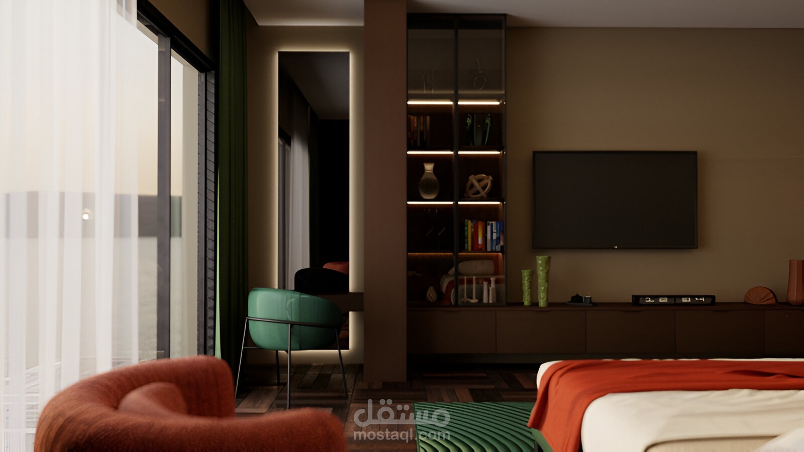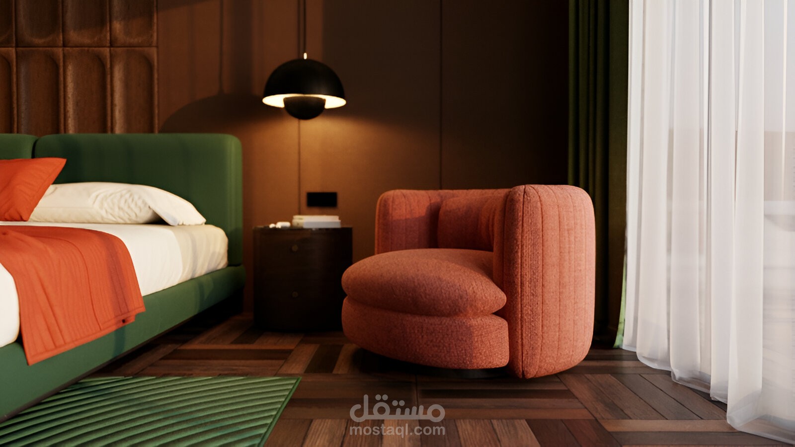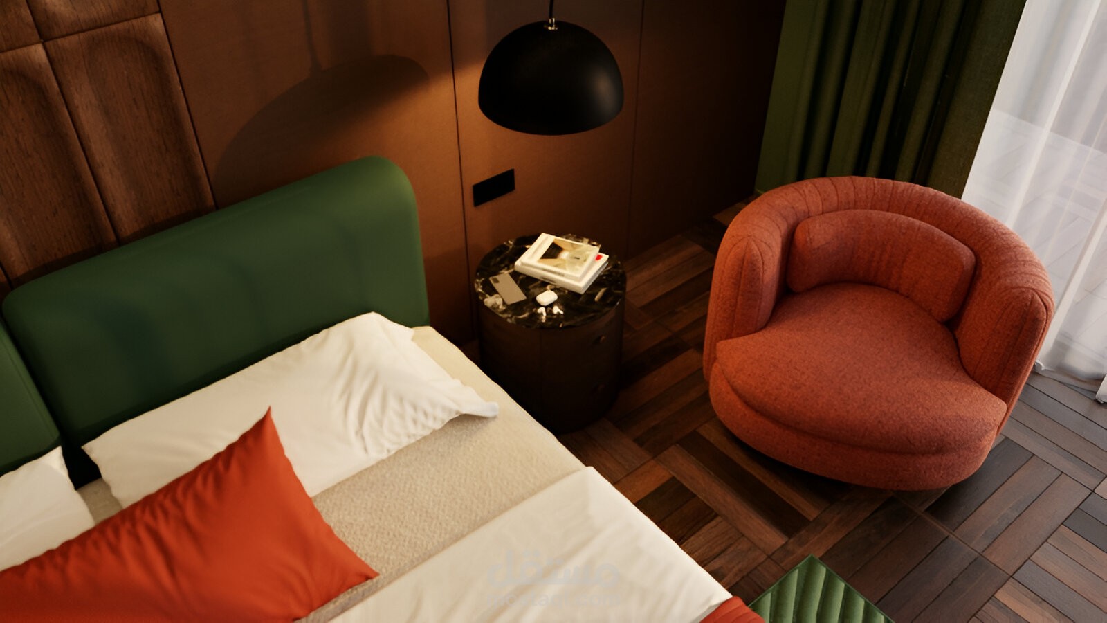 المشهد بالكامل قائم على تكوين بصري متوازن يبرز السرير كنقطة محورية، مع انسجام بين الألوان: الأخضر، البرتقالي، والدرجات الترابية.