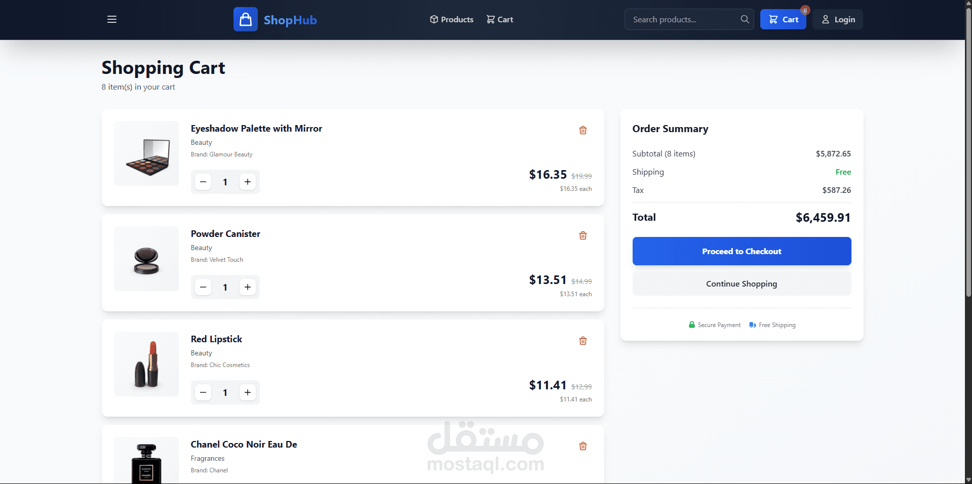 ShopHub هو موقع تجارة إلكترونية متكامل وعصري مبني بأحدث تقنيات تطوير الويب. الموقع يوفر تجربة تسوق سلسة واحترافية مع تصميم أنيق وسريع الاستجابة.