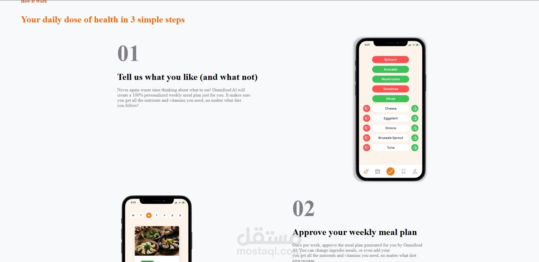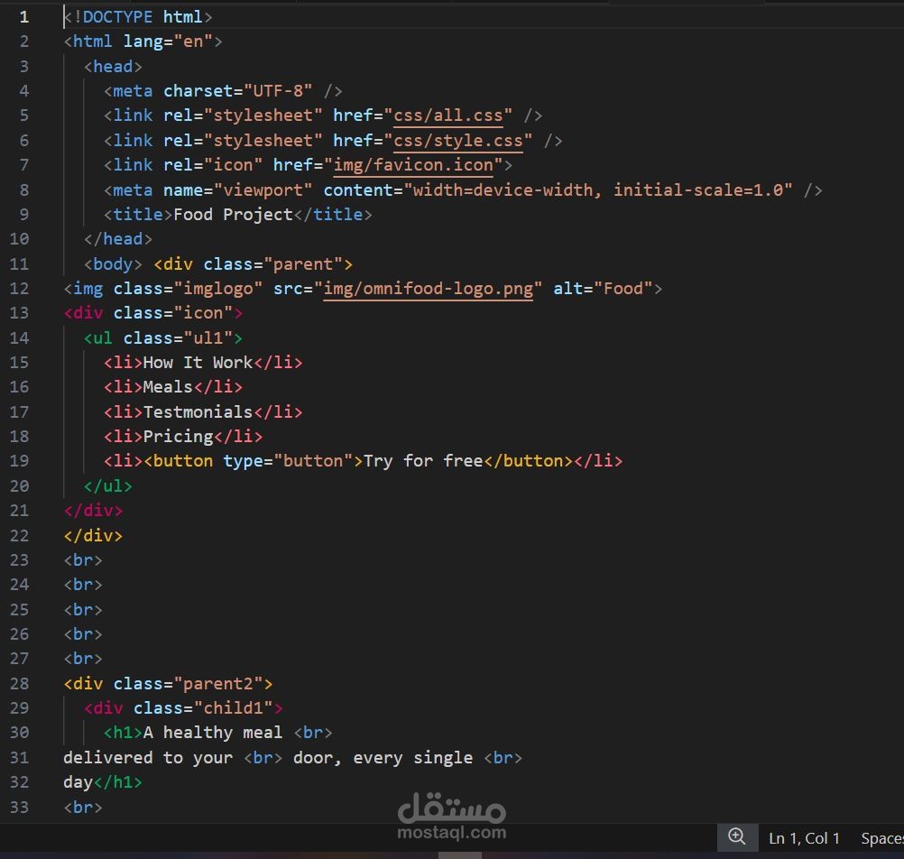 قمت بتصميم وتطوير صفحة ويب كاملة باسم Omnifood، وهي صفحة مخصصة لعرض خدمة توصيل الوجبات الصحية بطريقة جذابة وعصرية.