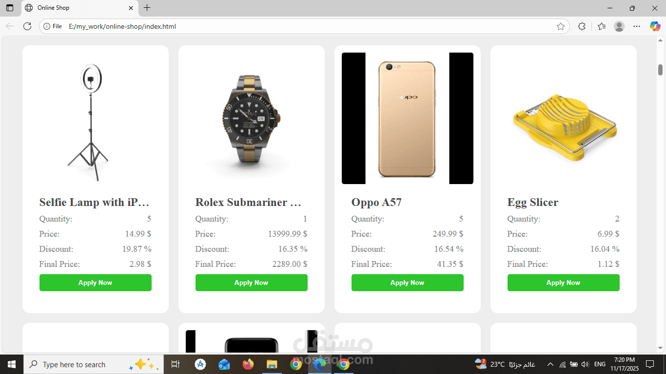 قمت بتطوير موقع متجر إلكتروني بسيط وحديث يعتمد على HTML5 و CSS3 و JavaScript (Vanilla JS)، مع استخدام API خارجي لجلب بيانات المنتجات وعرضها داخل الموقع بشكل ديناميكي.