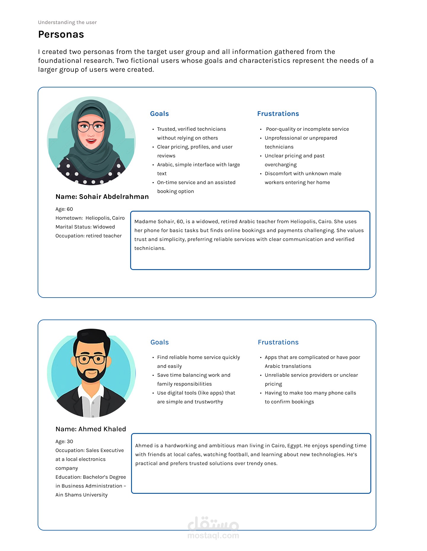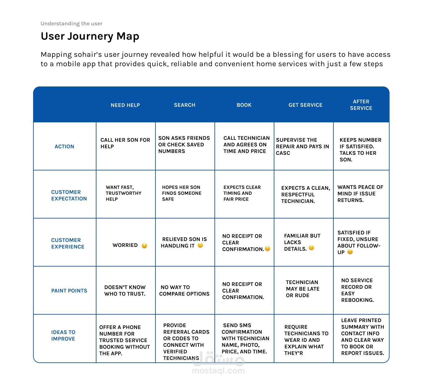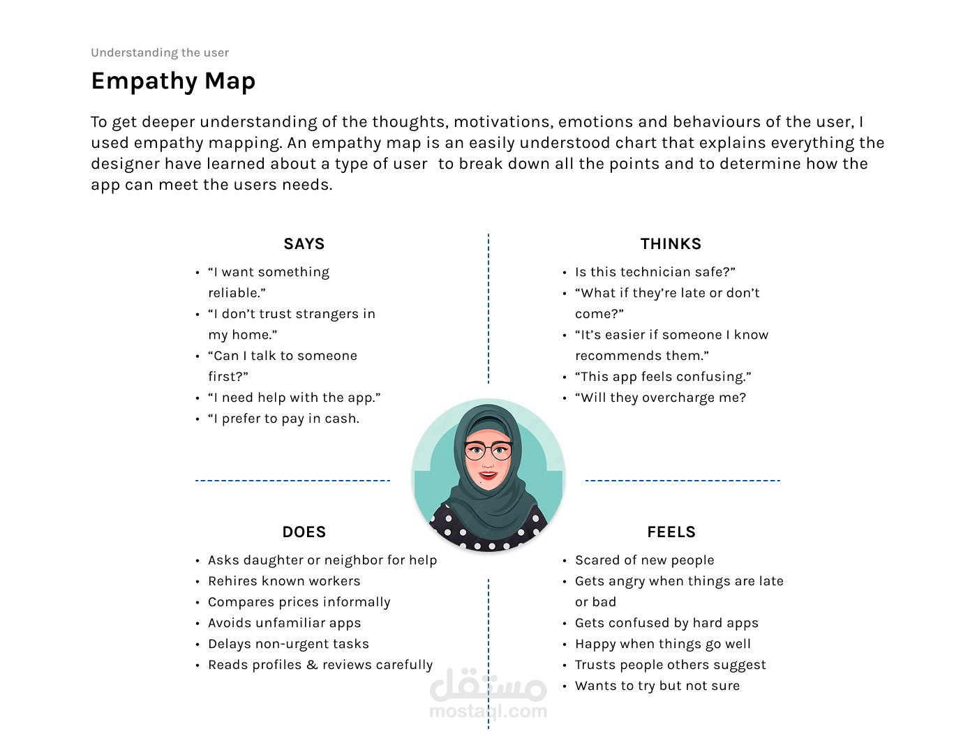 تتضمن الدراسة استعراضًا لمنهج العمل المتبع بدايةً من تحليل المشروع وفهم أهدافه، مرورًا بتحديد الفئة المستهدفة واحتياجاتها، وصولًا إلى دراسة سلوك المستخدمين من خلال بناء شخصيات المستخدم (Personas) وخريطة التعاطف (Empathy Map). كما تشمل الدراسة تحليلًا منهجيًا للمنافسين بهدف تحديد نقاط القوة والضعف في السوق واستخلاص فرص التحسين.