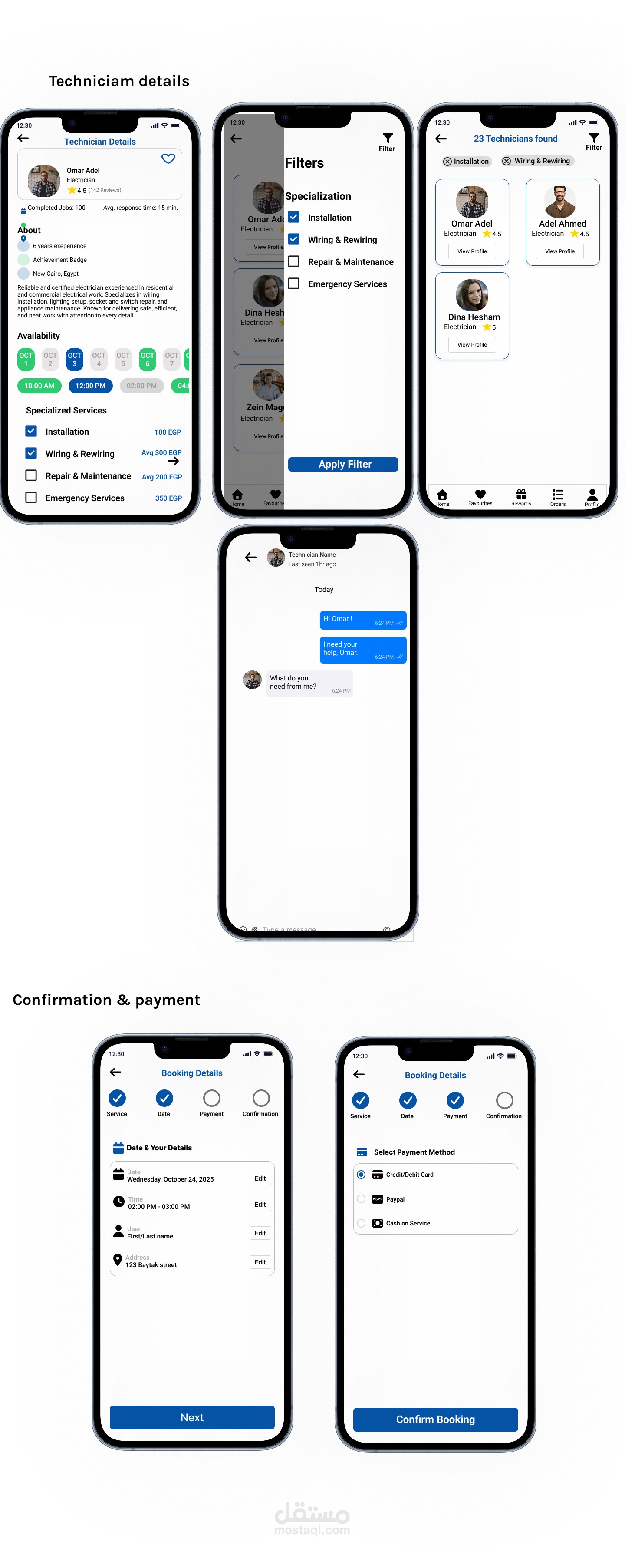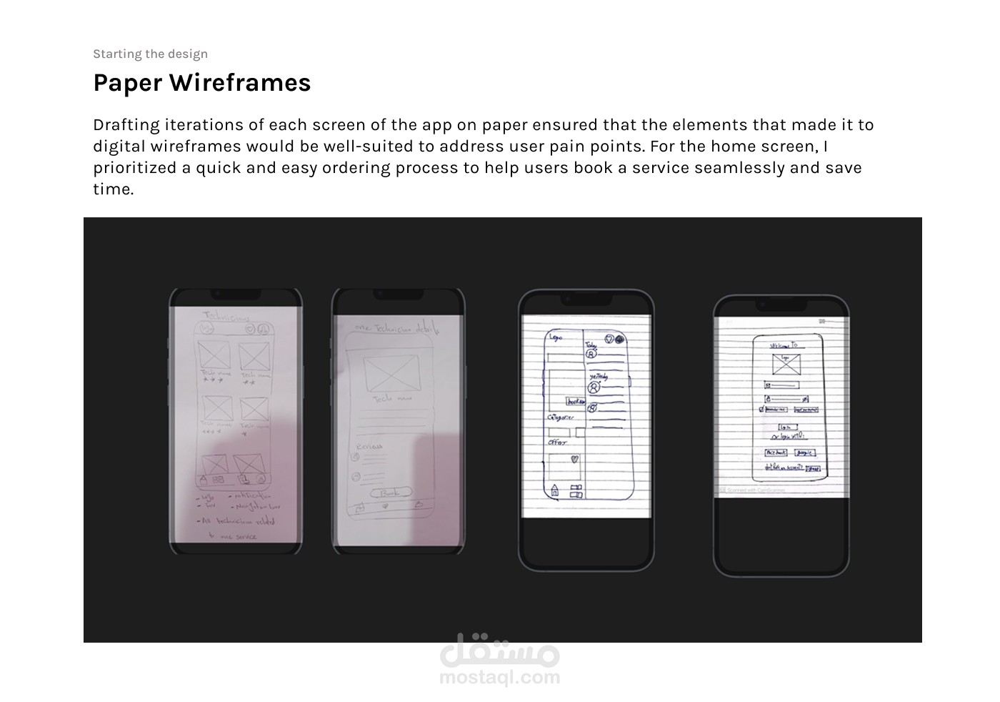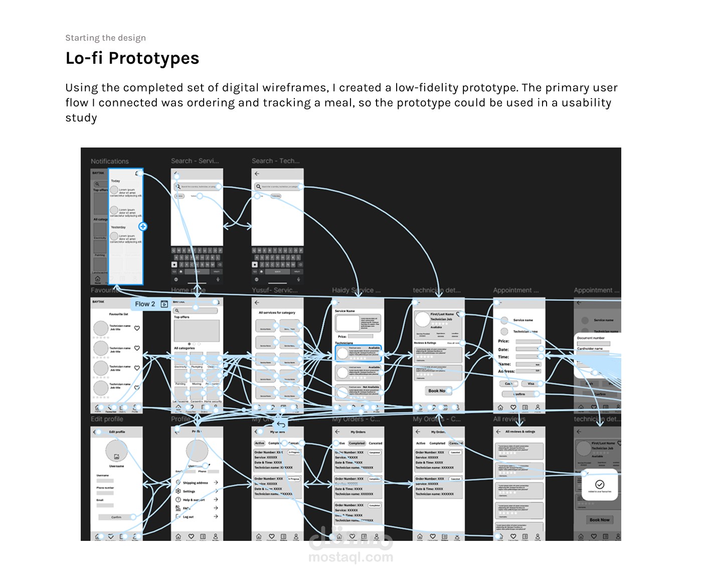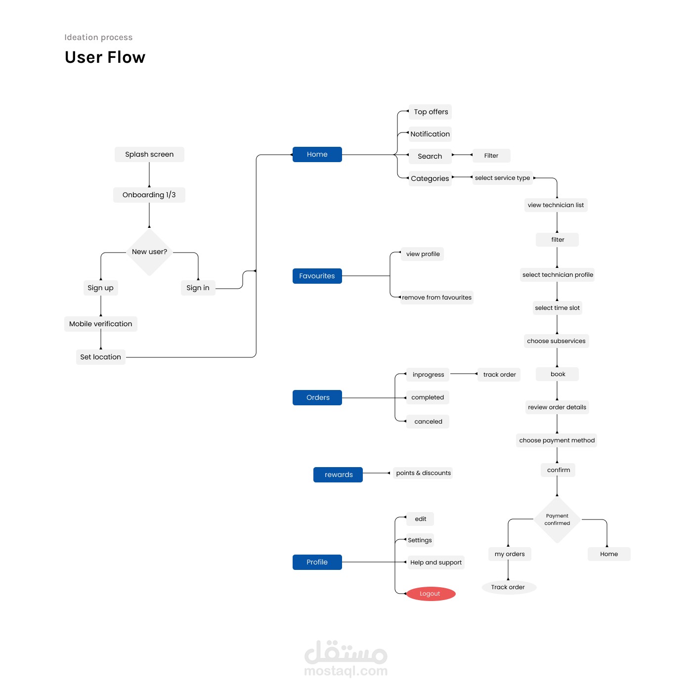 وتستعرض الدراسة أيضًا رحلة المستخدم (User Journey Map) بكل مراحلها ونقاط الاحتكاك المحتملة، إضافة إلى وضع تصور واضح لتحديات المستخدم الأساسية وكيفية معالجتها عبر حلول تصميمية تعتمد على مبادئ التفكير التصميمي (Design Thinking). يلي ذلك تقديم مخطط تدفق المستخدم (User Flow) الذي يوضح المسارات الرئيسية داخل التطبيق، ثم تقديم نماذج أولية (Wireframes) تُمثل البنية المبدئية للشاشات الأساسية.