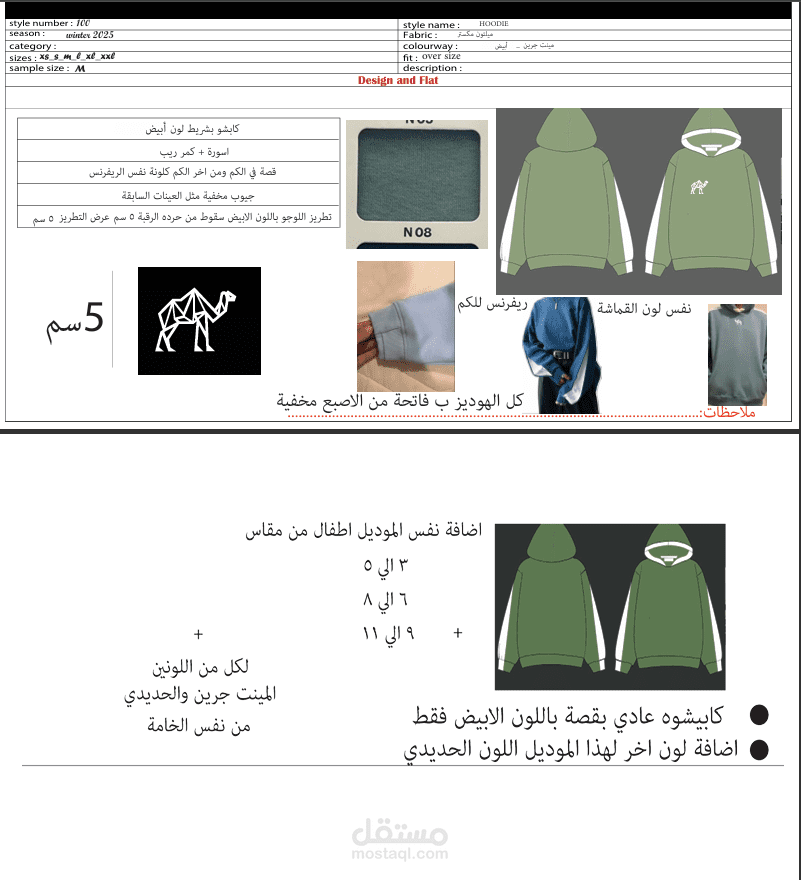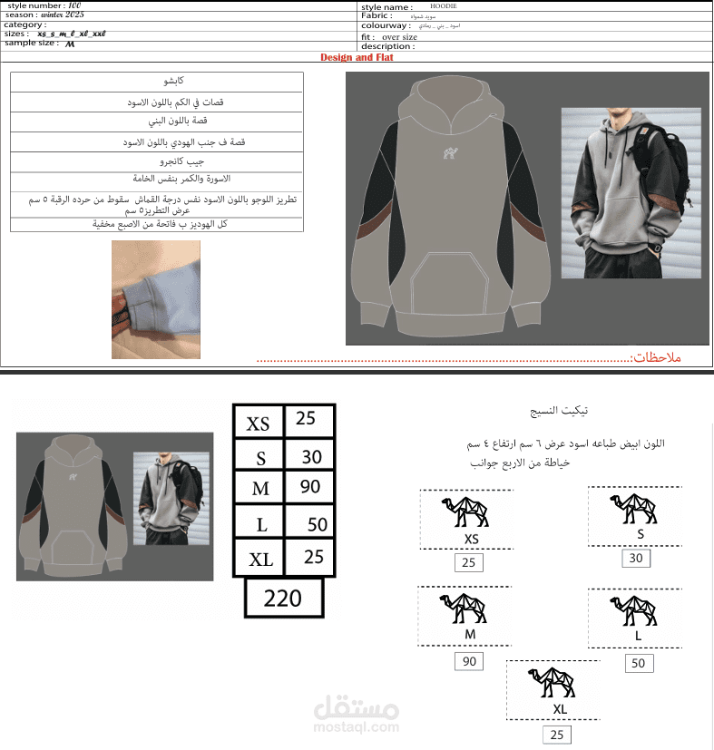 الـ Tech Pack اتعمل باللغة العربية لأنه كان مُخصص للتنفيذ في مصانع مصرية، واشتغلت فيه على كل التفاصيل من المقاسات والمواصفات لحد ملاحظات التصنيع في مصنع "نسيج".