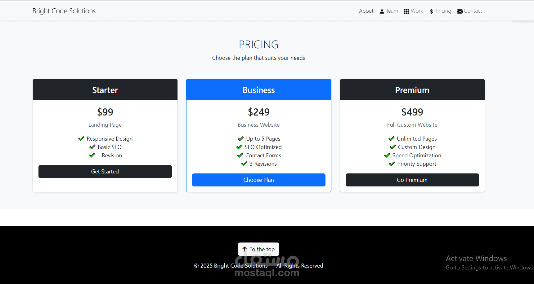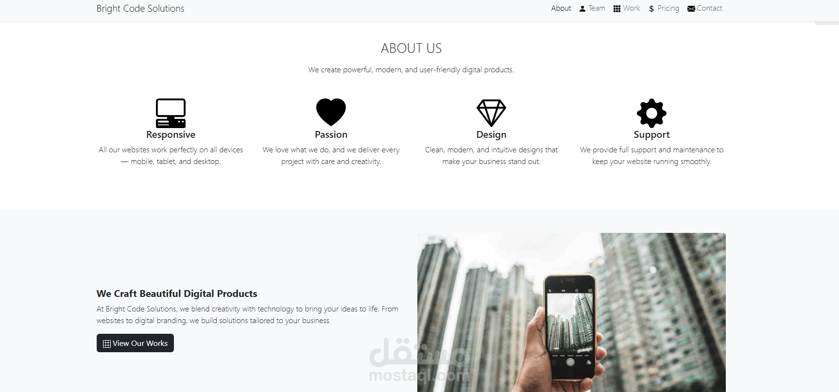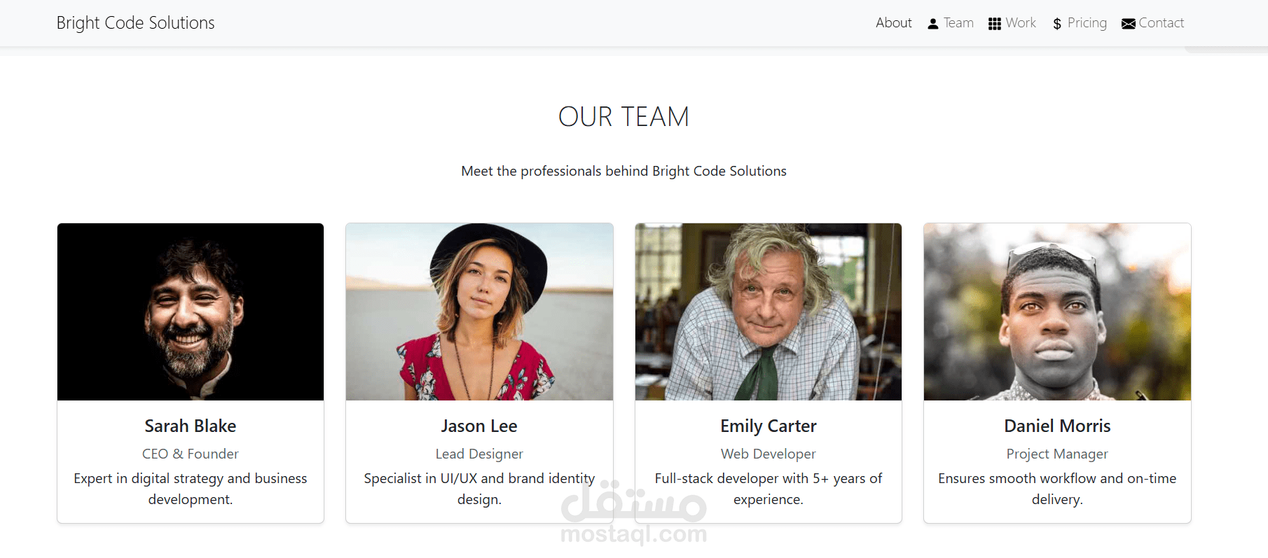يحتوي على صفحات About، Team، Work، Pricing، Contact بشكل جذاب ومتجاوب.