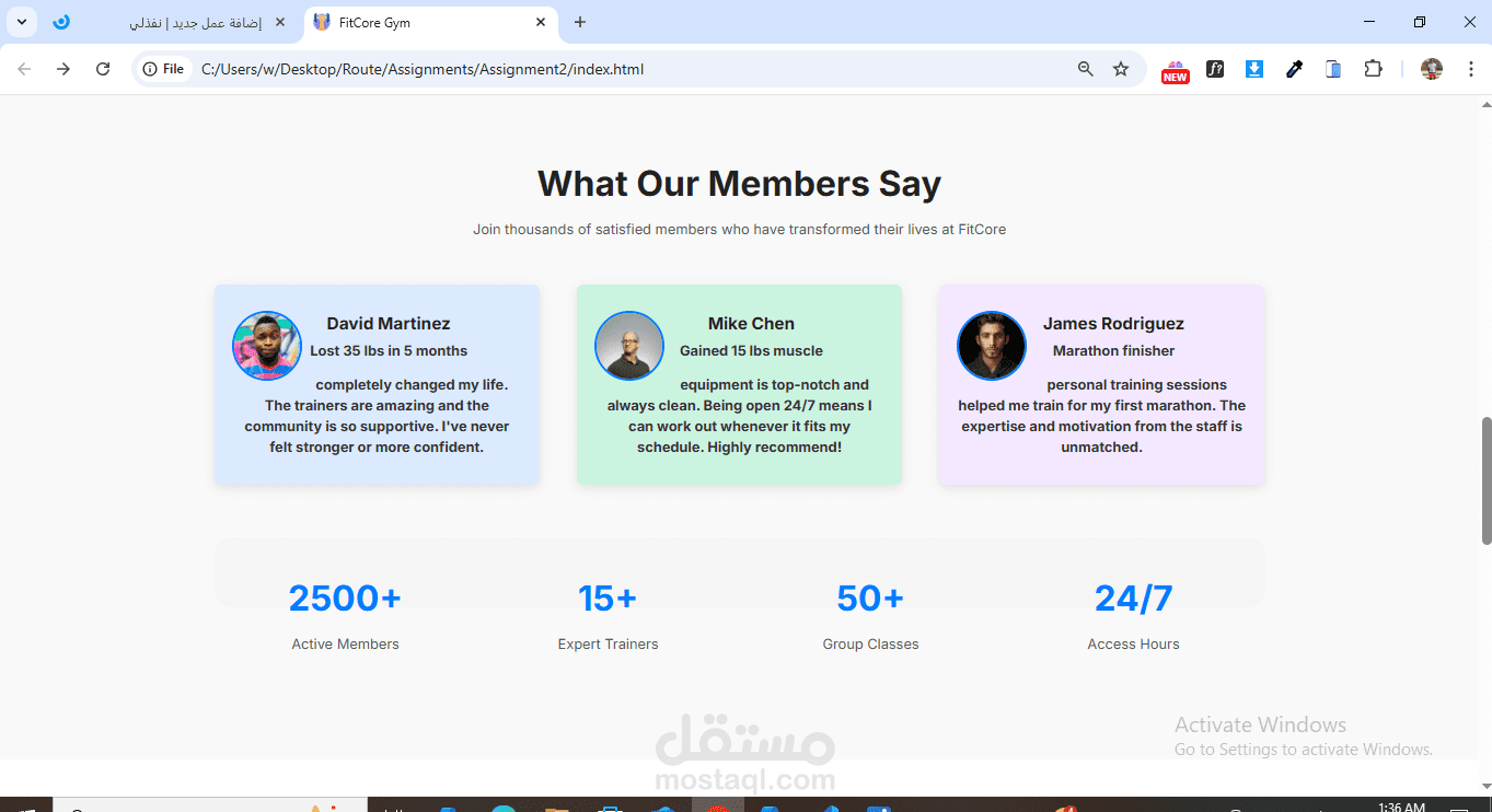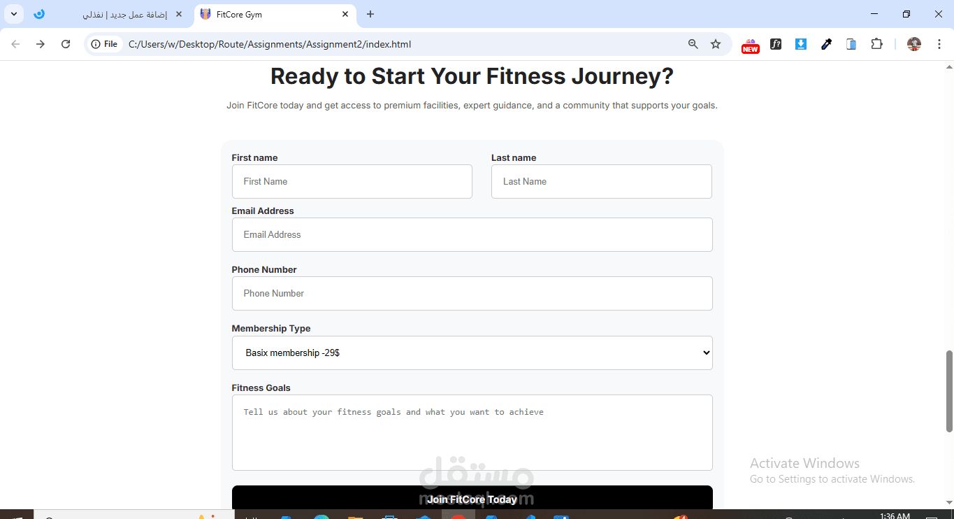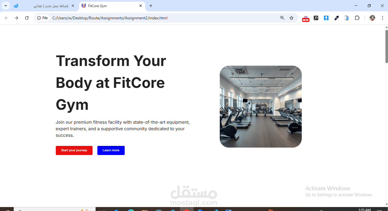قمت بتصميم وتطوير واجهة كاملة لموقع نادي رياضي باسم FitCore Gym بتصميم عصري وجذاب يركز على الهوية البصرية للمكان. المشروع تم تنفيذه باستخدام HTML وCSS مع توزيع منسّق للعناصر، استخدام صور احترافية، وعرض المحتوى بطريقة واضحة ومريحة للمستخدم، مع مراعاة أن الموقع متجاوب (Responsive) لجميع الشاشات.