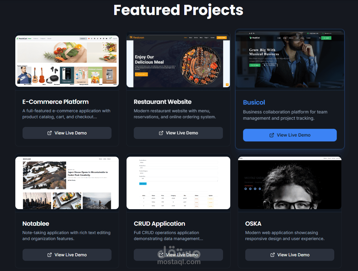قسم المشاريع يعرض البروجكتات الخاصة بي مع صور ووصف وروابط مباشرة للـ GitHub والديمو.