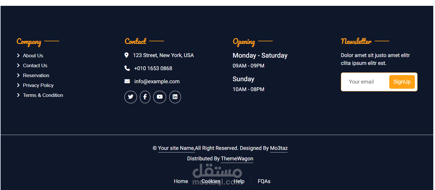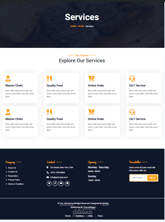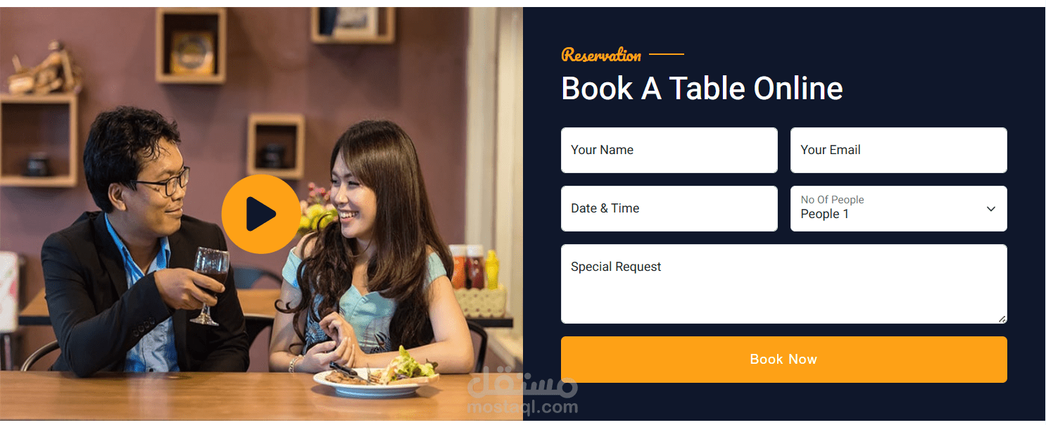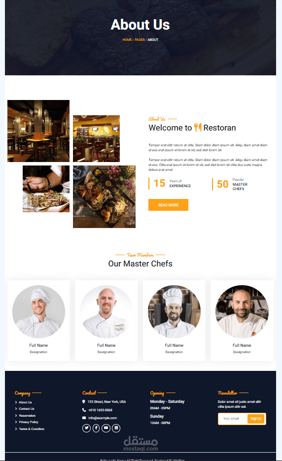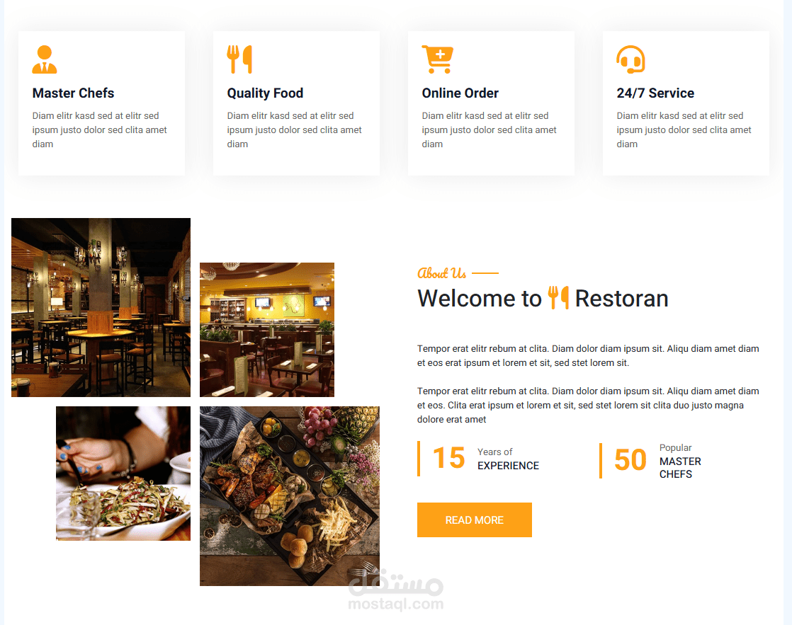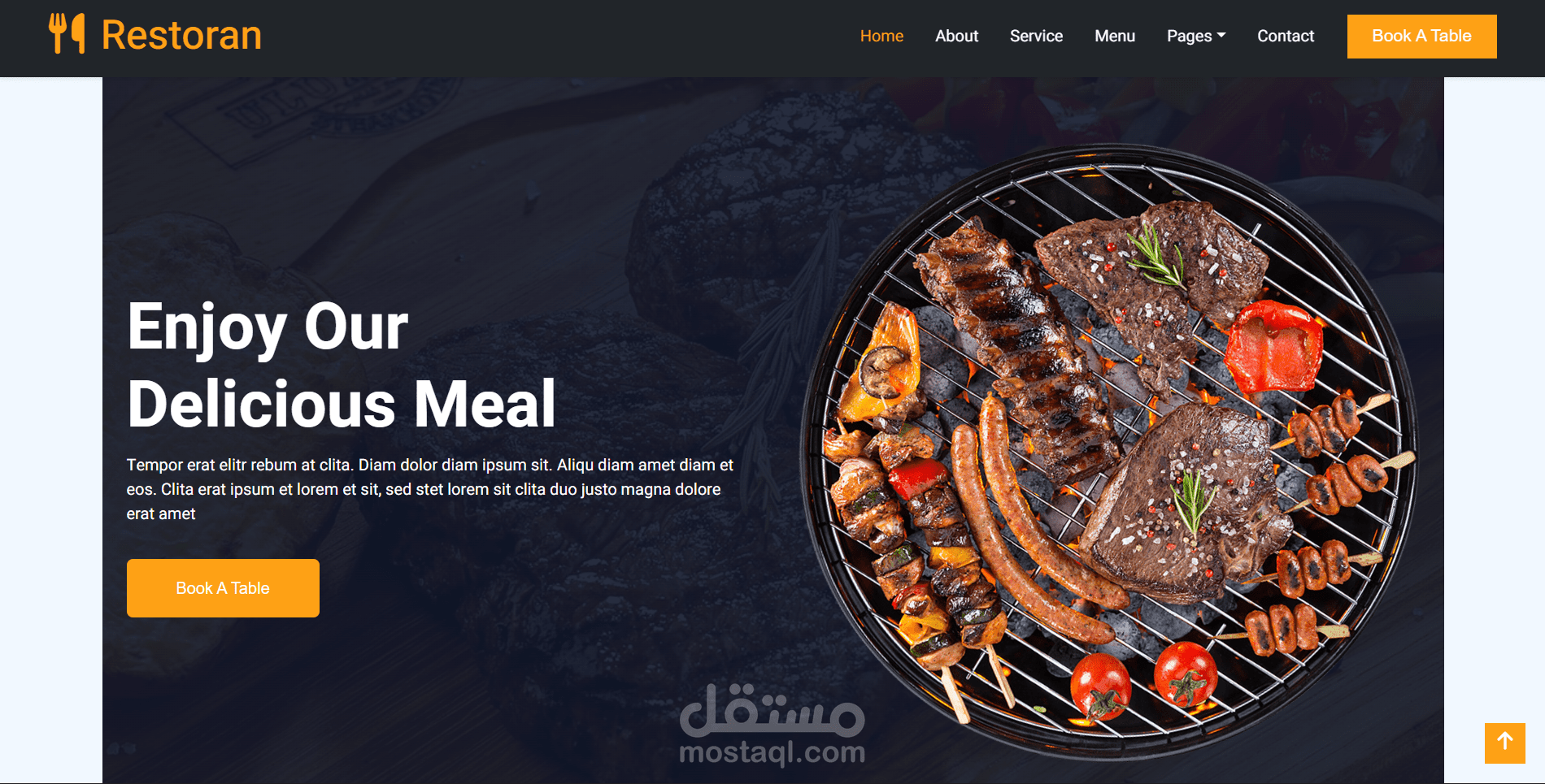 موقع مطعم احترافي تم تصميمه وتطويره باستخدام HTML، CSS، Bootstrap، وJavaScript، بهدف تقديم تجربة تصفح سهلة وجذابة للعملاء.