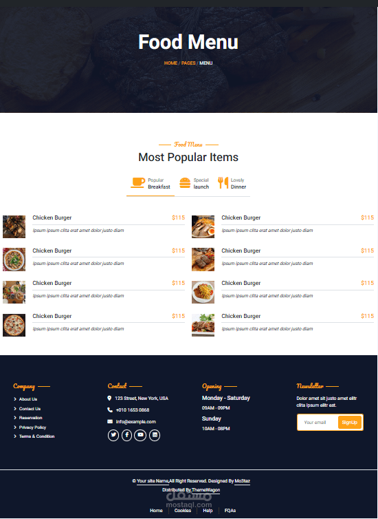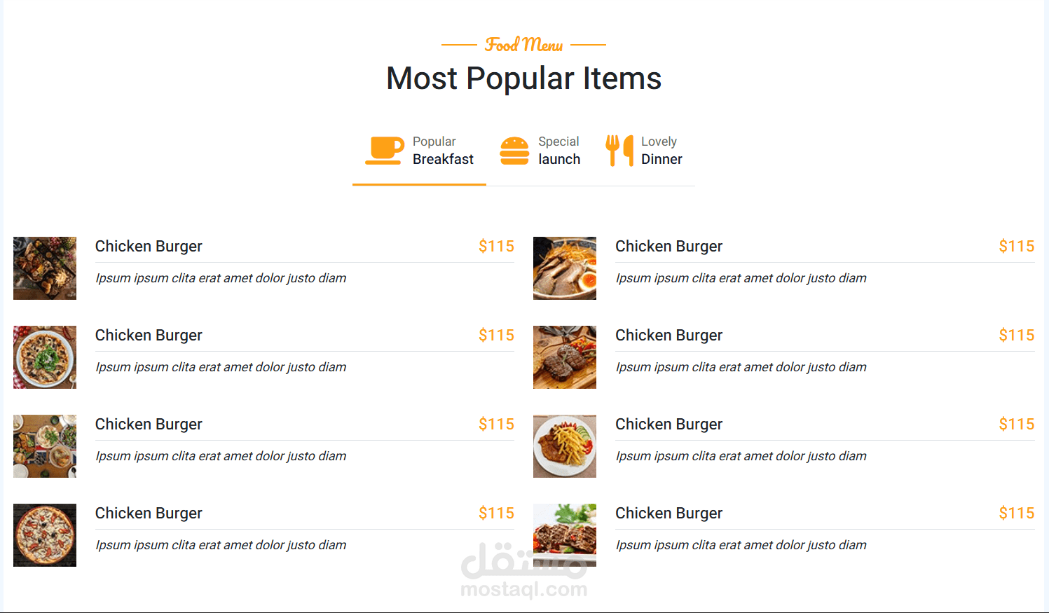 قسم القائمة (Menu Section) يعرض الأصناف مع صور وسعر ووصف بسيط بشكل منظم وجذاب.