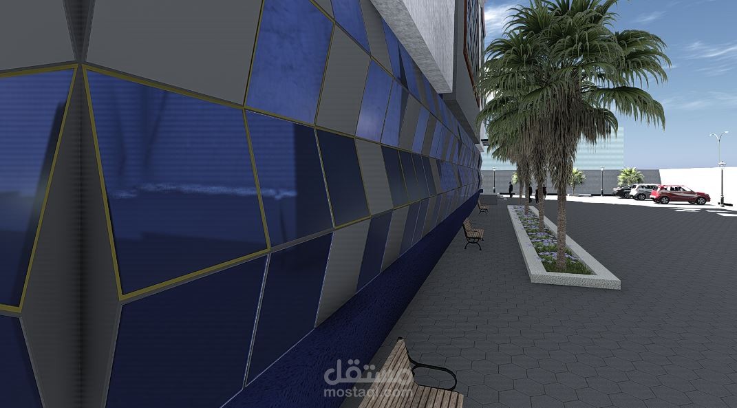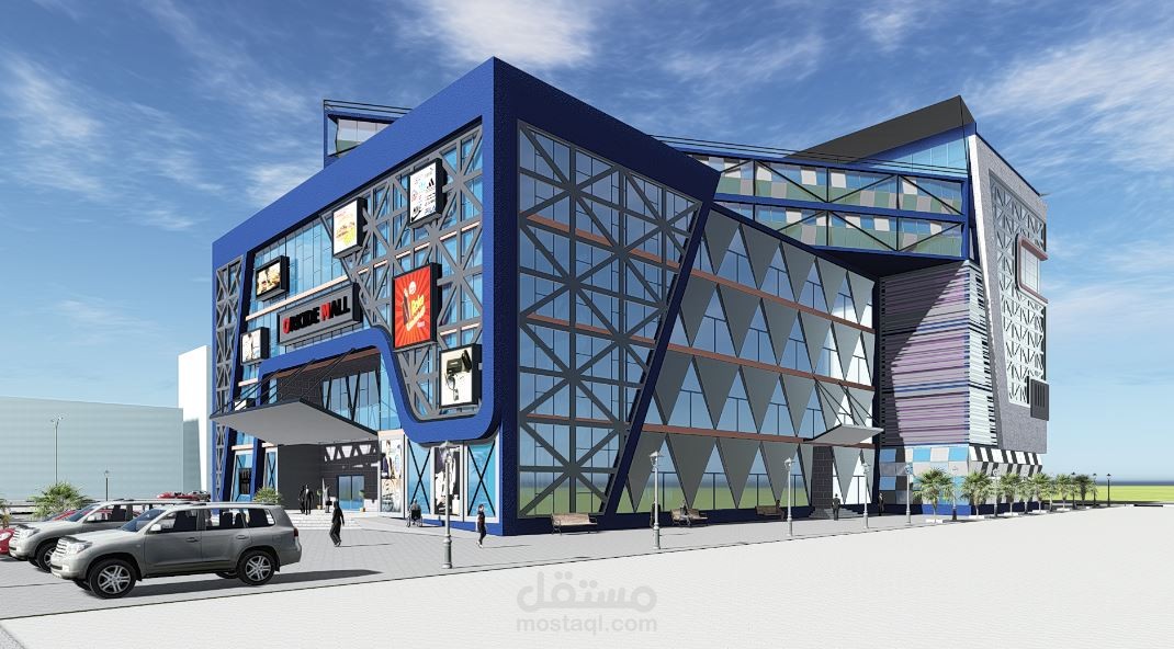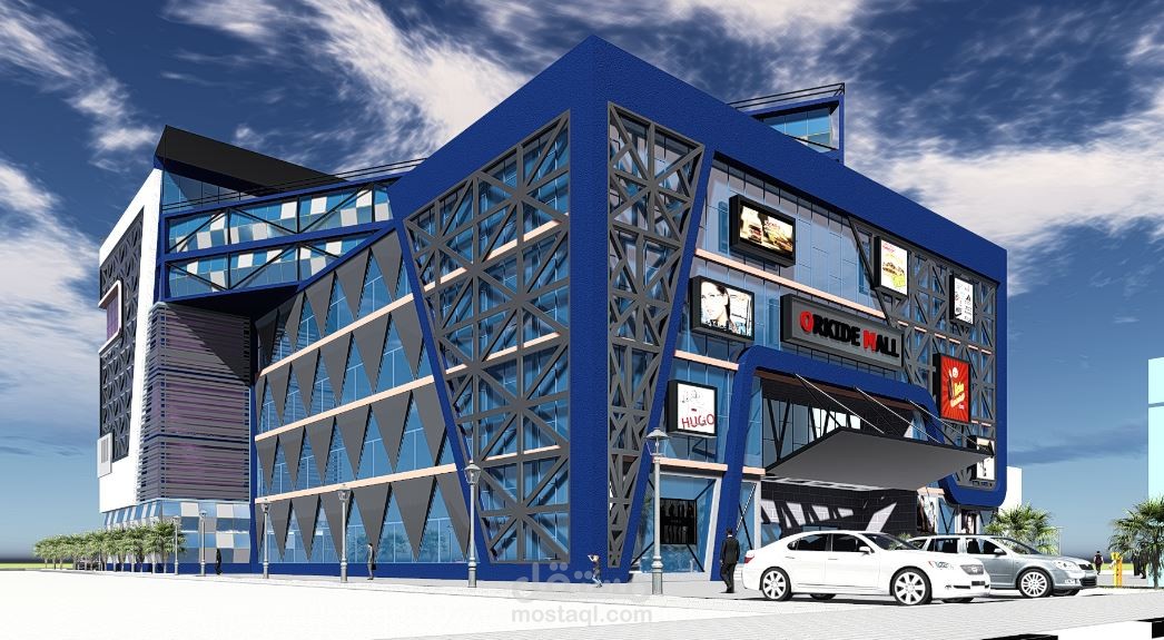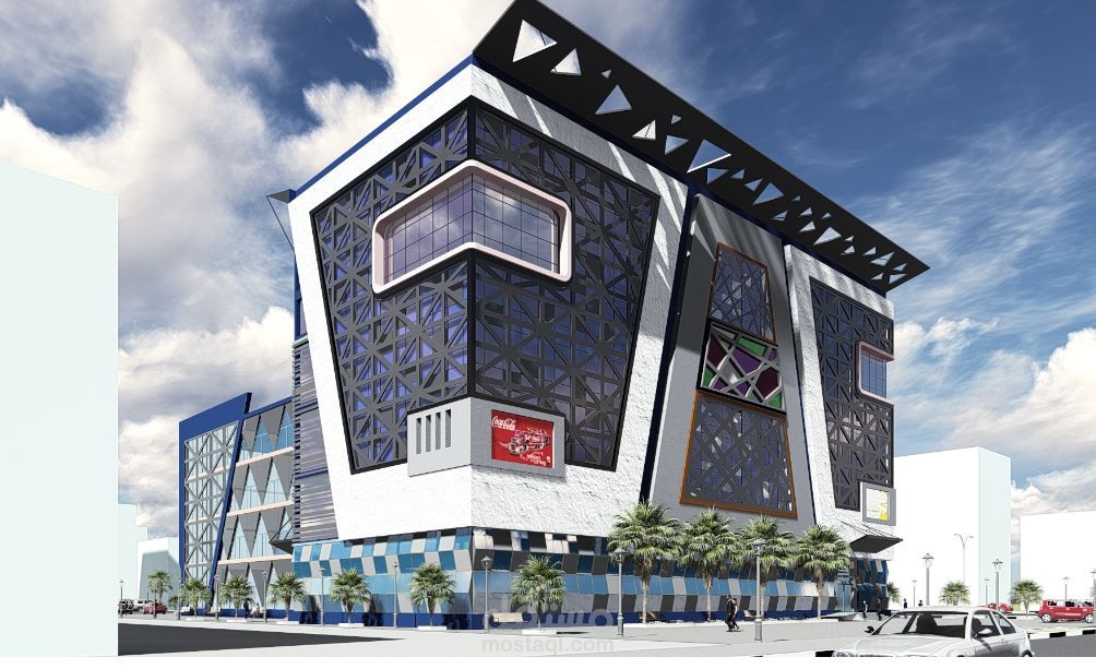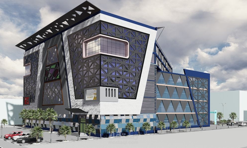 مشروع تصميم مول تجاري مكون من9 طوابق، طابقين أسفل الأرض مخازن وكراج سيارات، وسبعة طوابق فوق الأرض، يوجد به محلات تجارية ومطعم ومكاتب تجارية.