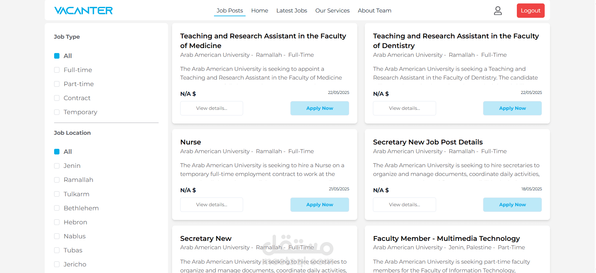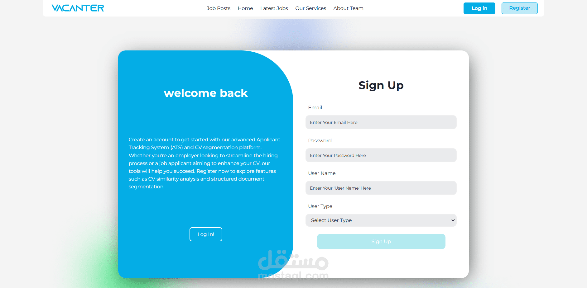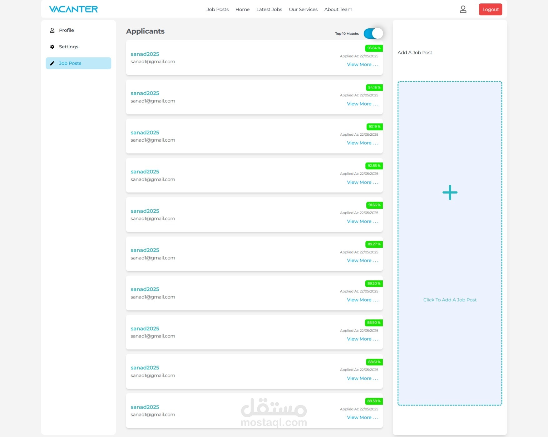 نظام ذكي لتتبّع المتقدّمين (ATS) يعتمد على تحليل السير الذاتية بالذكاء الاصطناعي، إضافة إلى تحليل التشابه لمطابقة المرشّحين مع الوظائف المناسبة. تم بناؤه باستخدام React.js و Tailwind CSS و Chakra UI، مع استخدام Redux Toolkit لإدارة الحالة.