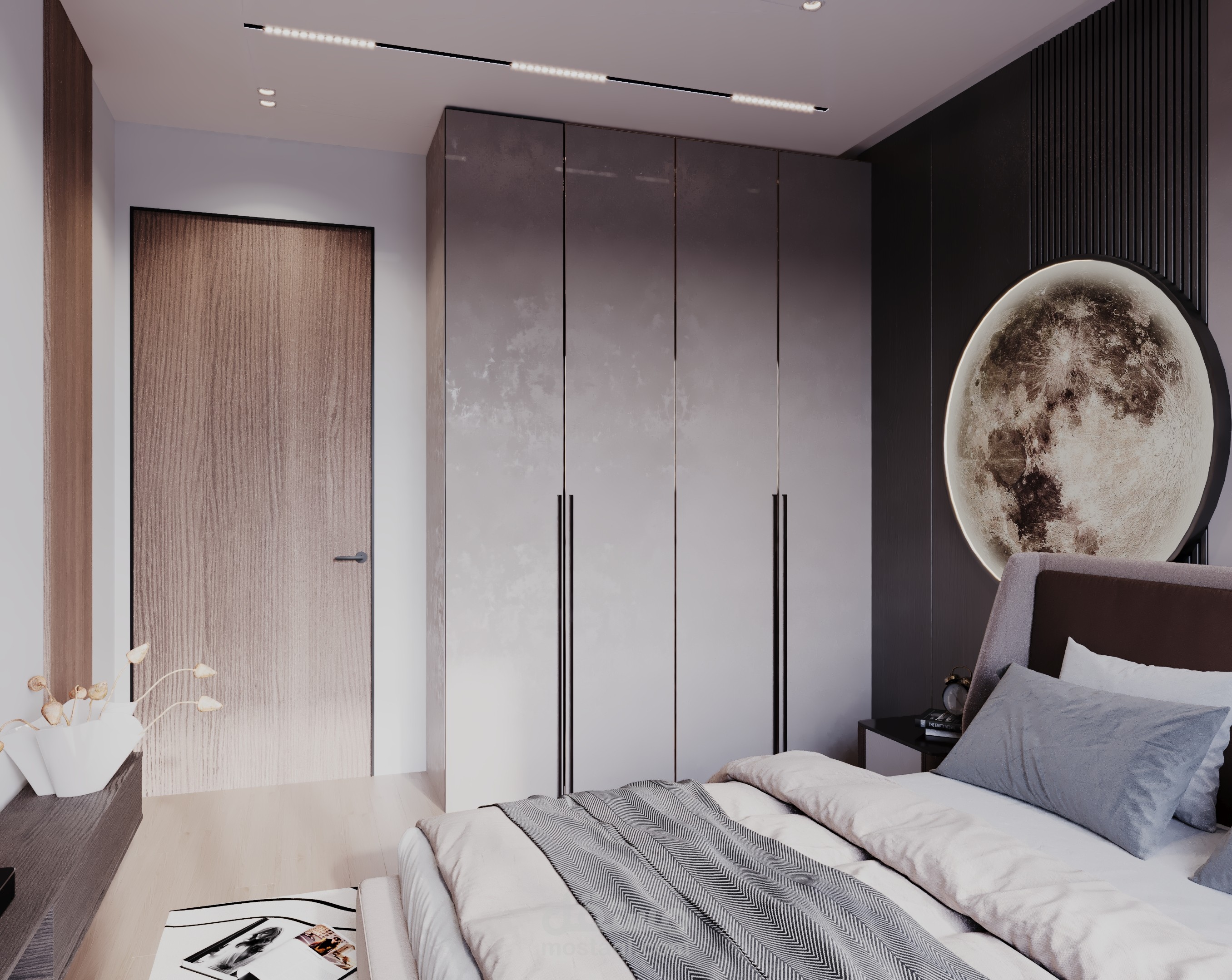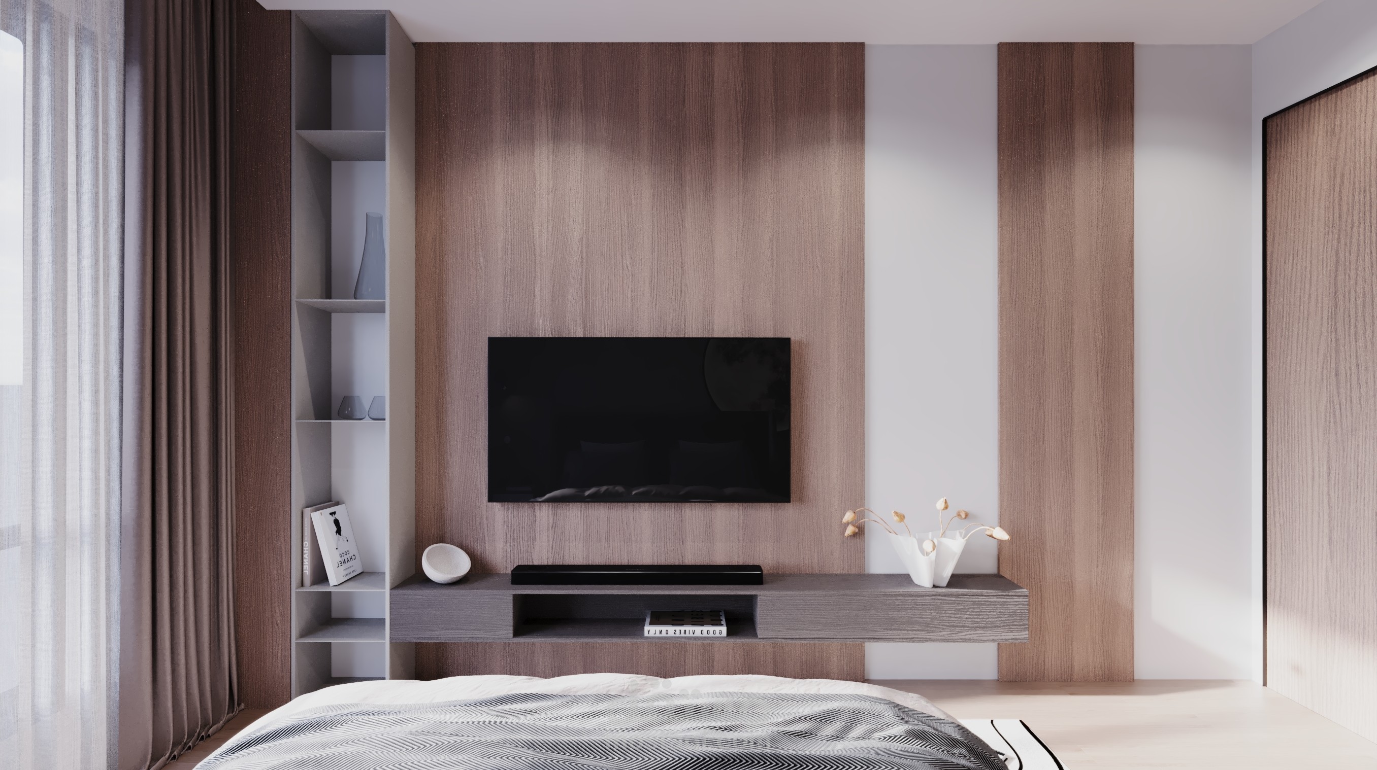 تصميم داخلي معاصر يجمع بين الأناقة العصرية والوظائف المتعددة، موجه للشاب الذي يبحث عن مساحة تعكس شخصيته وتدعمه في دراسته، هواياته، واسترخائه.