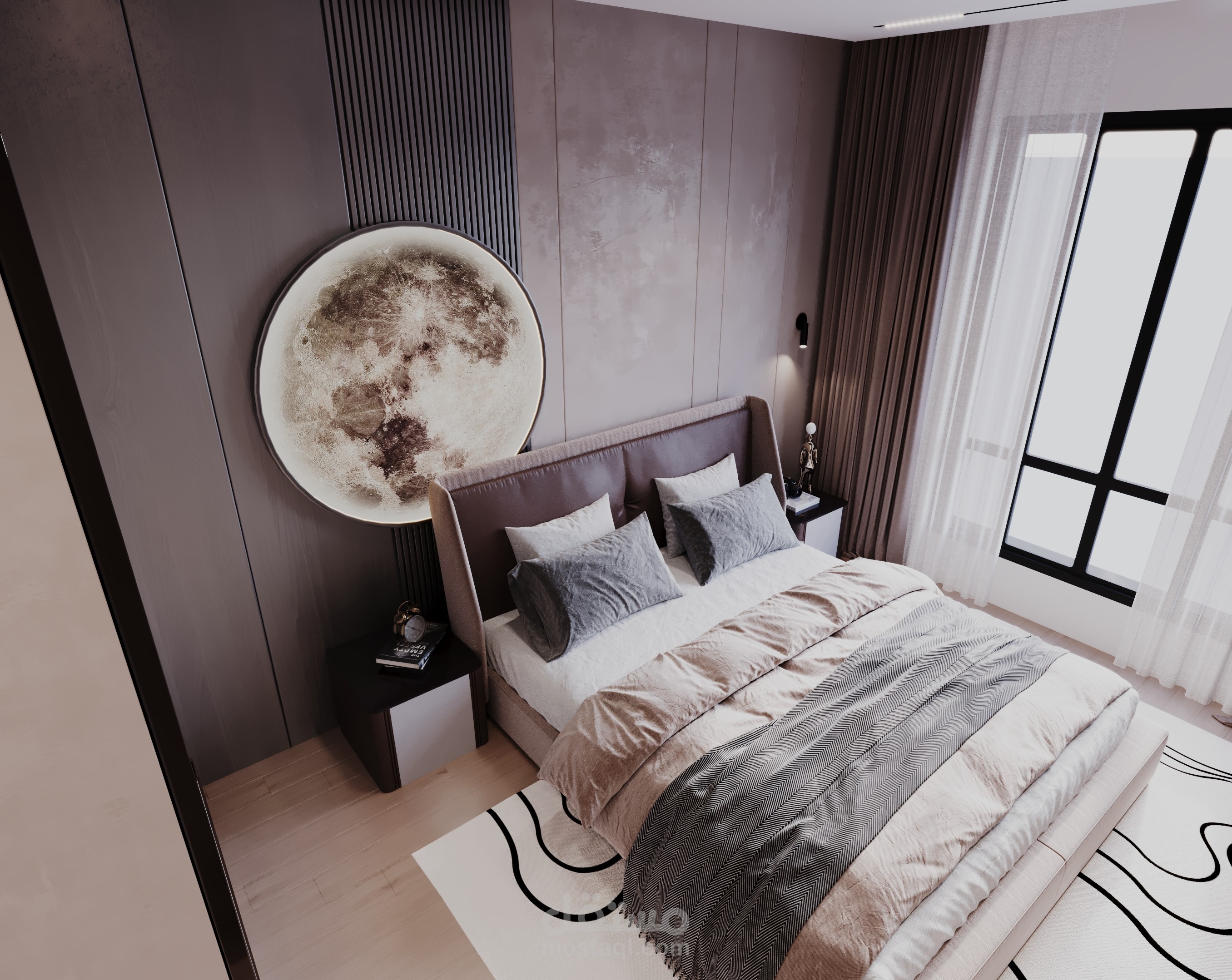 نوع العمل: تصميم داخلي ثلاثي الأبعاد (3D Rendering) يعرض التفاصيل الواقعية للخامات، الألوان، والتوزيع الوظيفي للمساحة.