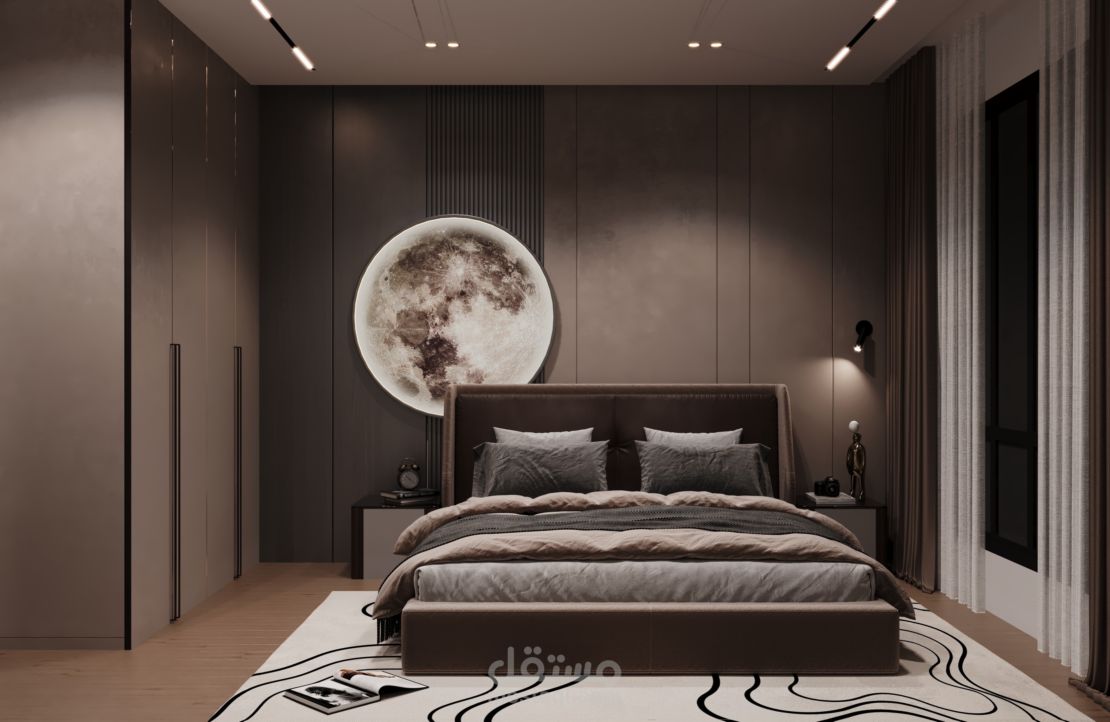الجمالية العصرية والرجولية: استخدام لوحة ألوان هادئة وراقية ، مع التركيز على الخطوط النظيفة والخامات العملية مثل الخشب الداكن، المعدن، والجلود.