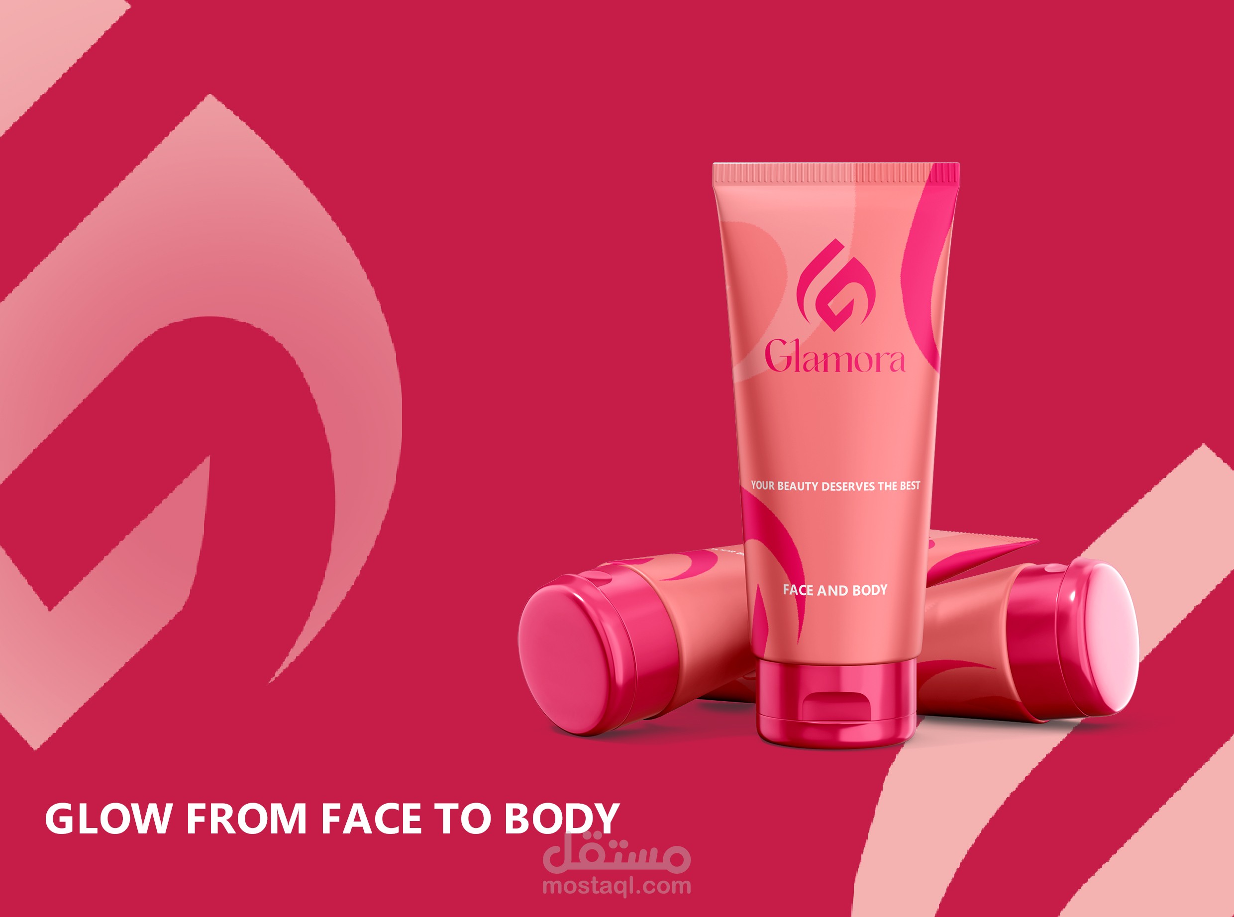 This is a high-end, modern logo for a brand named Glamora, set against a warm, muted red backdrop featuring a close-up image of an elegant woman.
