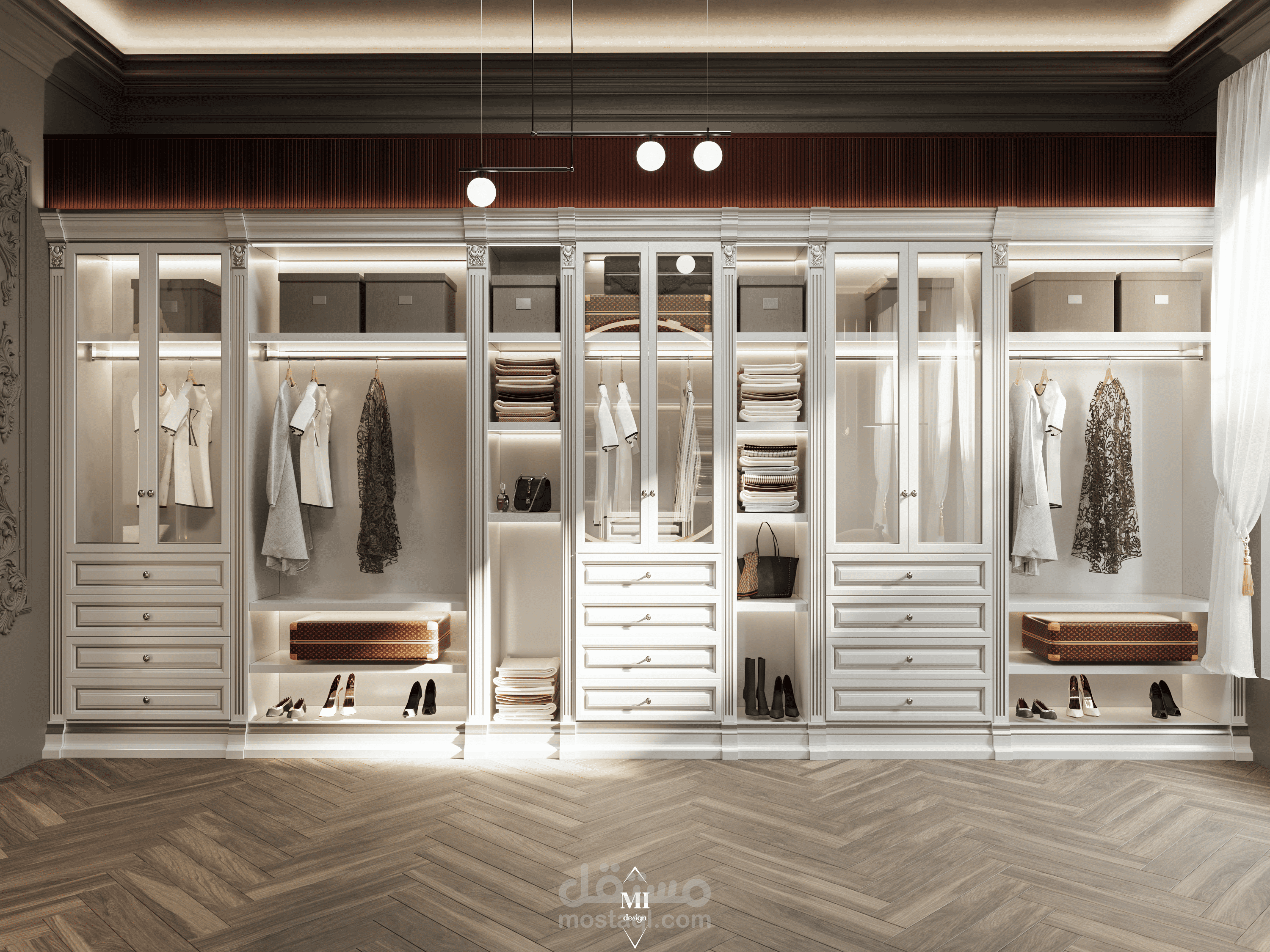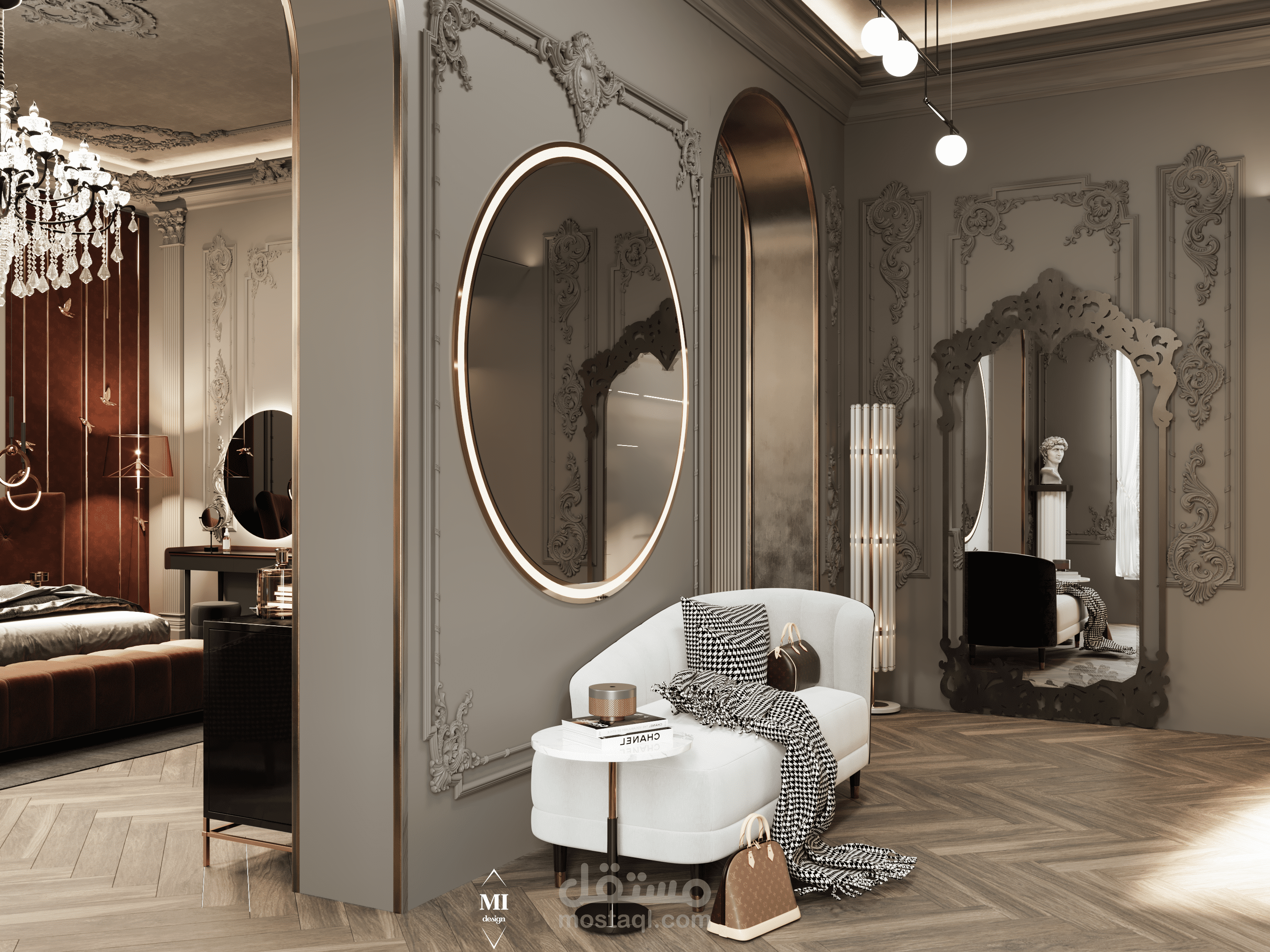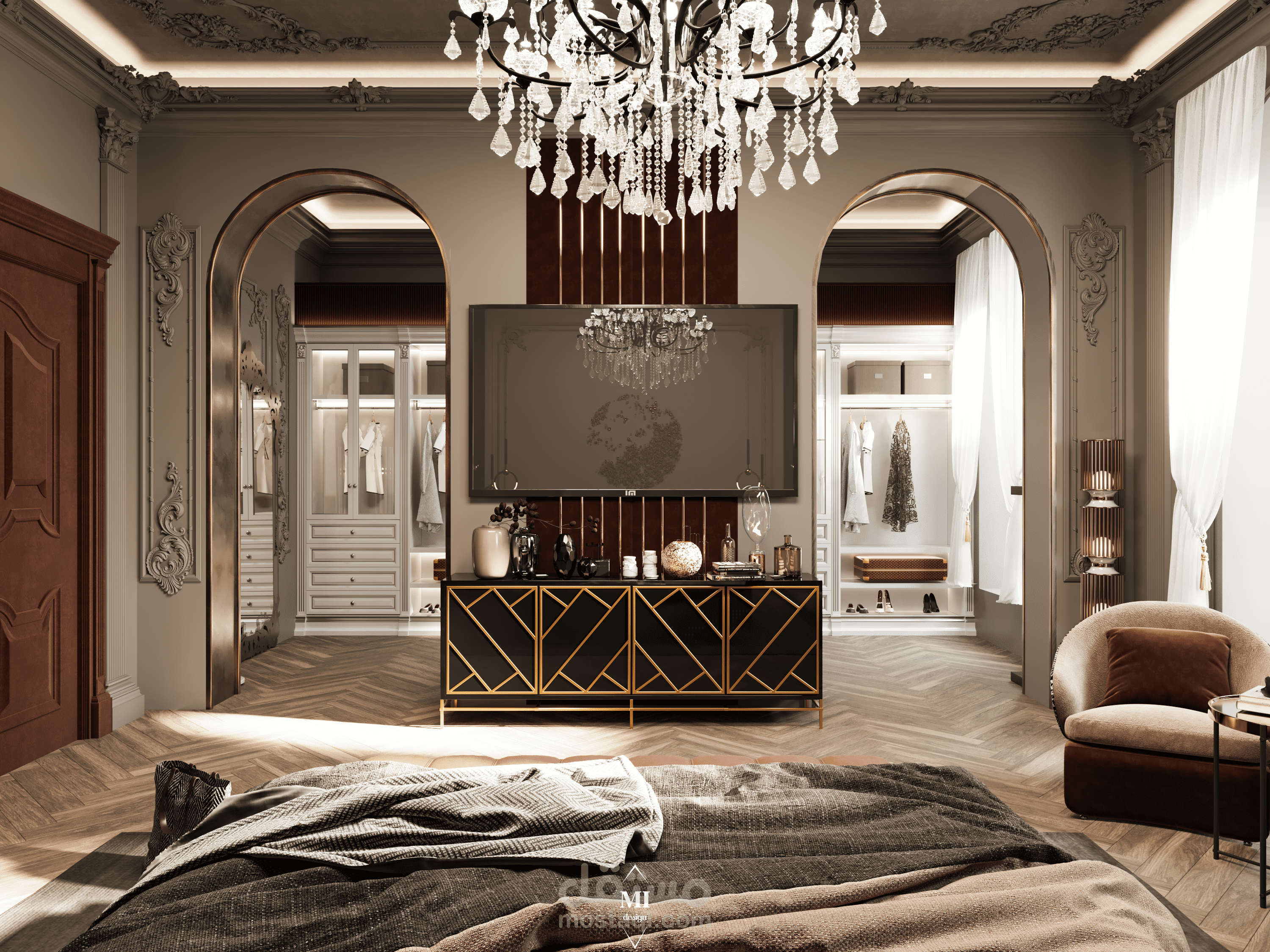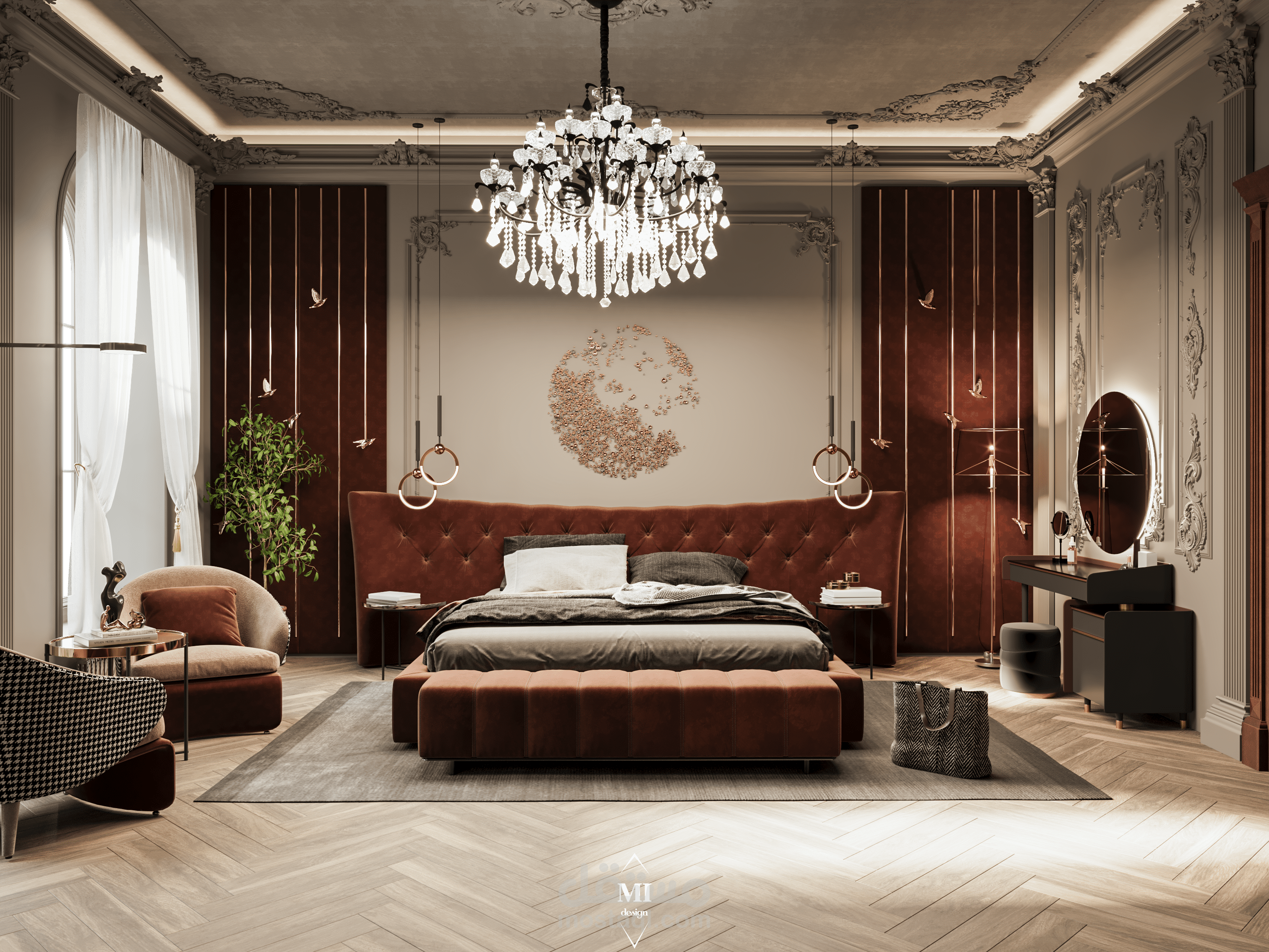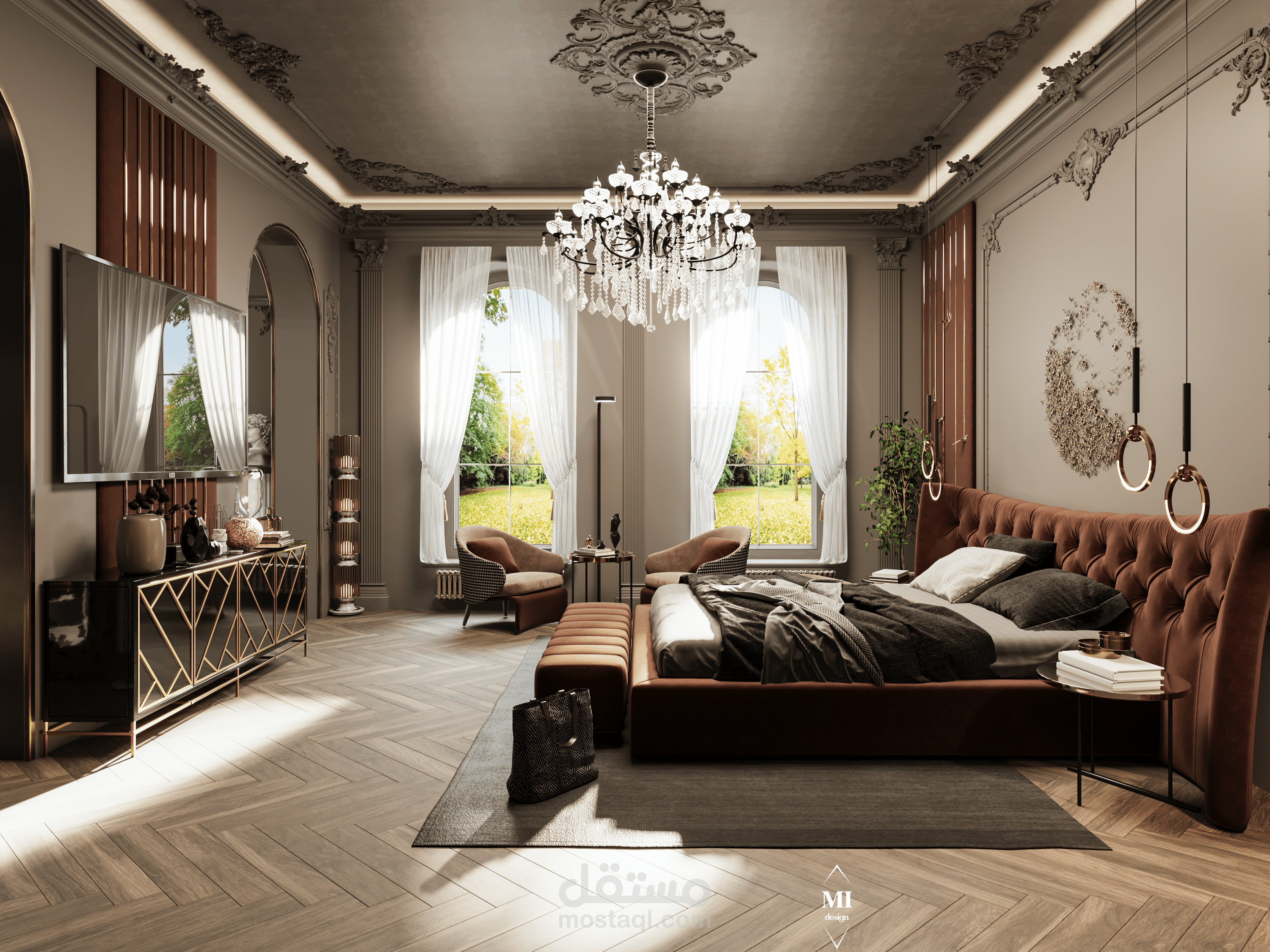 A luxurious classic master bedroom designed with a modern touch. The space features rich warm tones, elegant paneling, a tufted headboard, and refined gold accents. A crystal chandelier and detailed molding highlight the classic character, while contemporary furniture and layered lighting create a comfortable and balanced atmosphere. The design blends sophistication, warmth, and functionality in a harmonious way.