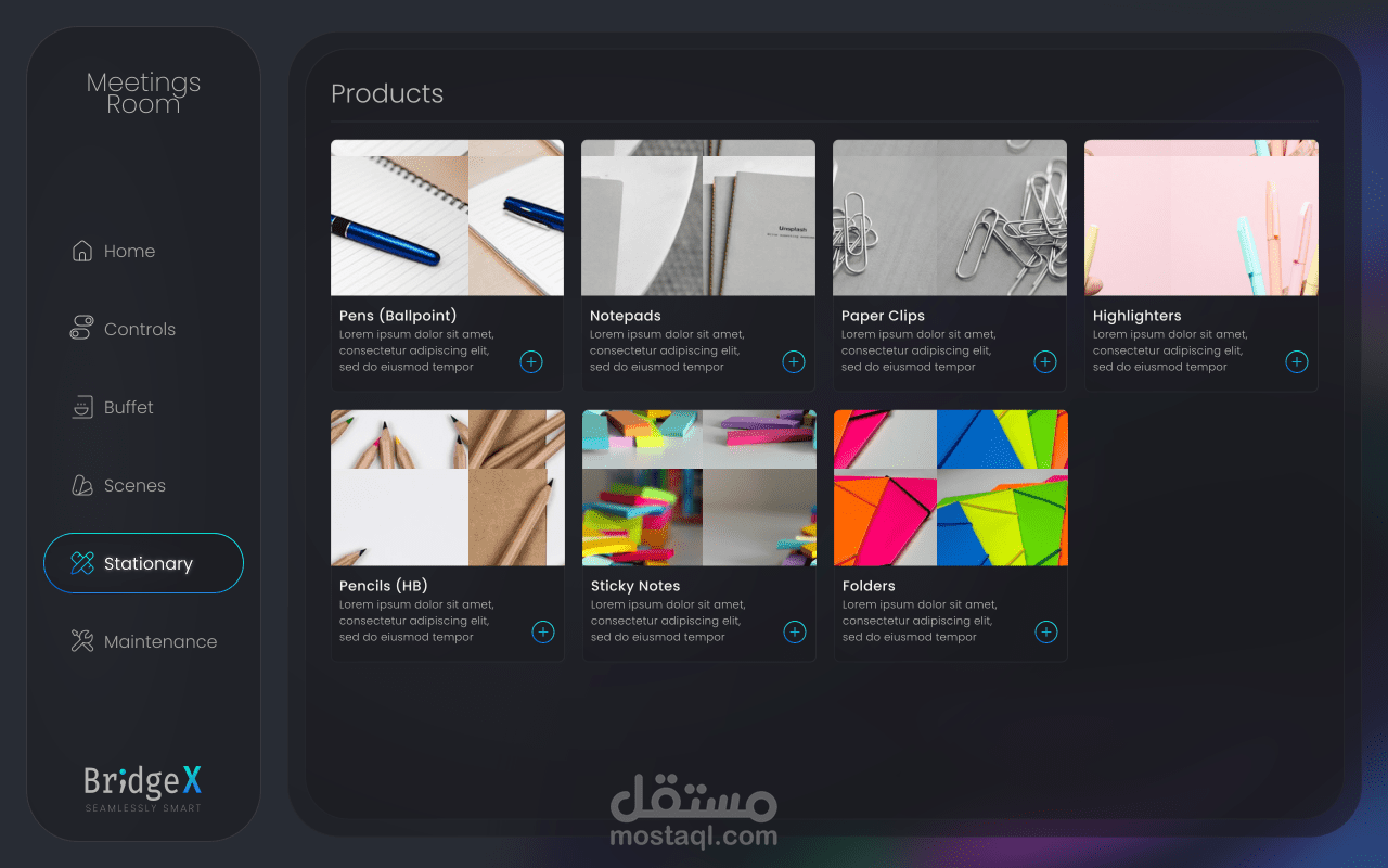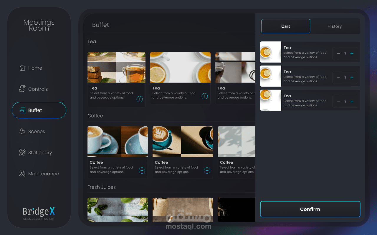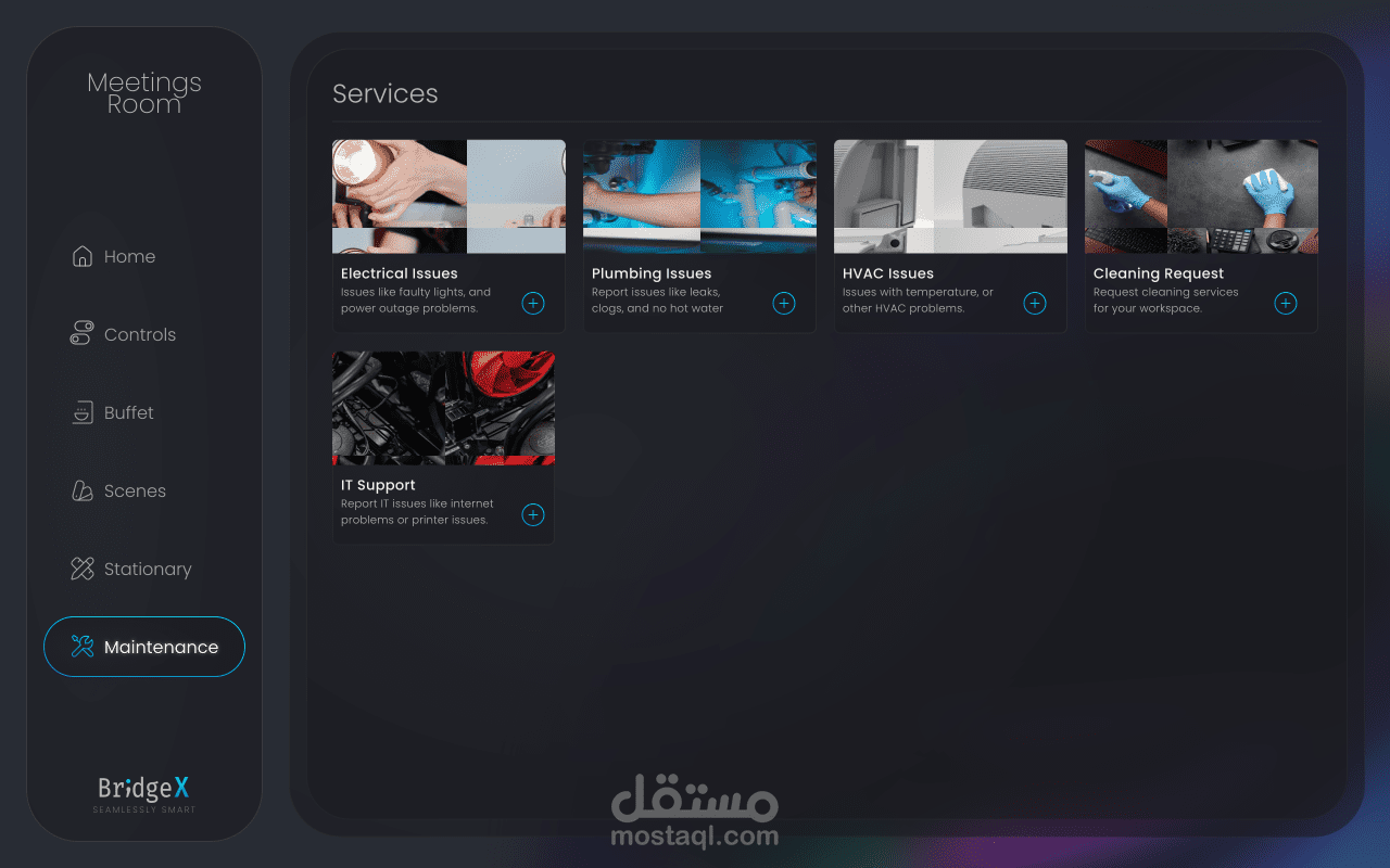 - الخصوصية والوظائف اللوجستية: يضمن التطبيق أقصى درجات الخصوصية من خلال التحكم الفوري في آليات الستائر والزجاج الذكي للتبديل بين الشفافية والعتامة. كما يتميز التطبيق بأنه مركز خدمي متكامل، حيث يشتمل على أقسام لإدارة طلبات الخدمات اللوجستية الأساسية مثل الضيافة (Buffet)، واللوازم المكتبية (Stationary)، وتقديم طلبات الصيانة (Maintenance).