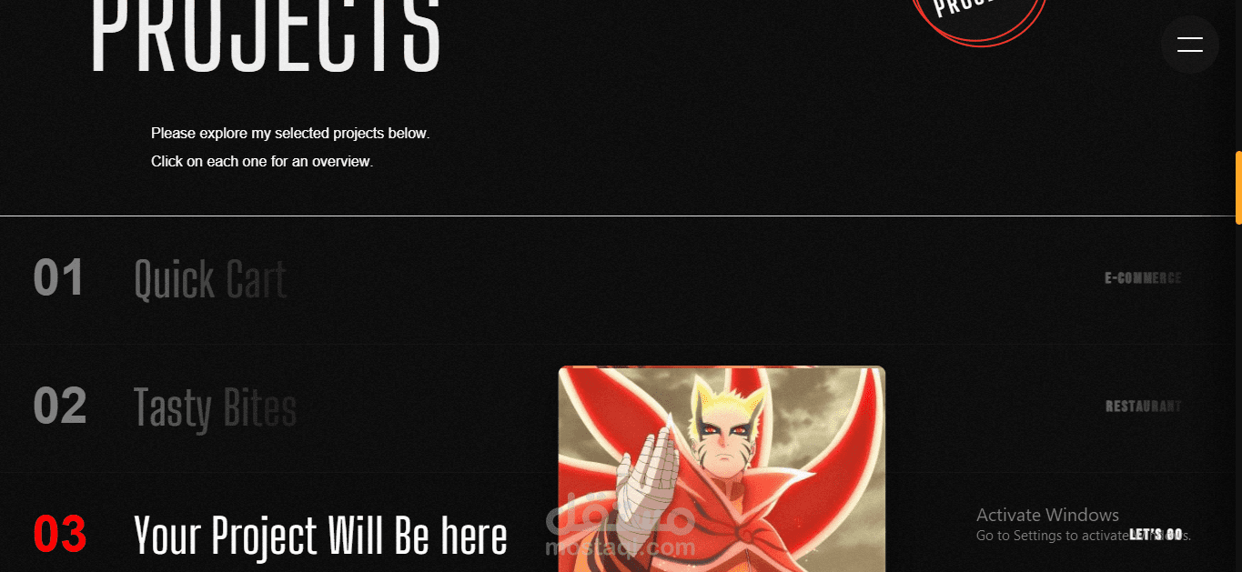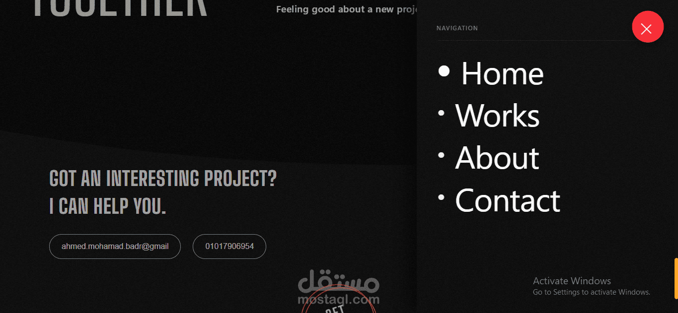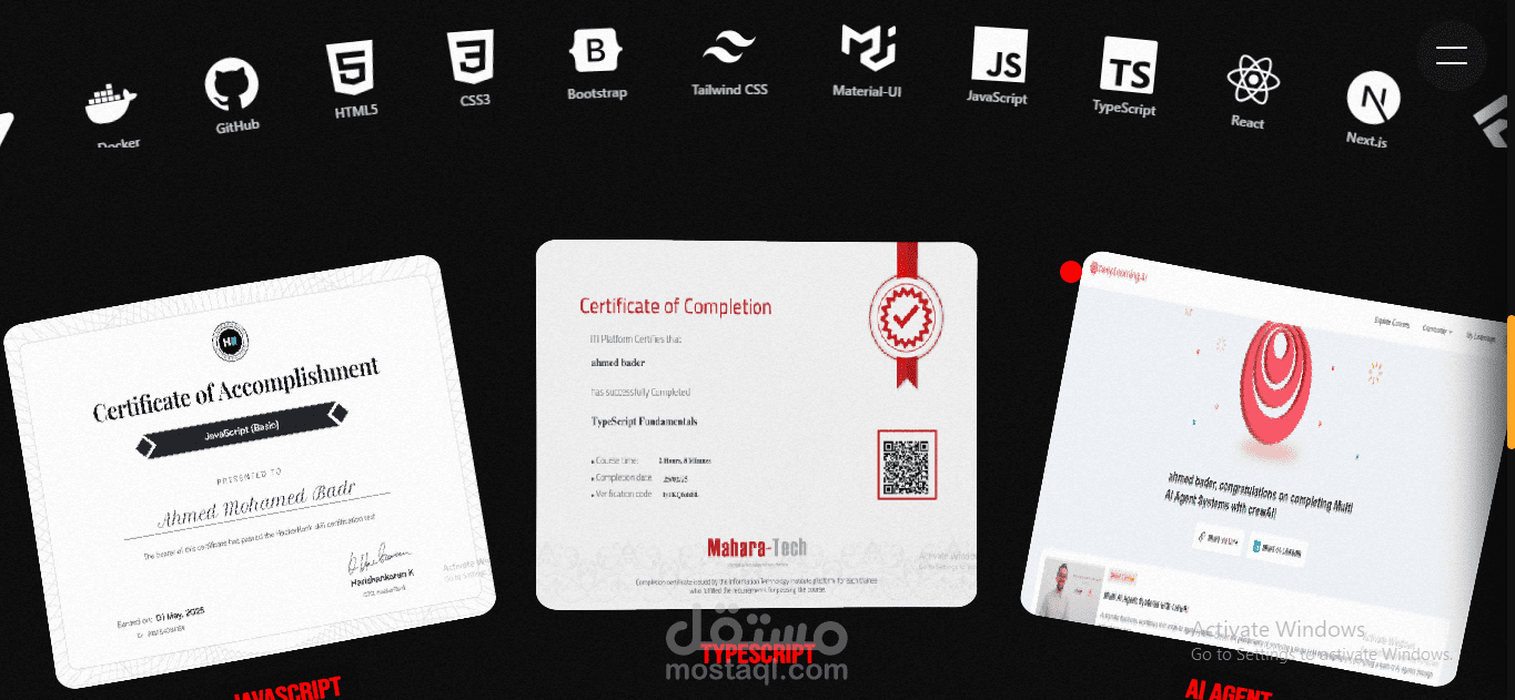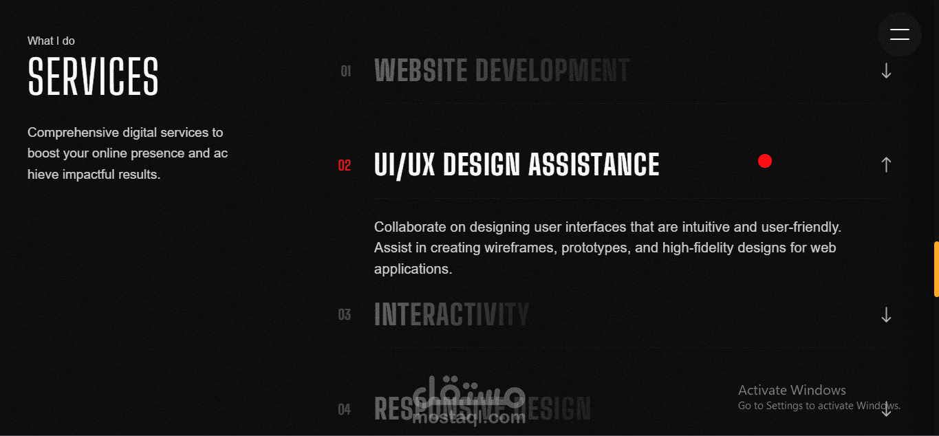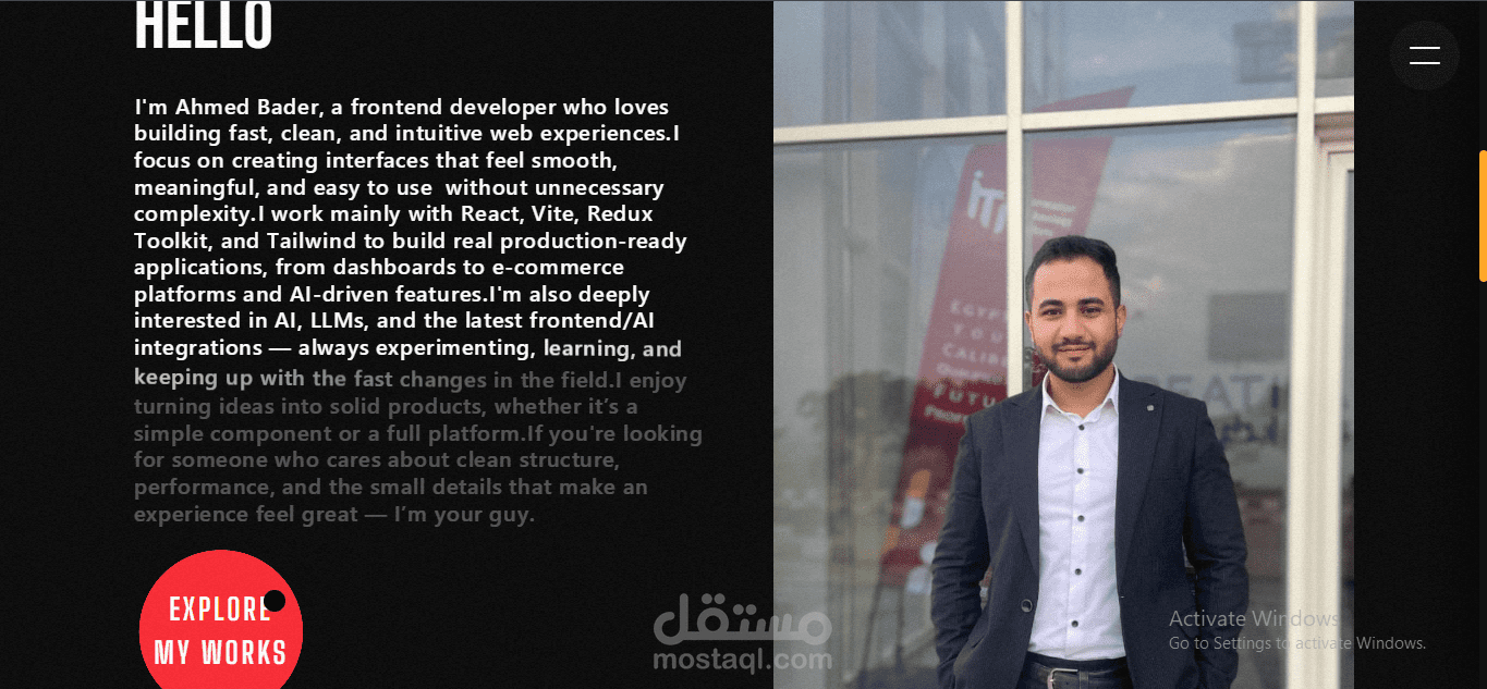 نفذت Hero Section تفاعلي مع تأثير Reveal-on-Hover وكيرسور مخصص متقدم، أنيميشن حرفي للنصوص والعناوين، وعرض خدمات متخصصة (Frontend Development, UI/UX, Interactive Experiences, Responsive Design, Web Animations).