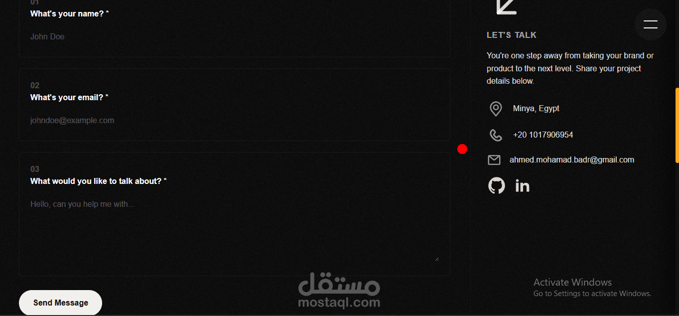 دمجت نموذج تواصل وظيفي فوري عبر EmailJS، ScrollTrigger + Lenis لتمرير سلس وأنيميشن مبنية على التمرير، وPage Transitions سلسة باستخدام Framer Motion + React Router.