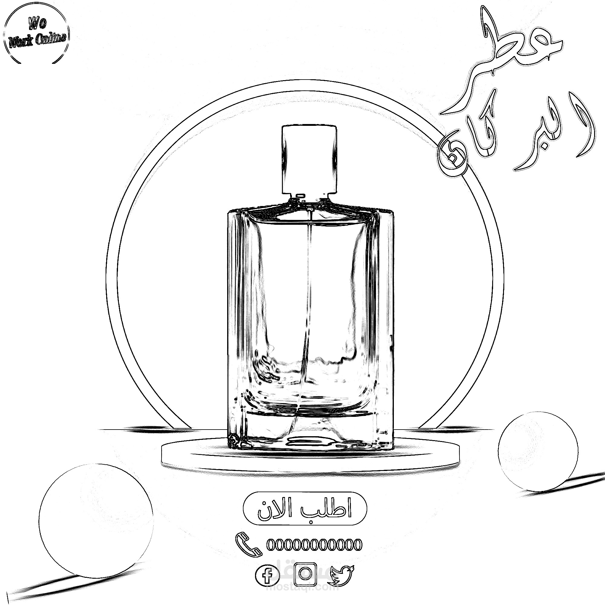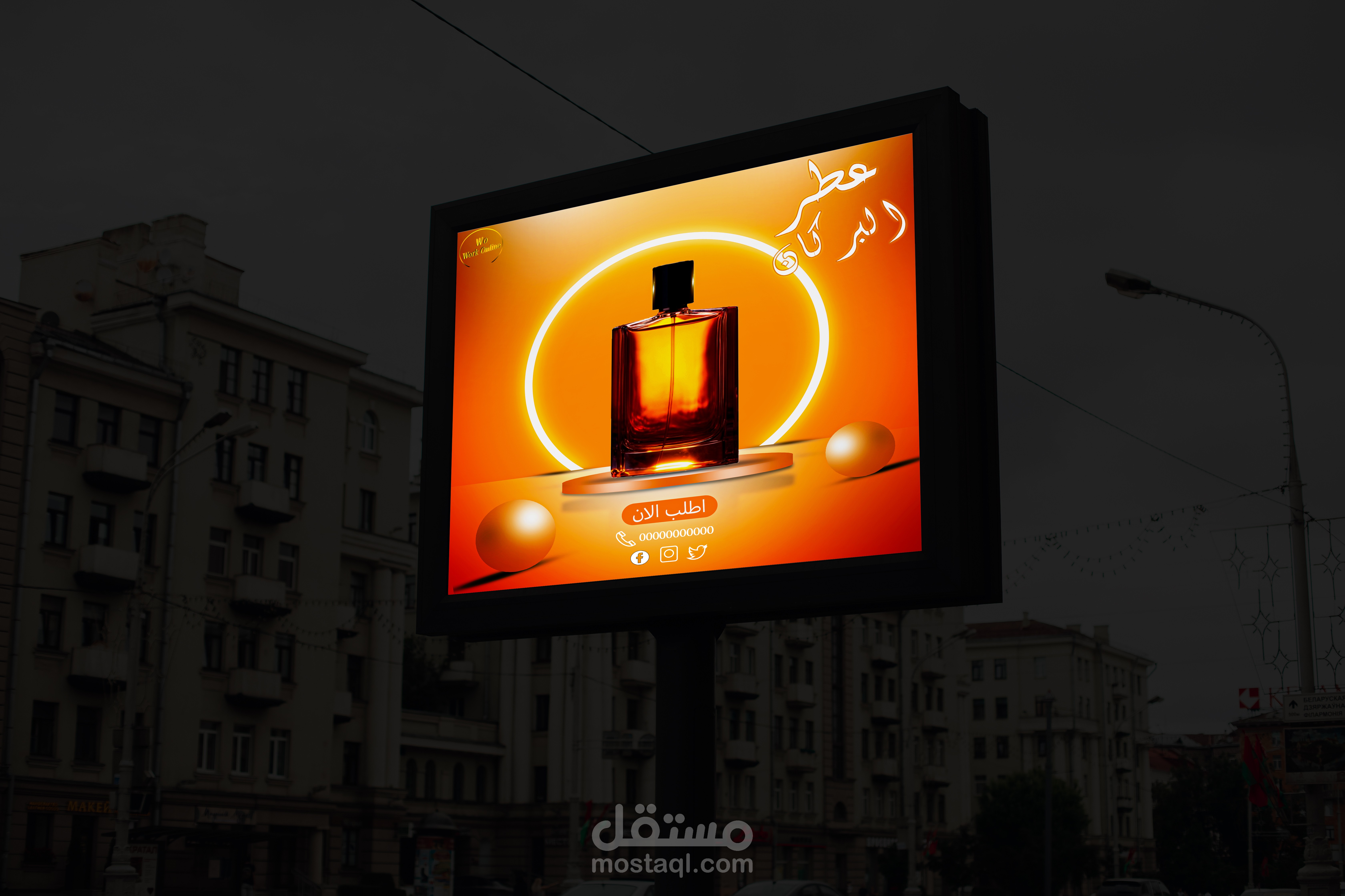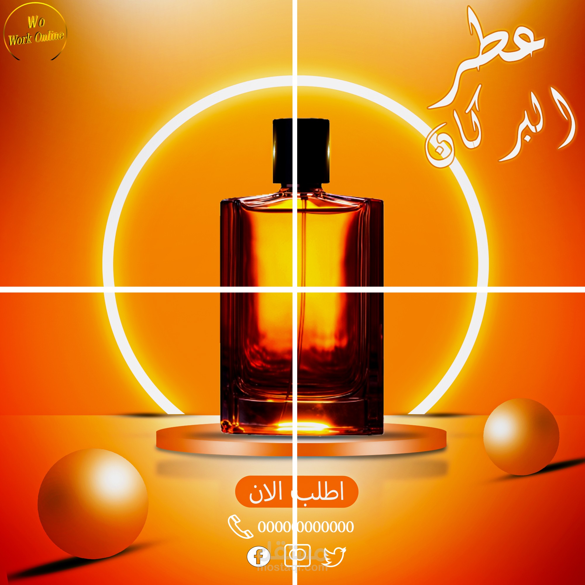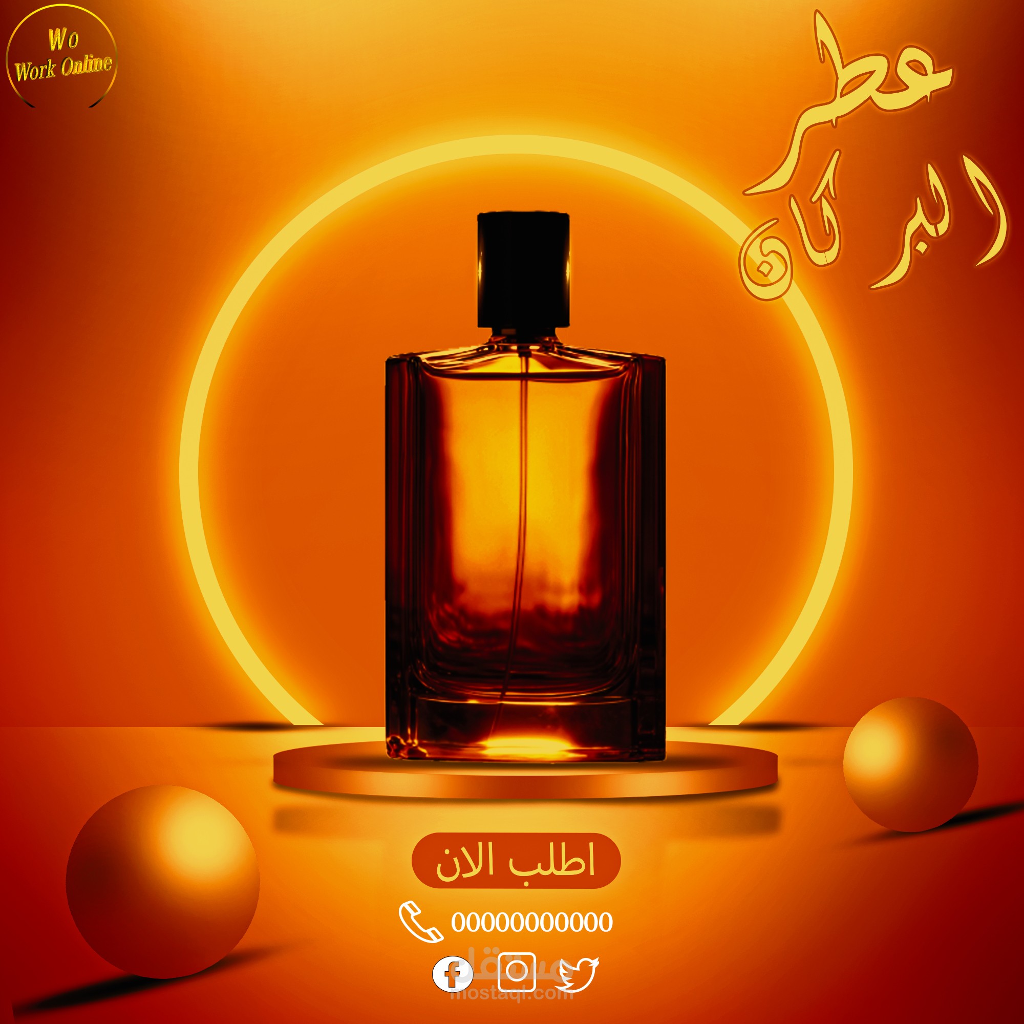 This design features a luxurious perfume bottle with a warm orange backdrop, glowing accents, and Arabic calligraphy,
