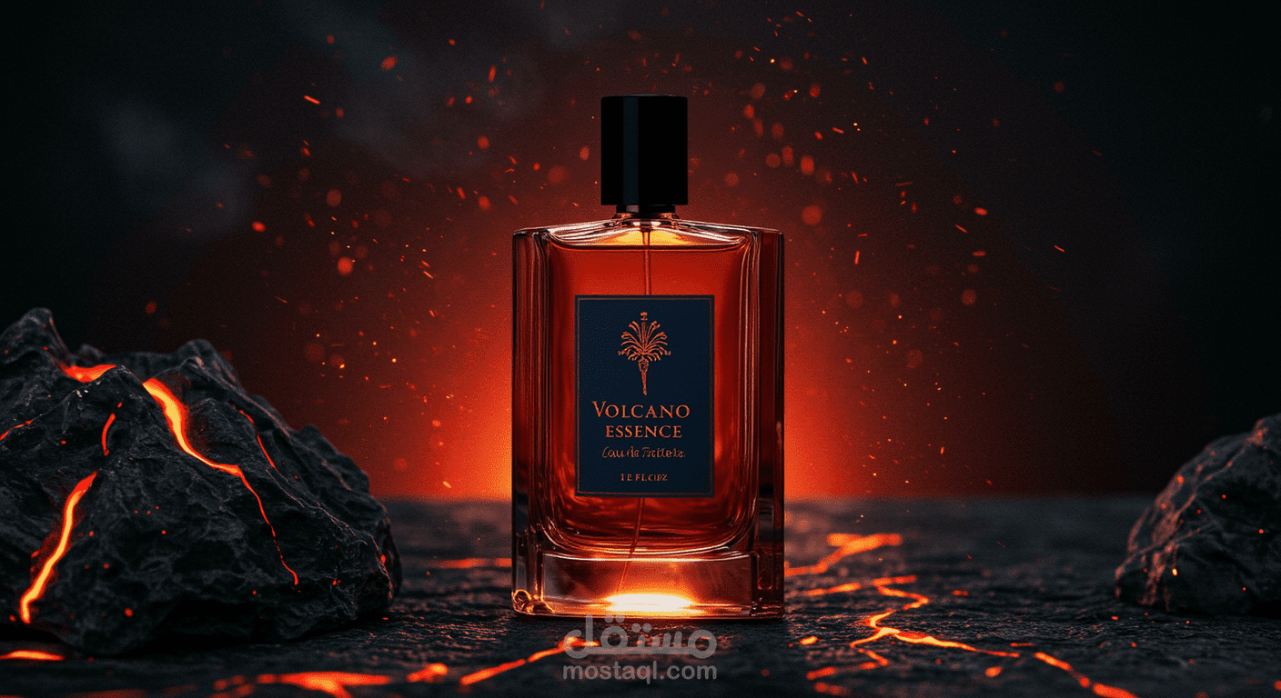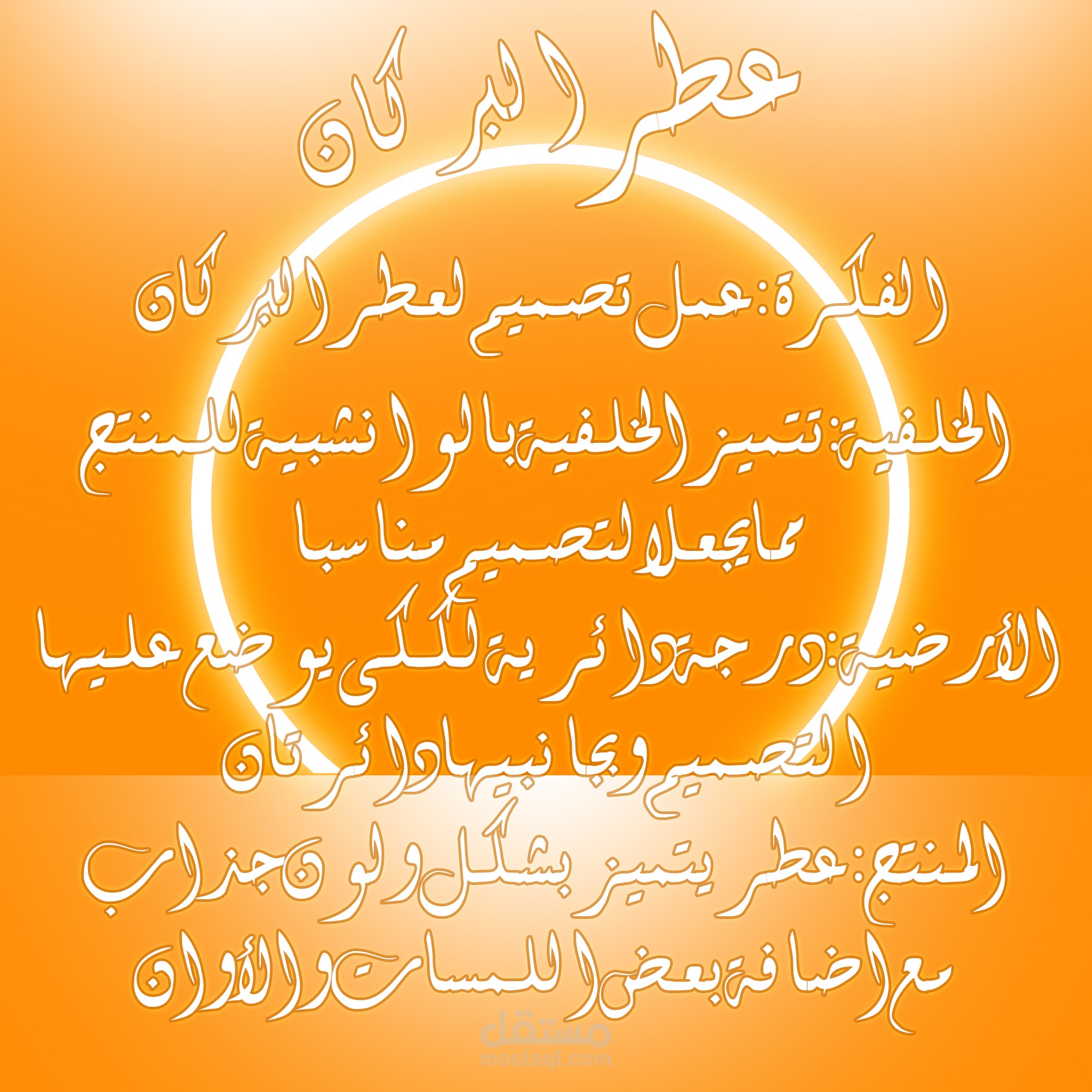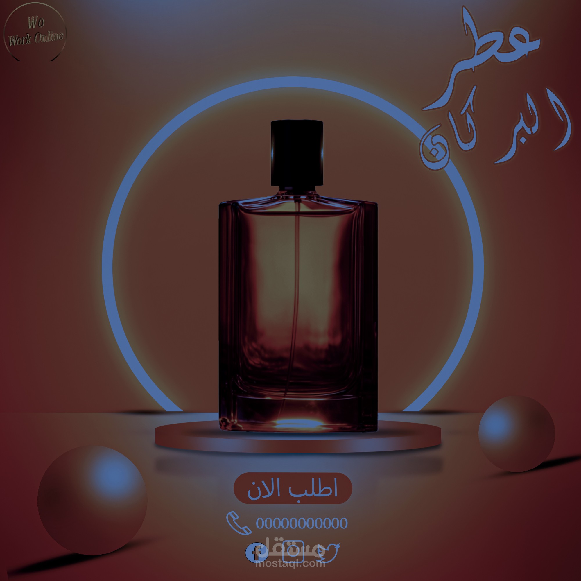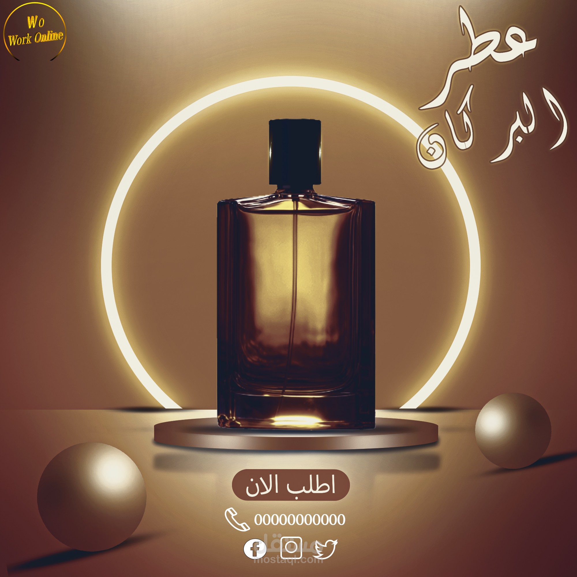 This design features a luxurious perfume bottle with a warm orange backdrop, glowing accents, and Arabic calligraphy,