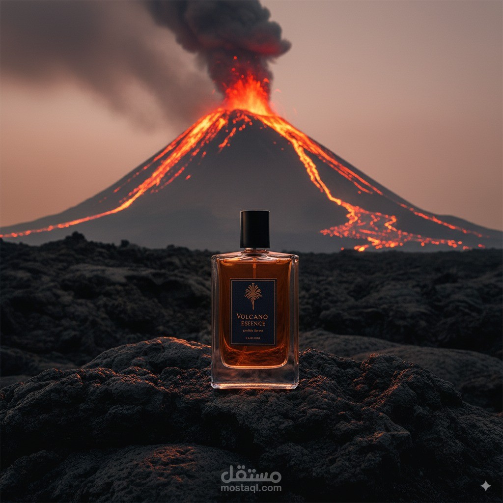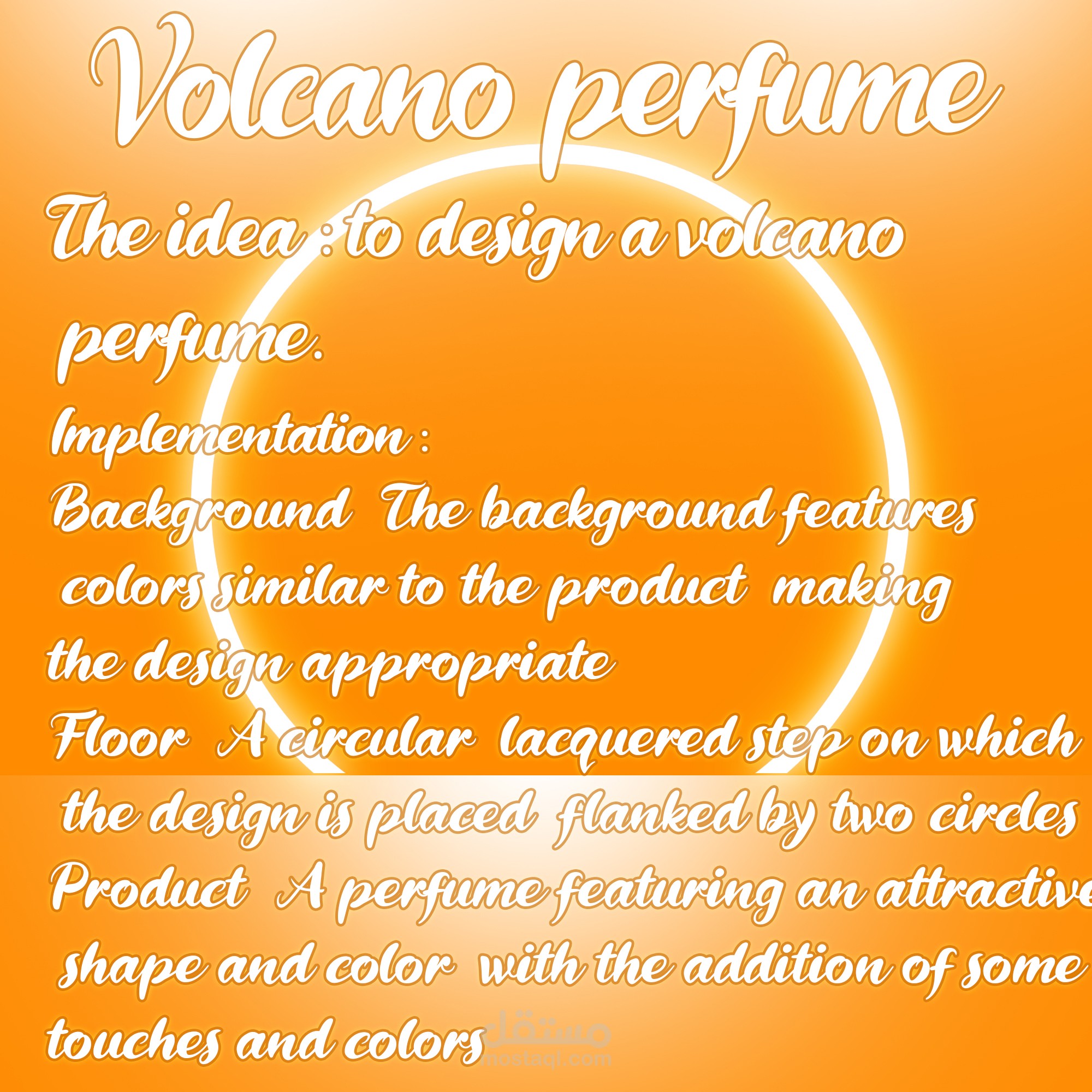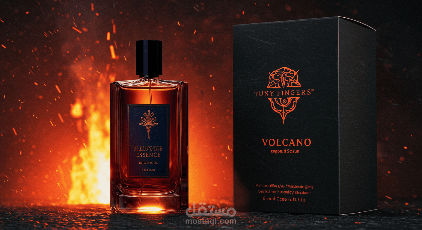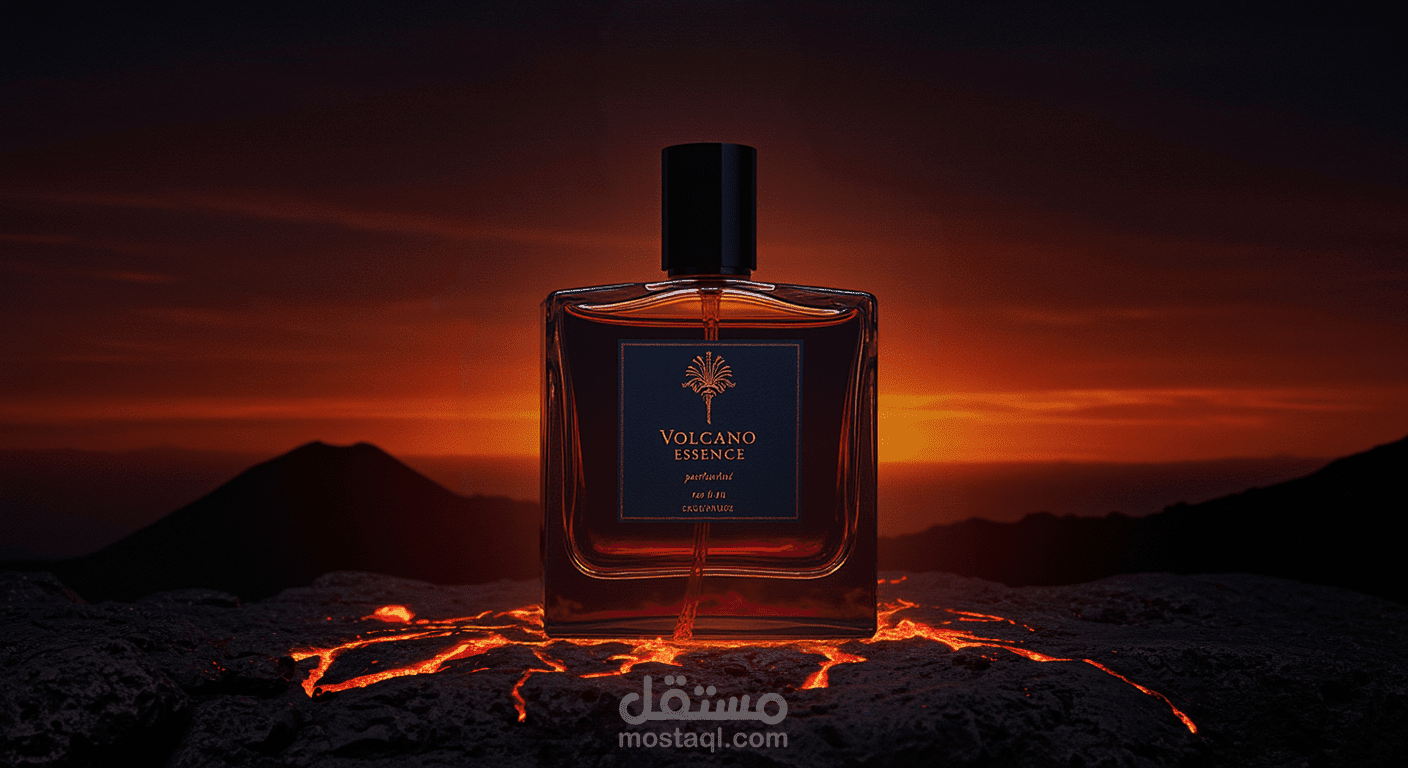 This design features a luxurious perfume bottle with a warm orange backdrop, glowing accents, and Arabic calligraphy,