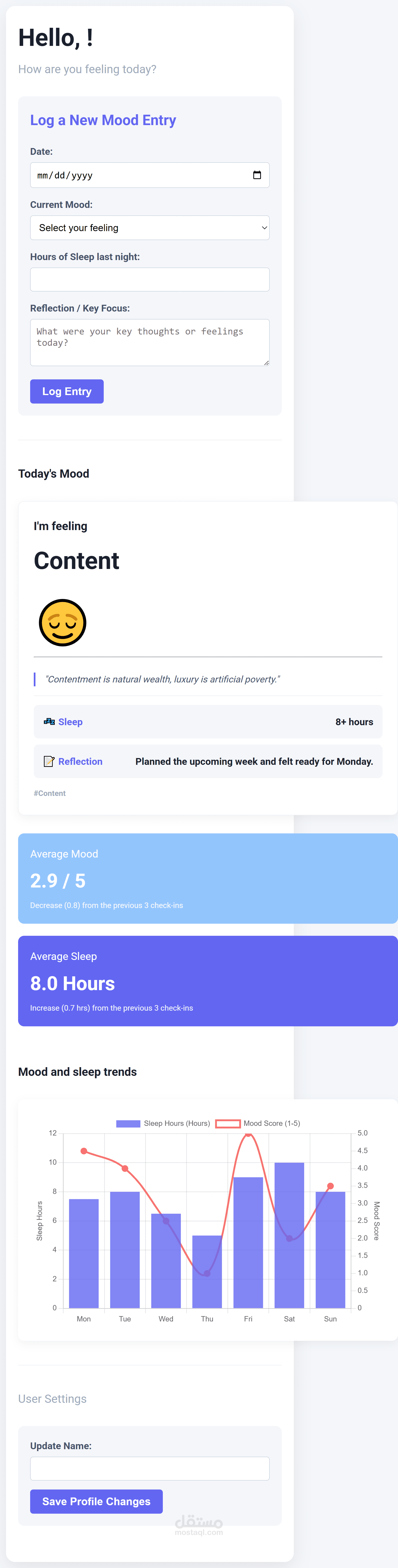 Log their mood, feelings, reflections, and sleep each day