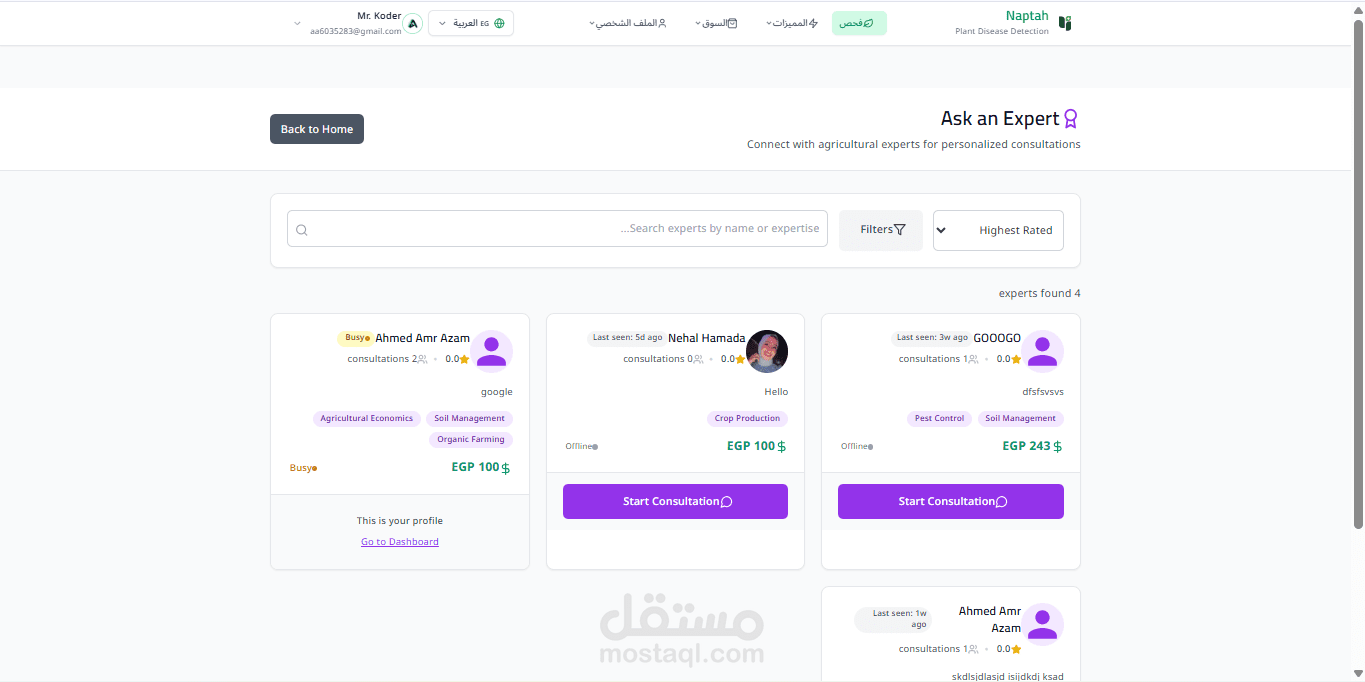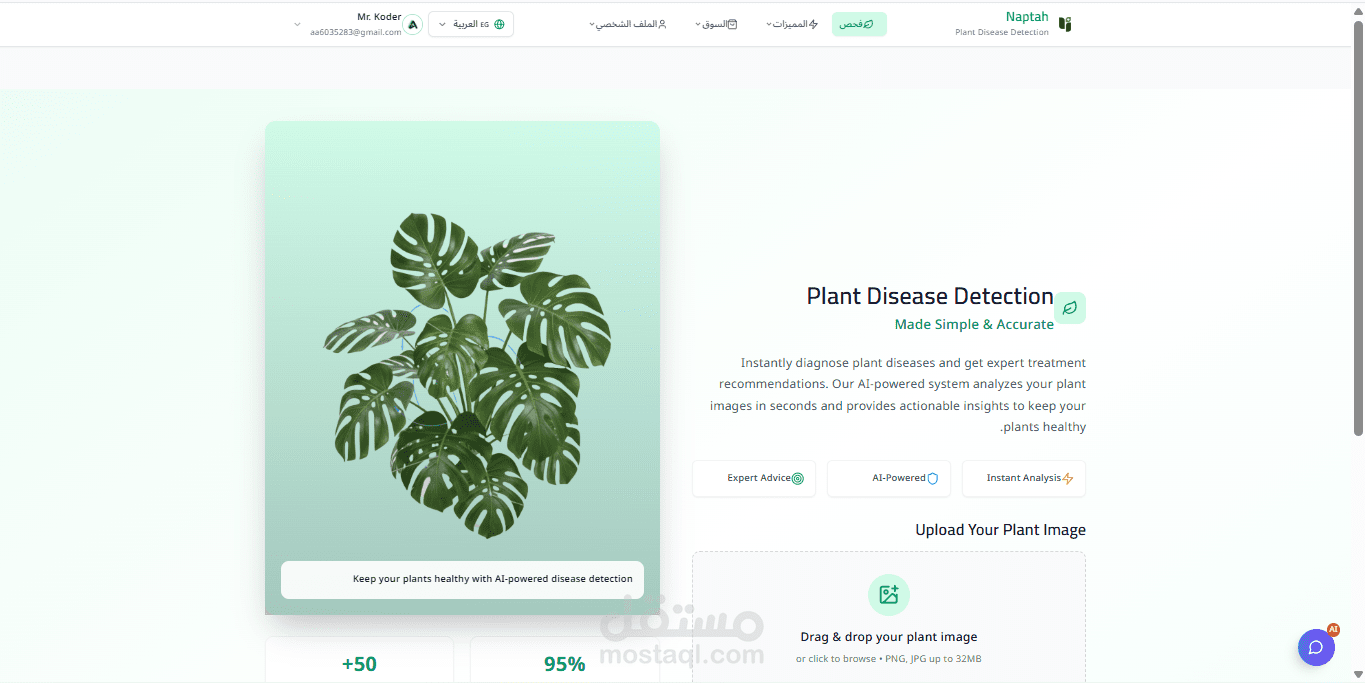 برمجة وظائف المعالجة الخلفية لمعالجة الصور المُحمّلة، وتمريرها عبر نموذج التشخيص لتحديد نوع النبات، وكشف المرض بدقة عالية (تصل إلى 95%) من بين أكثر من 50 مرضًا مختلفًا.