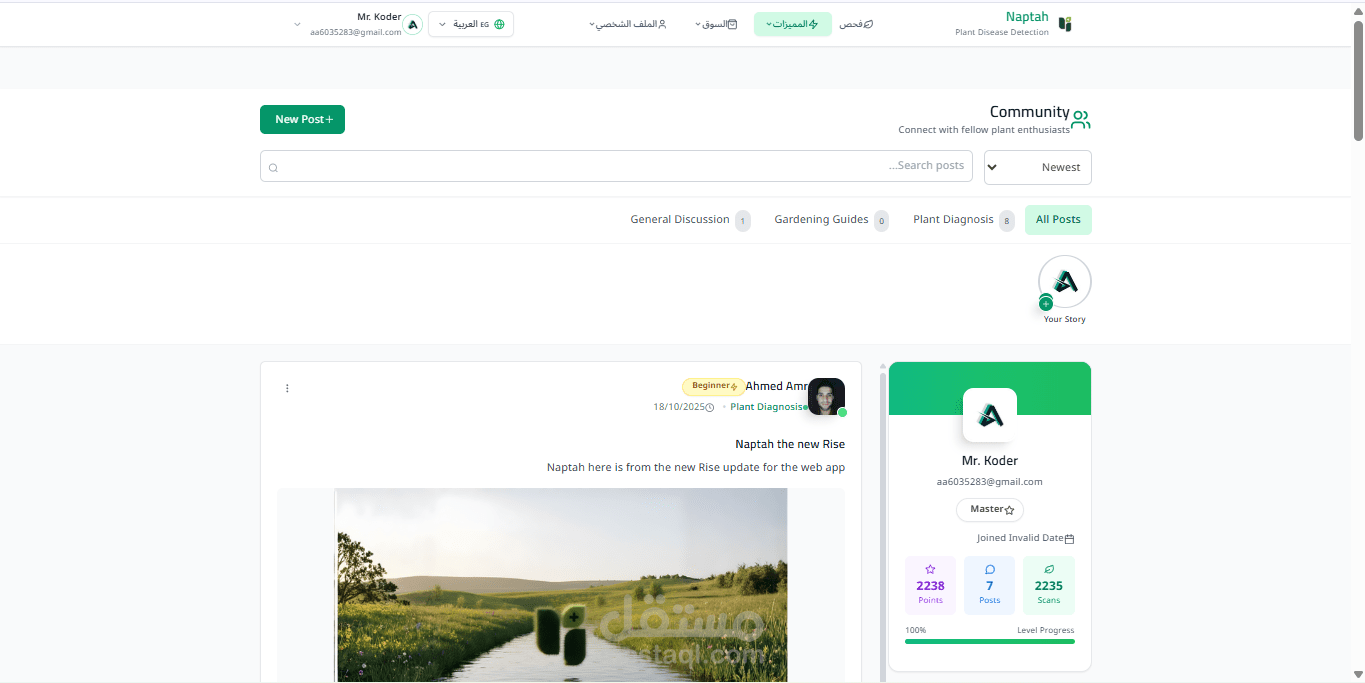 محتوى أقسام المجتمع (منشورات، أسئلة، إجابات، نقاط السمعة).