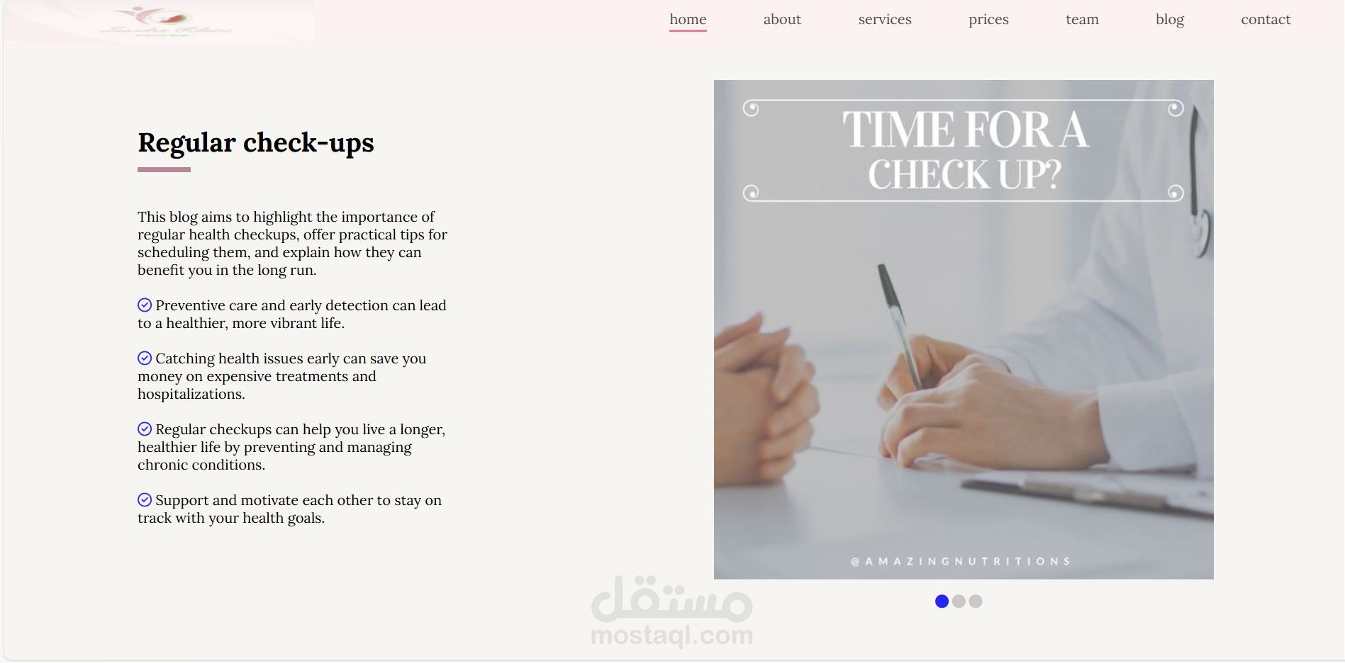 قمت بتطوير موقع ويب بعنوان Life Style Healthy باستخدام HTML وCSS بدون أي مكتبات أو أُطر عمل. الموقع عبارة عن صفحة واحدة تحتوي على عدة أقسام منظمة مثل Home، About، Recipes، Team، Blog، Contact، بهدف عرض محتوى متعلق بنمط الحياة الصحي، وصفات غذائية، وتوعية رياضية.