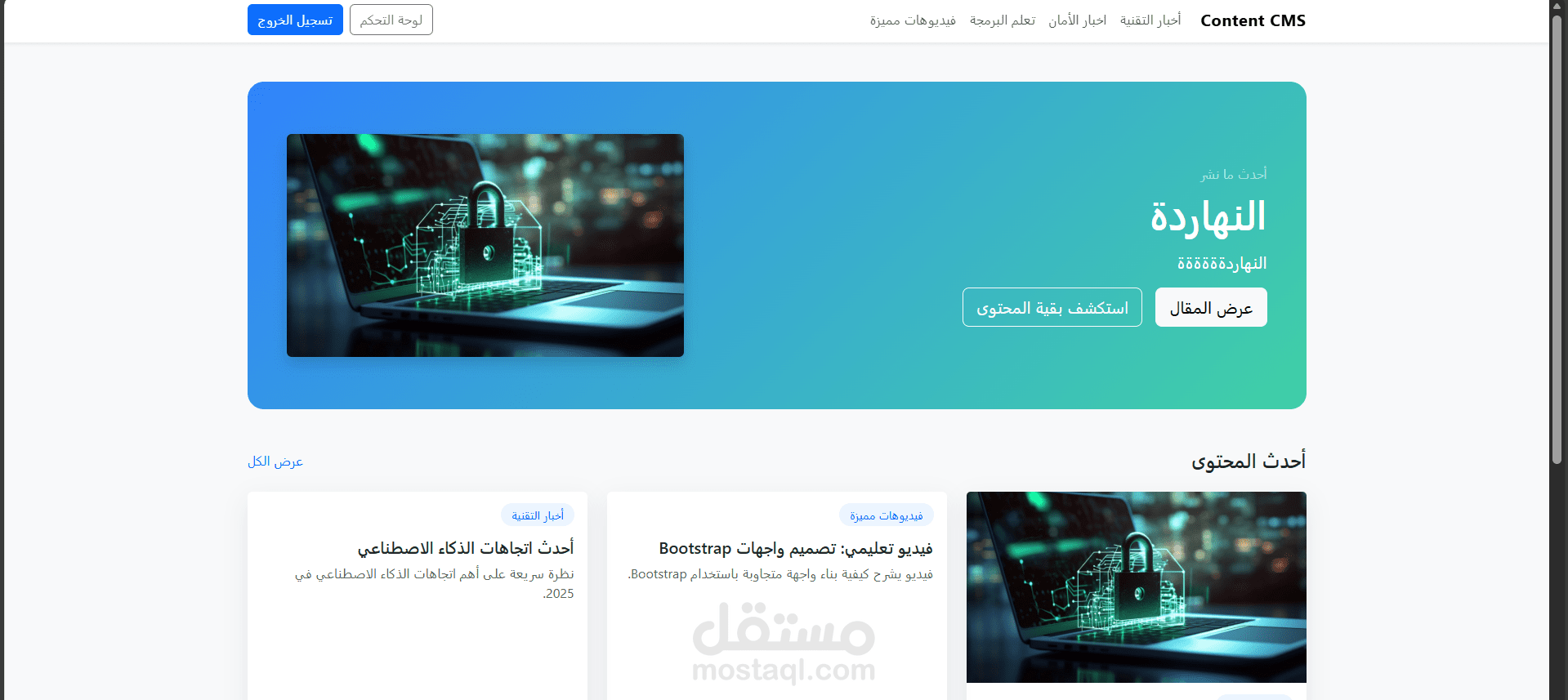 تم تطوير منصة ويب متكاملة وتفاعلية تهدف إلى تسهيل عملية إدارة المحتوى الرقمي (مقالات وفيديوهات) وإدارة بيانات المستخدمين بكفاءة وأمان. يجمع المشروع بين واجهة أمامية عصرية ومتجاوبة، ونظام خلفي (Backend) قوي يضمن حماية البيانات وسرعة المعالجة.