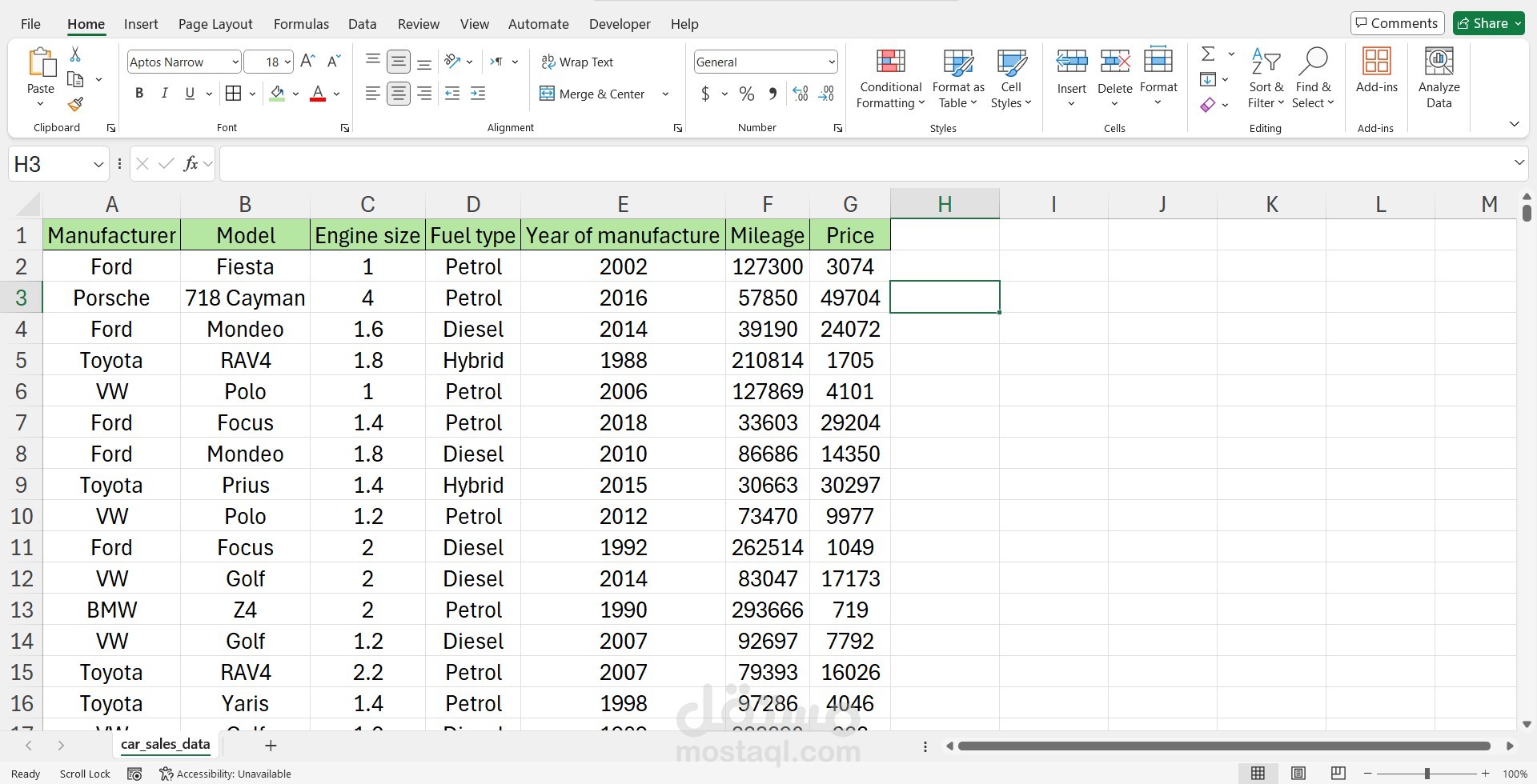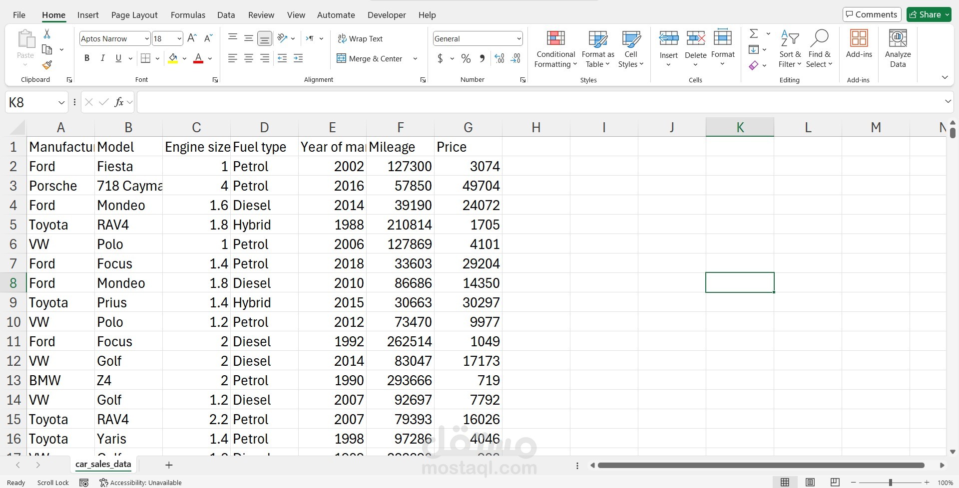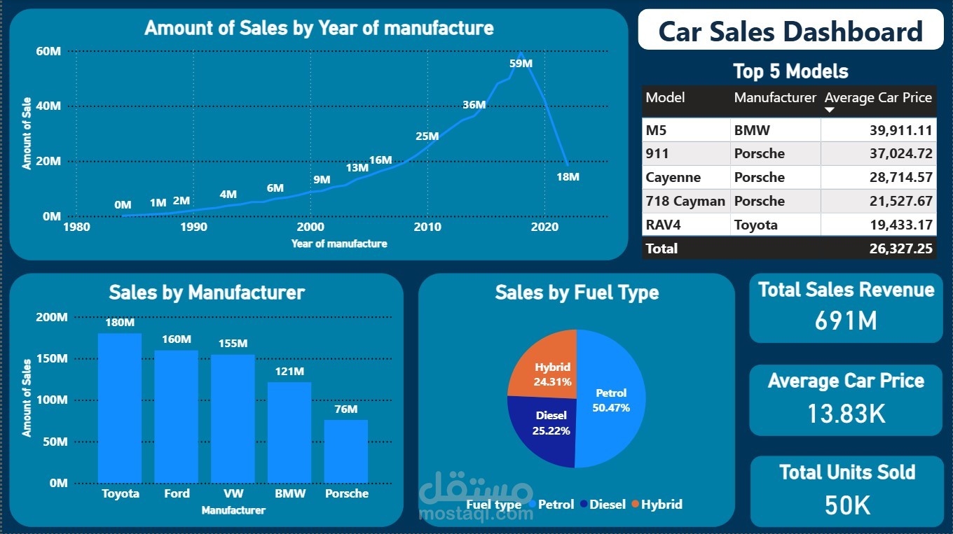 I developed an interactive dashboard to analyse 50,000 car sales records. The dataset includes information about manufacturers, models, fuel types, engine sizes, year of manufacture, mileage, and price.